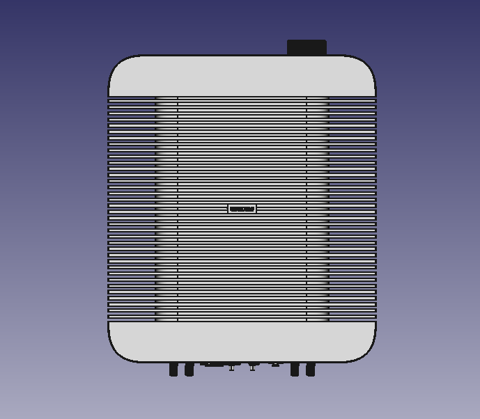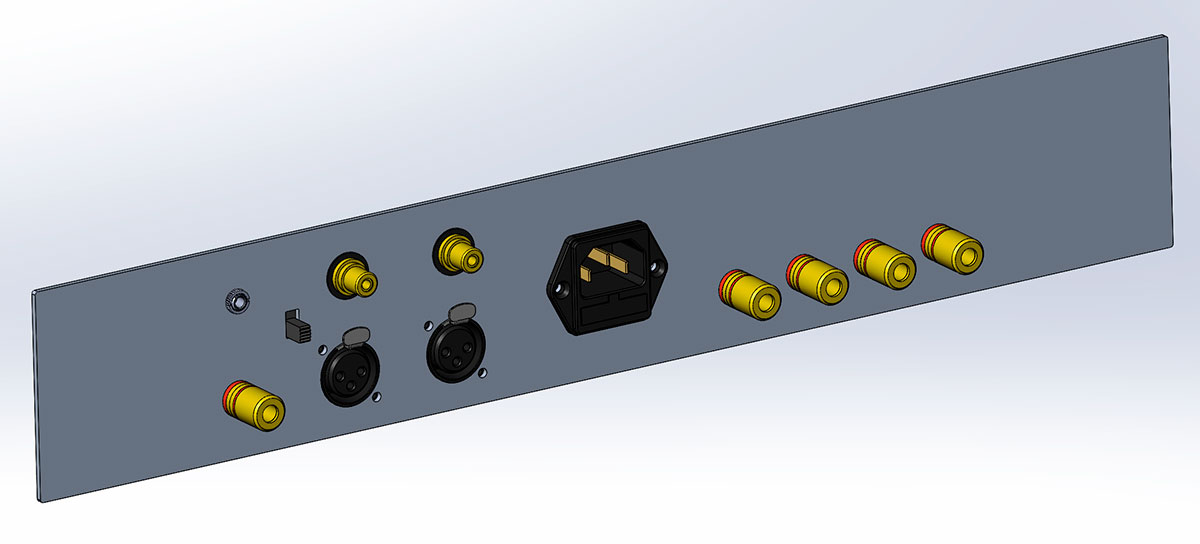 Это полноформатный усилитель, его габариты — примерно 435x400x180 мм (размеры можно немного изменить в процессе разработки). Одно из основных требований — у корпуса должно иметься внешнее оребрение для отвода 600 Вт тепла, которое будет выделяться в процессе его работы.