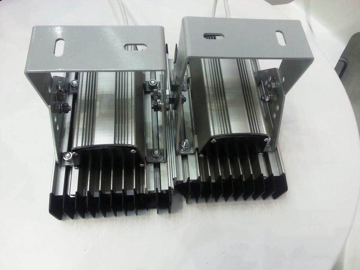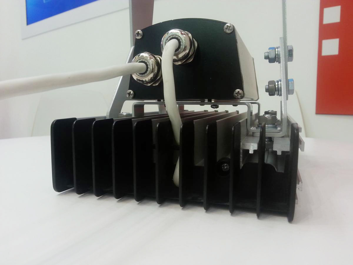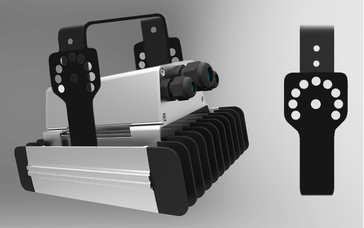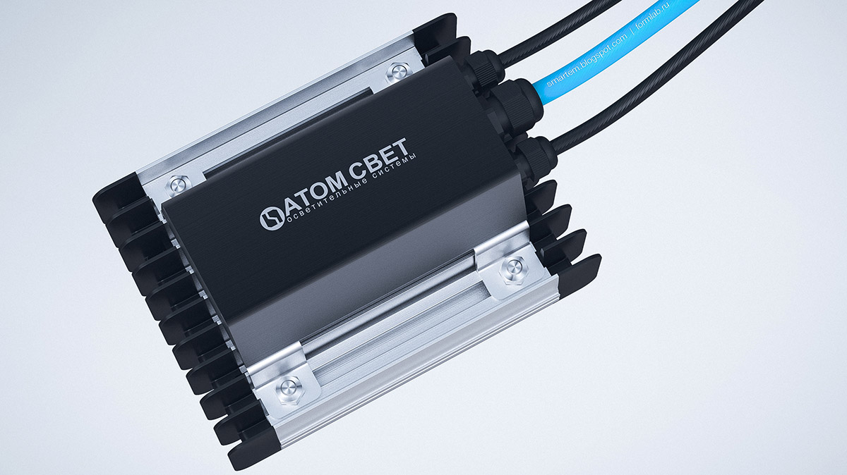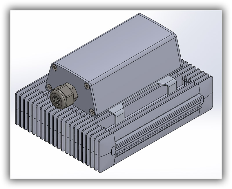 После борьбы за хорошую теплоотдачу, надёжные и удобные пазы для креплений, размещение гермовводов и прочее получается вот такая модель (заодно попросили добавить и скобу для крепления):
