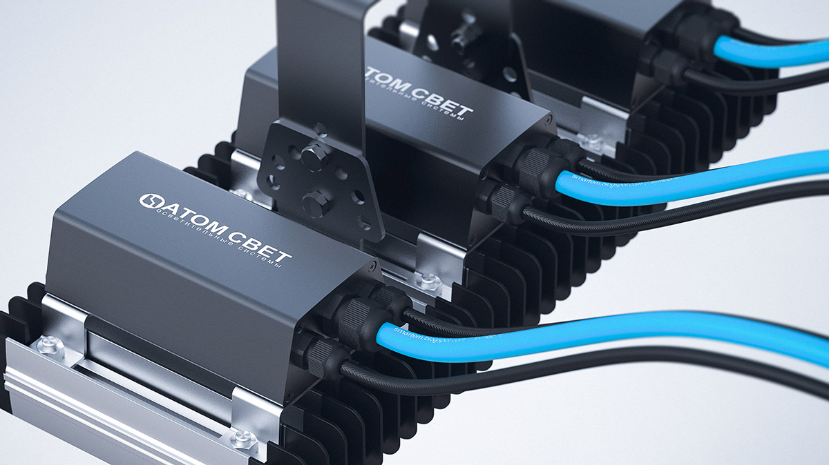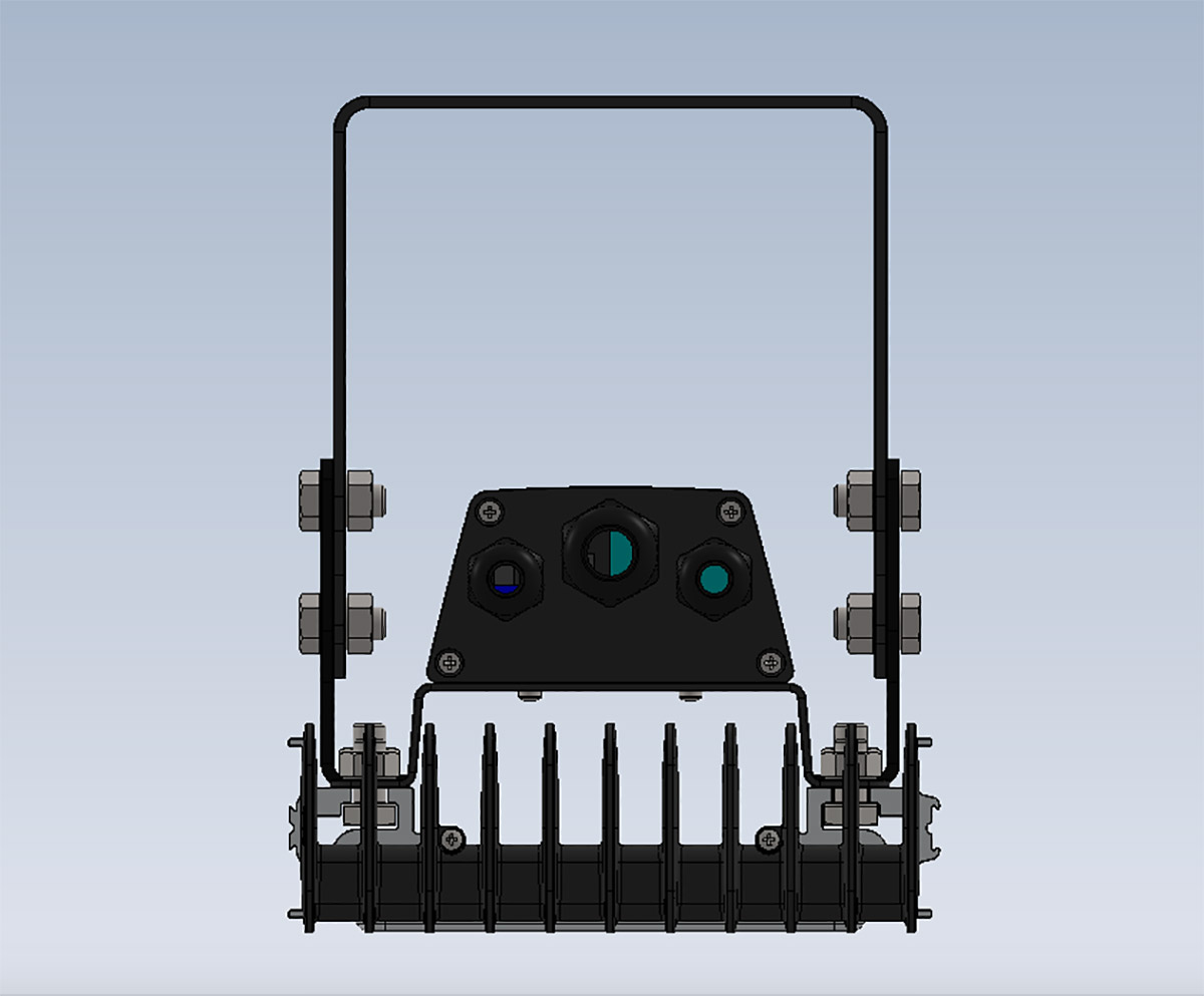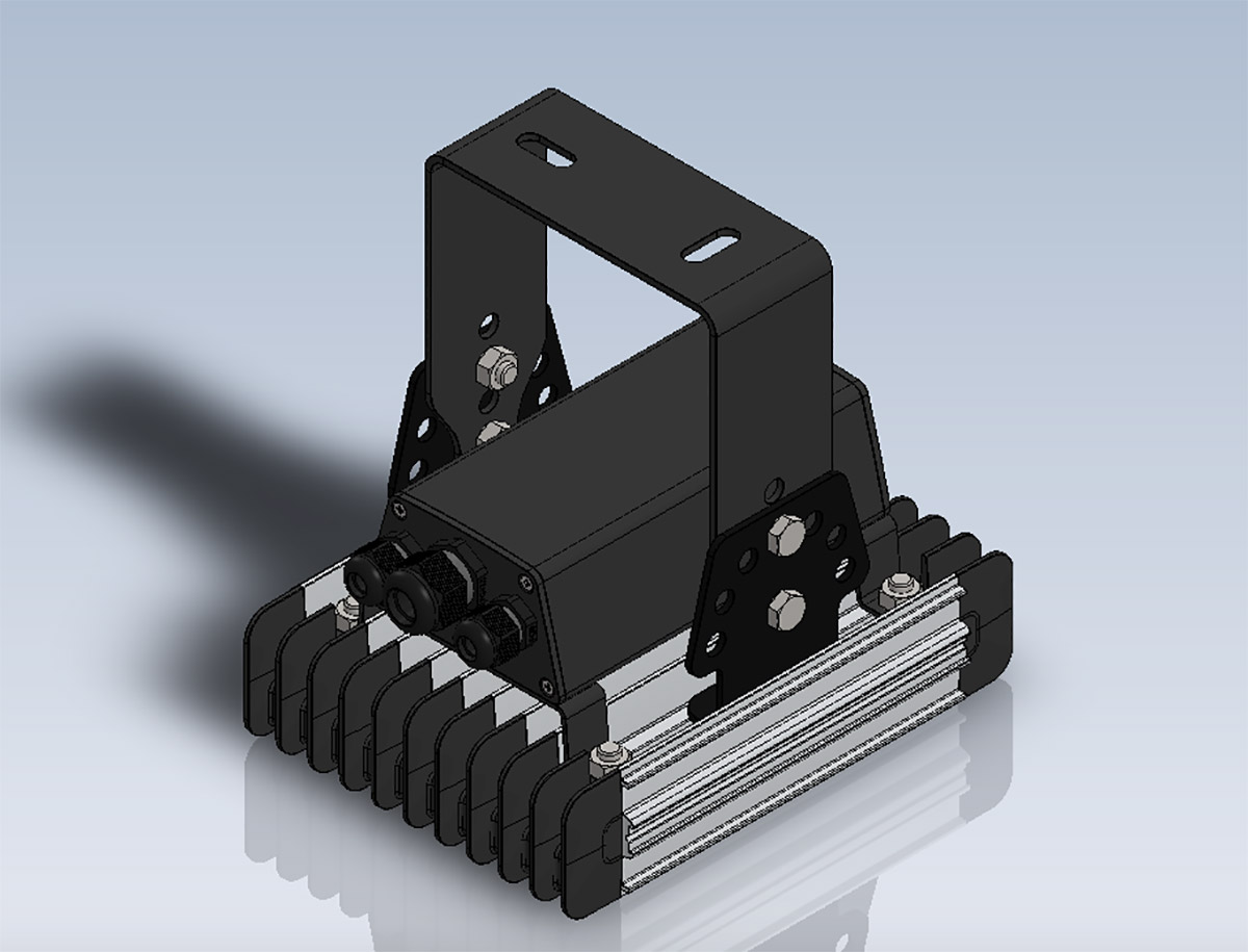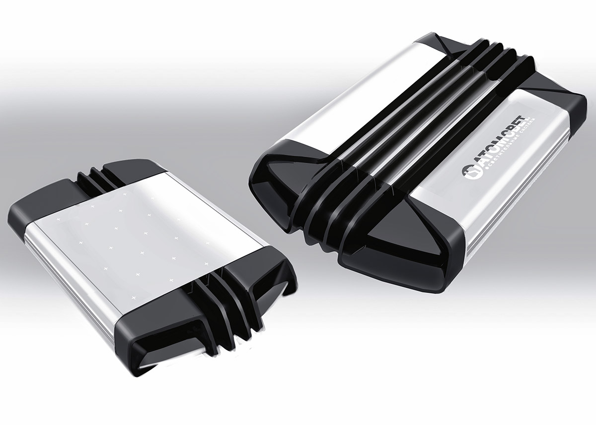 После борьбы за хорошую теплоотдачу, надёжные и удобные пазы для креплений, размещение гермовводов и прочее получается вот такая модель (заодно попросили добавить и скобу для крепления):
