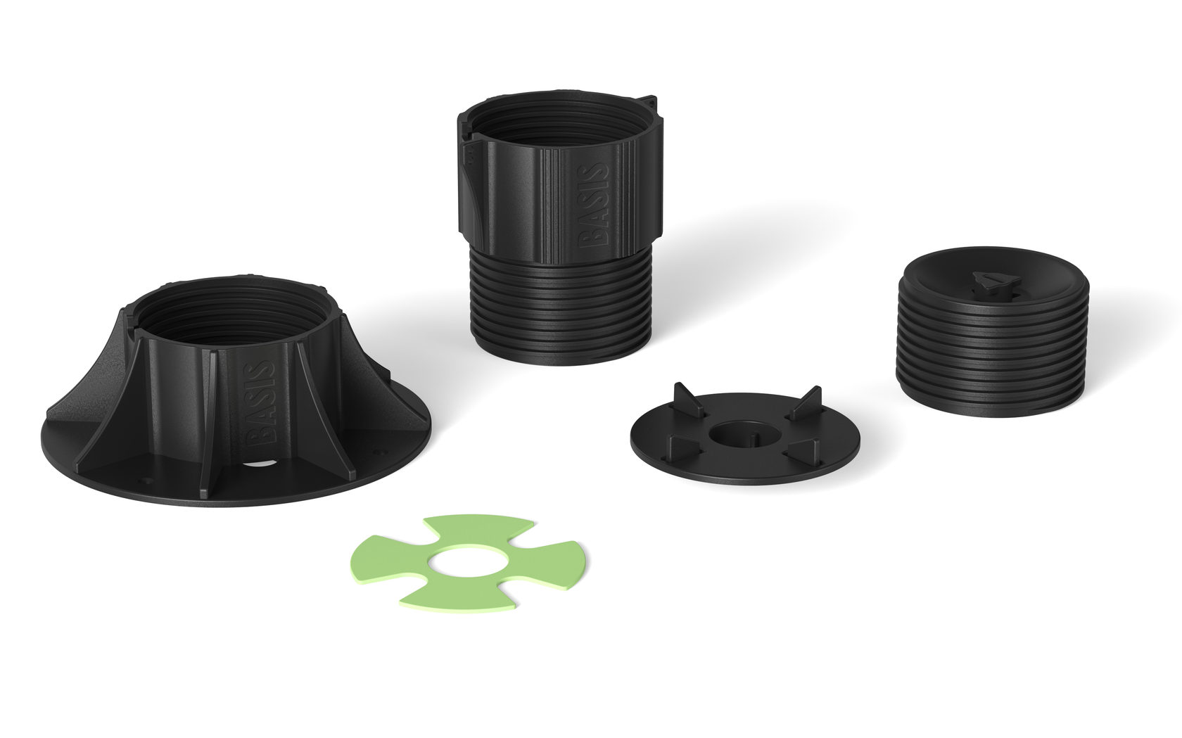 Состав опоры — это основание, вершина, винтовая муфта для регулировки, если нужно — удлинительная проставка. Оснований и вершин в системе несколько. Первые отличаются по высоте; вторые могут автоматически компенсировать угол наклона и тоже бывают разными — для нескольких типов покрытий, от керамической плитки до строительных лаг.