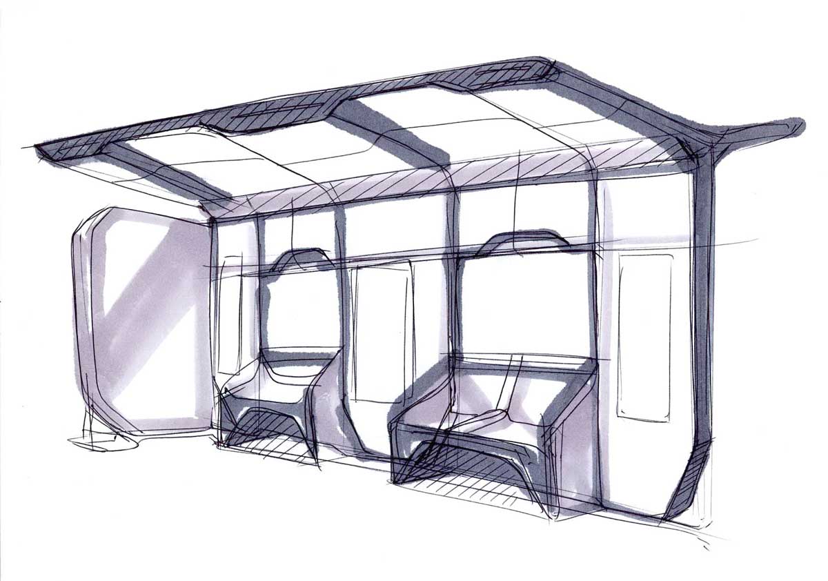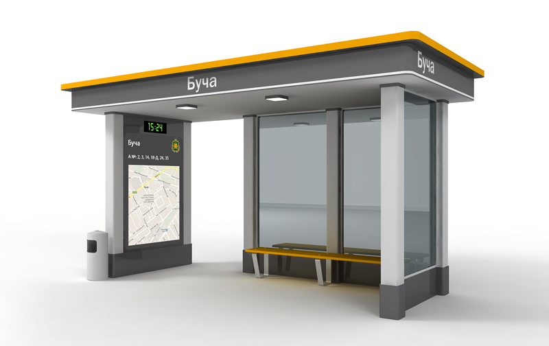 Это не только остановка, но и точка продаж: под металлическим навесом стоят скамейки для пассажиров, а рядом с ними — несколько вендинговых автоматов. Нам нужно создать дизайн-концепт остановки, без детальной проработки.