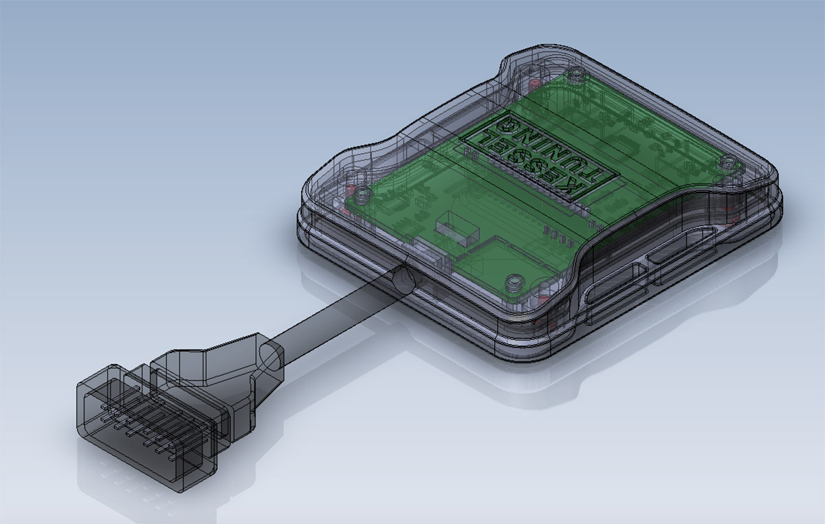 Первое из двух устройств для перенастройки параметров двигателя автомобиля (ещё одно — здесь). Устройства парные, одно из них подключается к датчикам двигателя и размещается под капотом, второе связано с электронной педалью газа и закрепляется в салоне. Модуль, расположенный в салоне, передаёт вводные подкапотному по радиоканалу. Несмотря на то, что система, по сути, одна, каждое из этих устройств мы разрабатывали отдельно.
