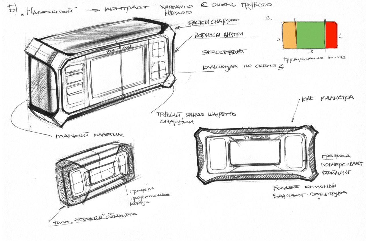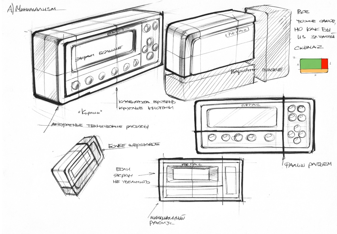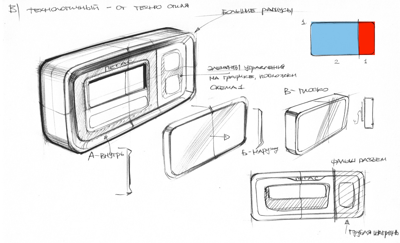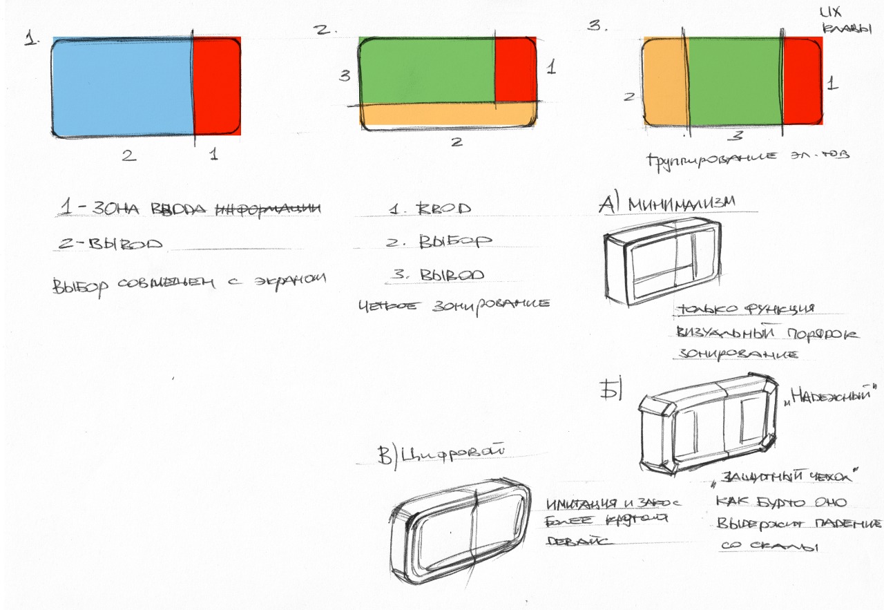 Сначала эскизы. Стилистика — «минимализм», «надежный» и «технологичный».