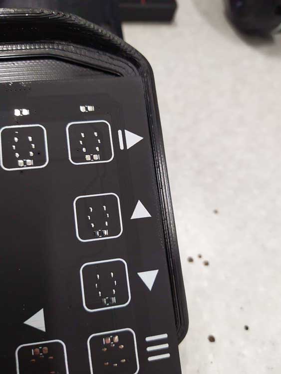 Ещё раз распечатали и продолжили доработку: сделали на передней крышке прямые углы по периметру для клавиатуры, одновременно слегка увеличили глубину выборки под клавиатуру, на задней крышке добавили выступ с углублением (для площадки кронштейна) и определили место для наклейки с серийным номером.