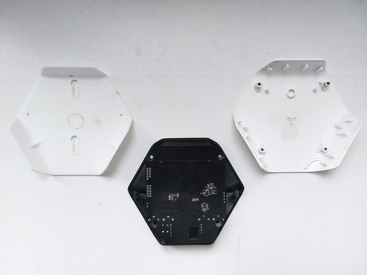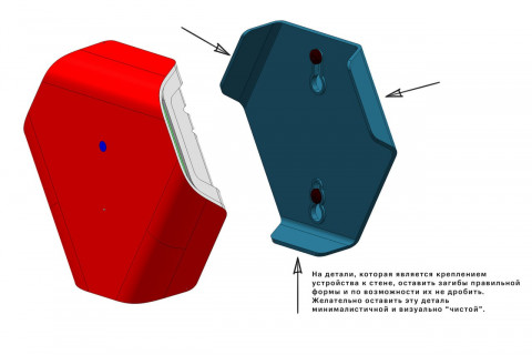 | Что нужно сделать? Задачи | 1. Состав корпуса: лицевая крышка и две задние стенки (внутренняя и стенка-основание для крепления к стене). 2. От отдельного отсека для элементов питания отказались (сильно увеличится толщина корпуса). Но доступ к расположенным на плате батарейкам у пользователя все равно должен быть. А вот к остальной начинке — ни в коем случае. 3. На задней стенке нужно предусмотреть разные варианты крепления: проушина/ на прорез, петельки, скотч двухсторонний/велкро. 4. Передняя стенка для устройства с датчиками шума и света играет роль отражателя, рассеиватель выполняется из пластика молочного оттенка, — нужно подобрать материал. 5. В корпусе должна быть перфорация. Чем больше, тем лучше: воздуху нужно свободно проходить через всё устройство. Однако перфорацию придется как-то закамуфлировать или вообще скрыть от пользователя. 6. Хитрая маркировка, незаметная снаружи. Дело в том, что в «изначальной» версии датчика наклейка часто оказывалась мокрой (даже несмотря на то, что в руководстве по эксплуатации устройства не рекомендовалось использовать его в условиях повышенной влажности). Поэтому сейчас ее придется прятать подальше. 7. Нужна ненавязчивая индикация — индикатор будет светиться только при первичной настройке датчика. 8. Разумеется, требуется кнопка включения/выключения. 9. Предстоит определить, как будет реализован батарейный отсек на 4 щелочных батарейки. 10. В составе прибора — антенна и разнообразные датчики. Для каждого элемента есть свои требования и ограничения по размещению. 11. Сборка — на многоразовых защелках (спойлер: в процессе разработки все немного изменилось). 12. Можно немного увеличить корпус. Но — в рамках дизайна, и чем меньше будут его габариты, тем лучше |
