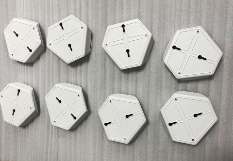 | Решения и объем работ | 1. Разработали два варианта конструкции. 2. Работали в связке с разработчиками платы (точнее, двух плат — для двух устройств). 3. Сделали прототип и организовали производство предсерийных образцов и установочной партии. 4. Как итог: выполнили все требования, придумали, как изолировать батарейный отсек от электронных компонентов, нашли хорошее место для наклейки, реализовали магнитное крепление основного корпуса датчика к стене. Оценили серийное производство с тиражом в несколько тысяч штук — уже по другой технологии. |