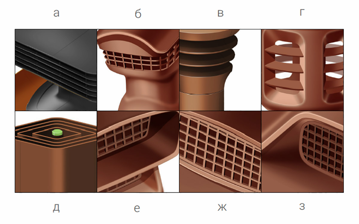 Делаем дизайн кровельных аксессуаров. Это два кровельных точечных вентиля (КТВ, они же — аэраторы) — большой производительности и малой, — плюс два вида вентиляционного выхода: без утеплителя («Труба») и с ним («Труба Плюс»).
