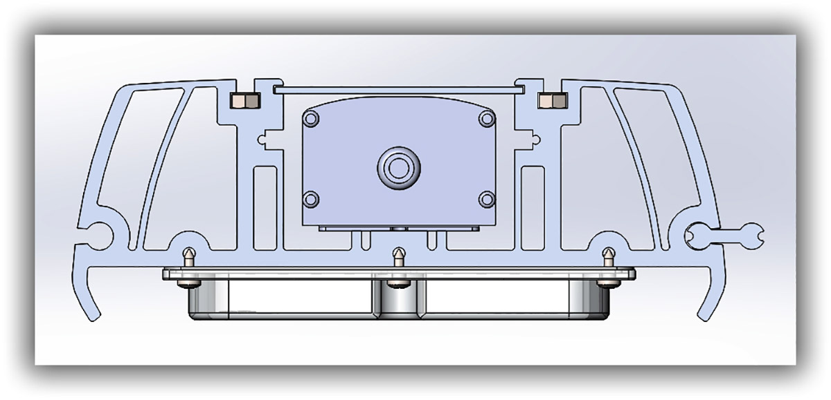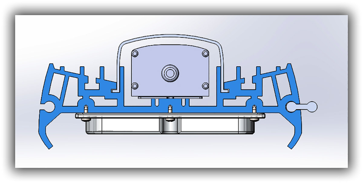 Корпус выполнен из алюминиевого профиля, под уже существующую электронную начинку, торцевые крышки — из пластика, в расчёте на технологию литья под давлением.
