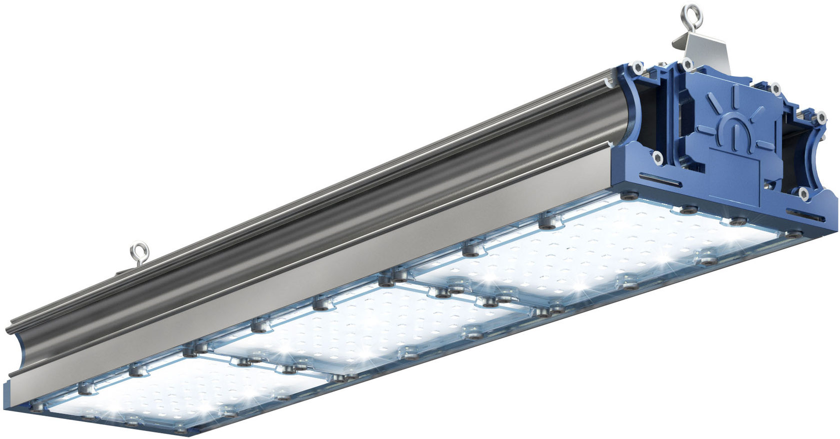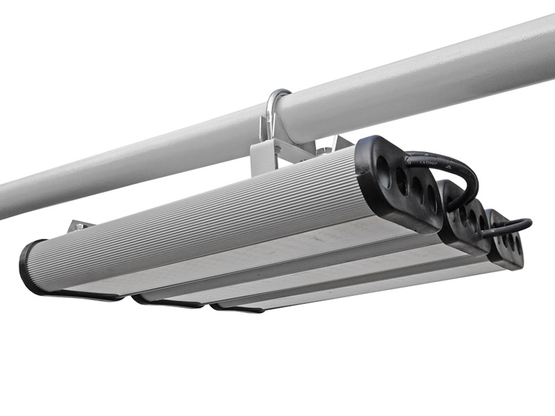 Показатель пыле- и влагозащиты корпуса — IP53. Алюминиевая крышка-труба (и с поворотным механизмом, и без него) должна выдерживать вес до 6 кг, а конструкция подвесного кронштейна — и того больше, до 18 кг (ведь на этом кронштейне могут «висеть» и три светильника).