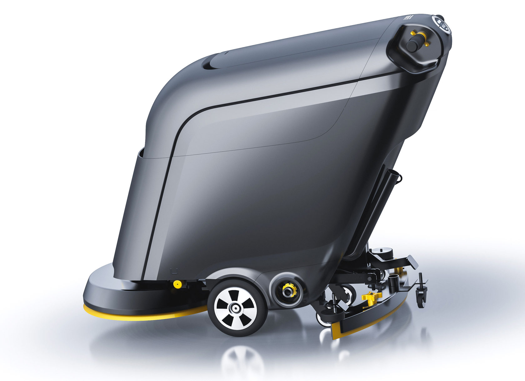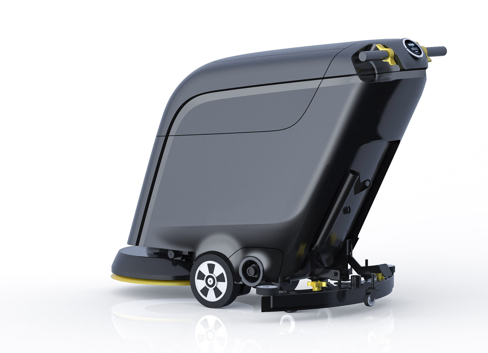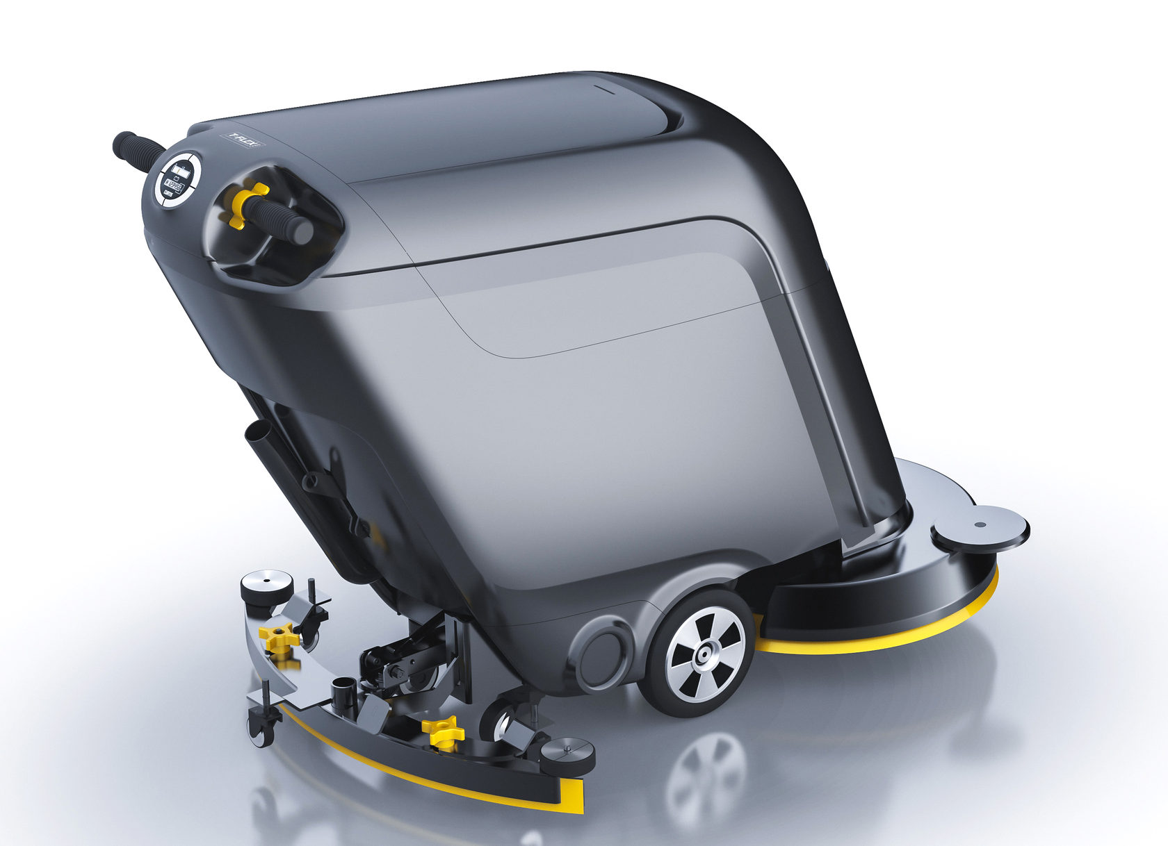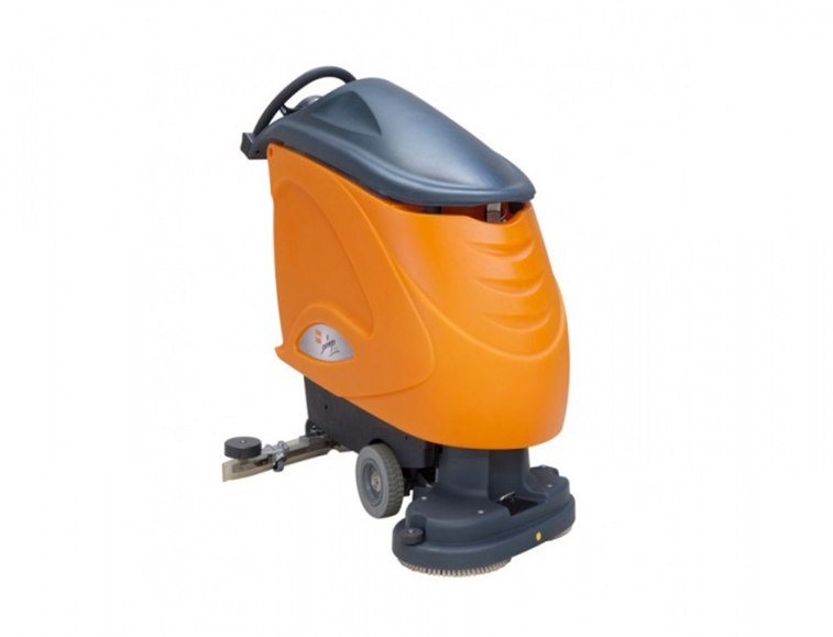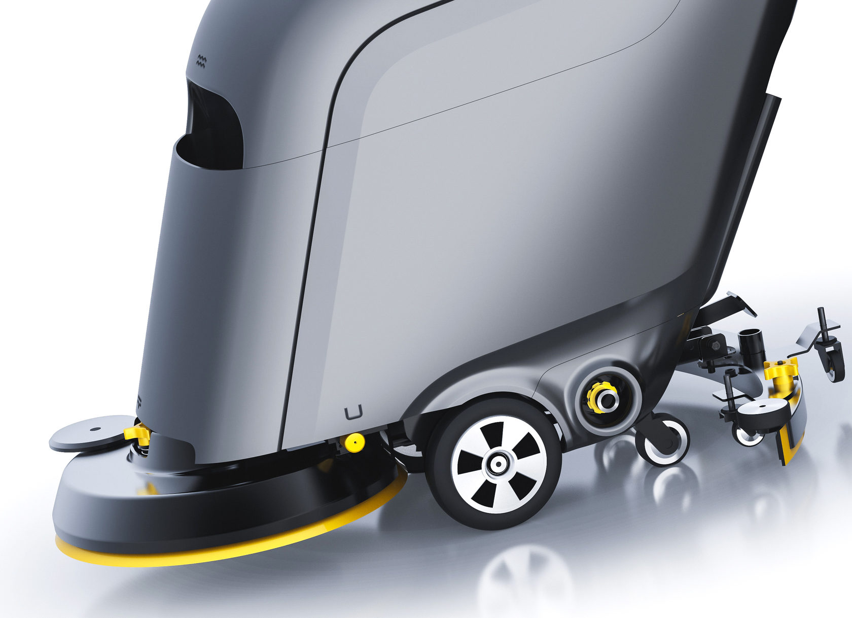 Как работает поломоечная машина? Пол смачивается моющим раствором из одного бака, растирается щёткой, и вся грязь собирается машиной в другой бак. Готово — всё чисто. Корпус защищает оба бака, аккумулятор, мотор, электронную начинку и навесное оборудование. Элементы управления — педаль поднятия щётки, курки на руле «вперед/назад» и «вкл/выкл».