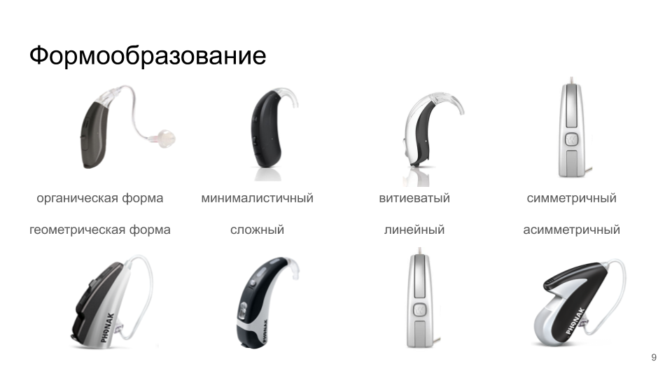 А здесь анализ стал почти самостоятельным этапом разработки и был оформлен в виде отдельного документа — обзора «Стилевые тренды в дизайне слуховых аппаратов заушного типа».