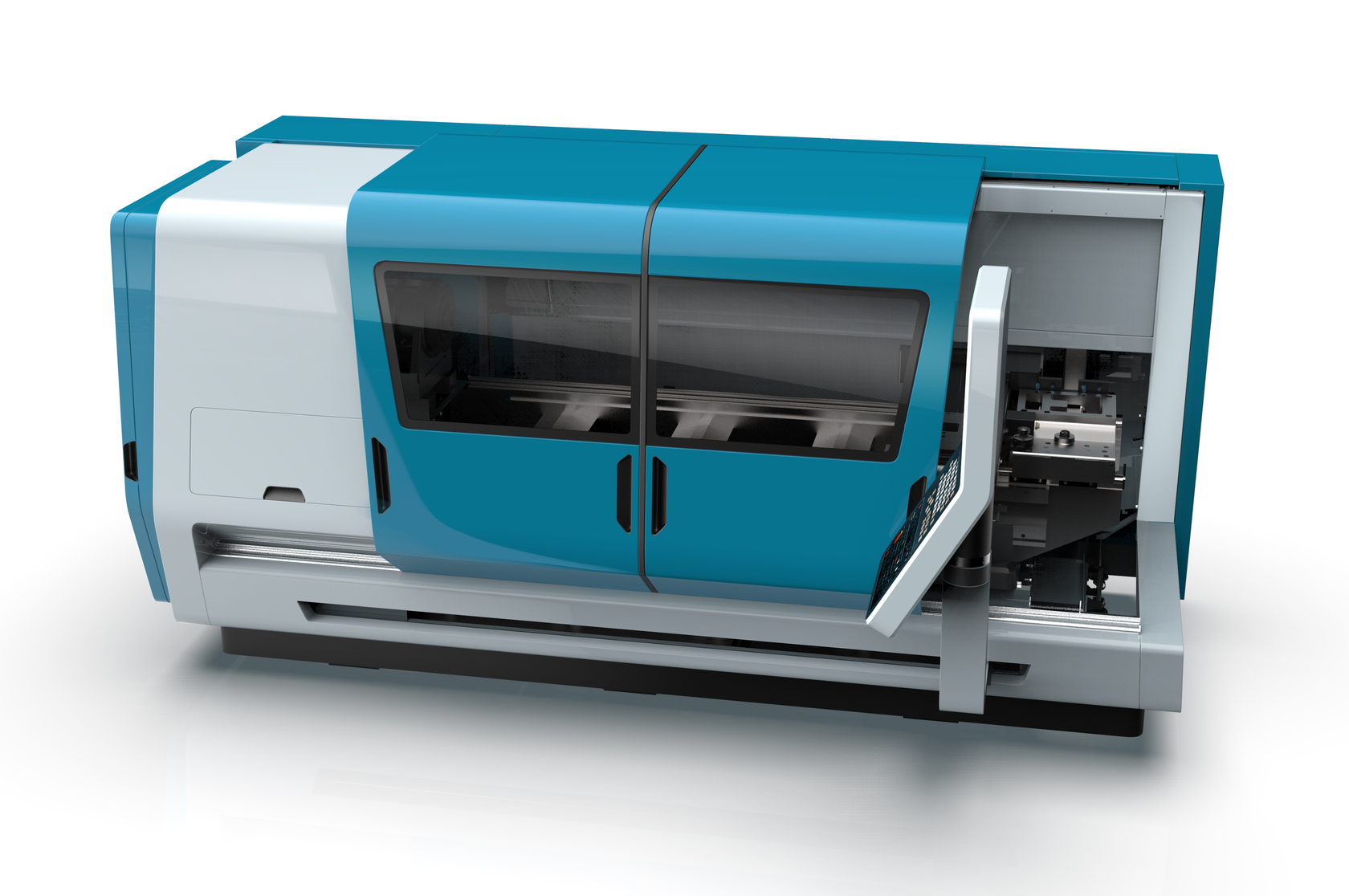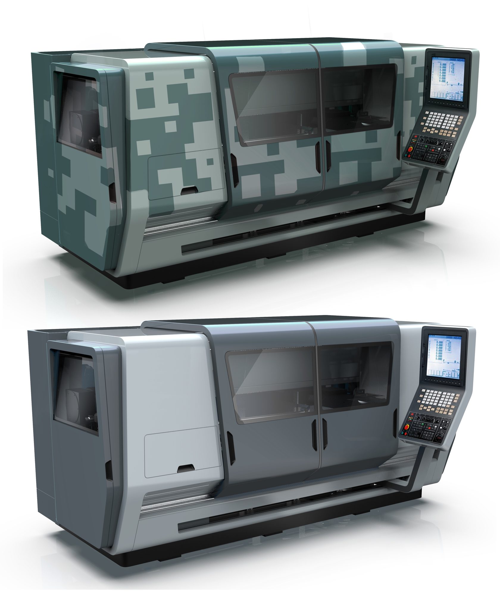 Визуализация требуется в двух вариантах, кабинетном (полностью закрывающим рабочую зону) и полукабинетном (закрывает только зону резания и движущиеся элементы). На рендерах будем показывать ещё одну важную составляющую задания на дизайн — цветовые гаммы. В одних цветах планируется поставлять станок на предприятия нефтегазовой и оборонной промышленности, в других — продавать «гражданским» покупателям.