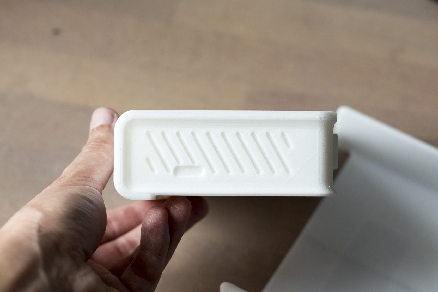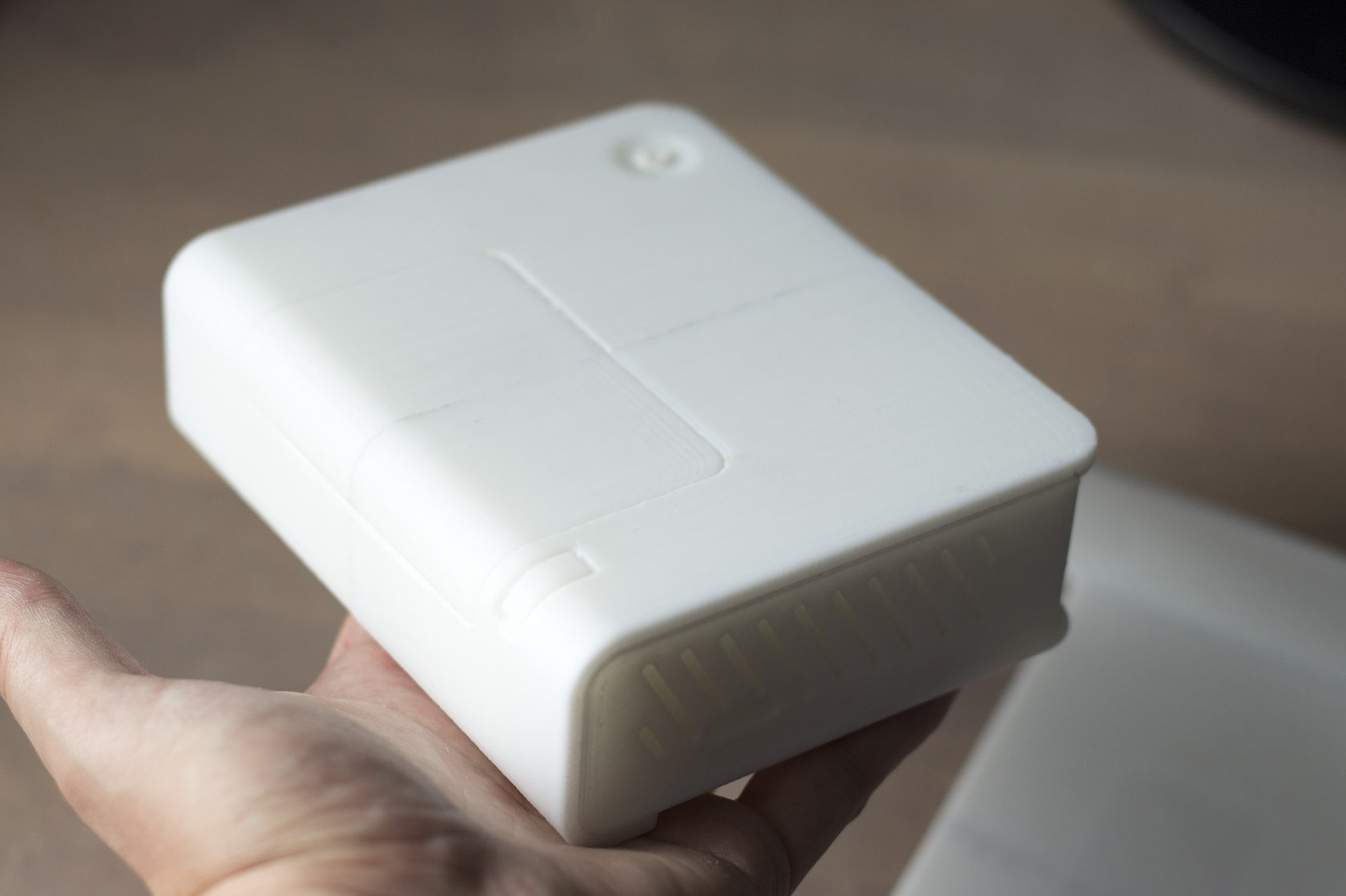 До этого этапа разработка шла относительно гладко — мы полностью сконструировали корпус, заодно продумали систему пассивной вентиляции. Но наступил момент, когда заказчик решил сэкономить. Выразилось это в том, что он выбрал подрядчика подешевле. В результате модем получился кривым в буквальном смысле: если присмотреться к фото, видно, что форма крышка какая-то «не такая». Возможно, при производстве прототипа не был соблюдён температурный режим.