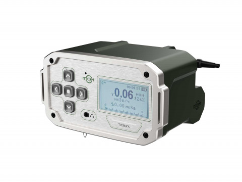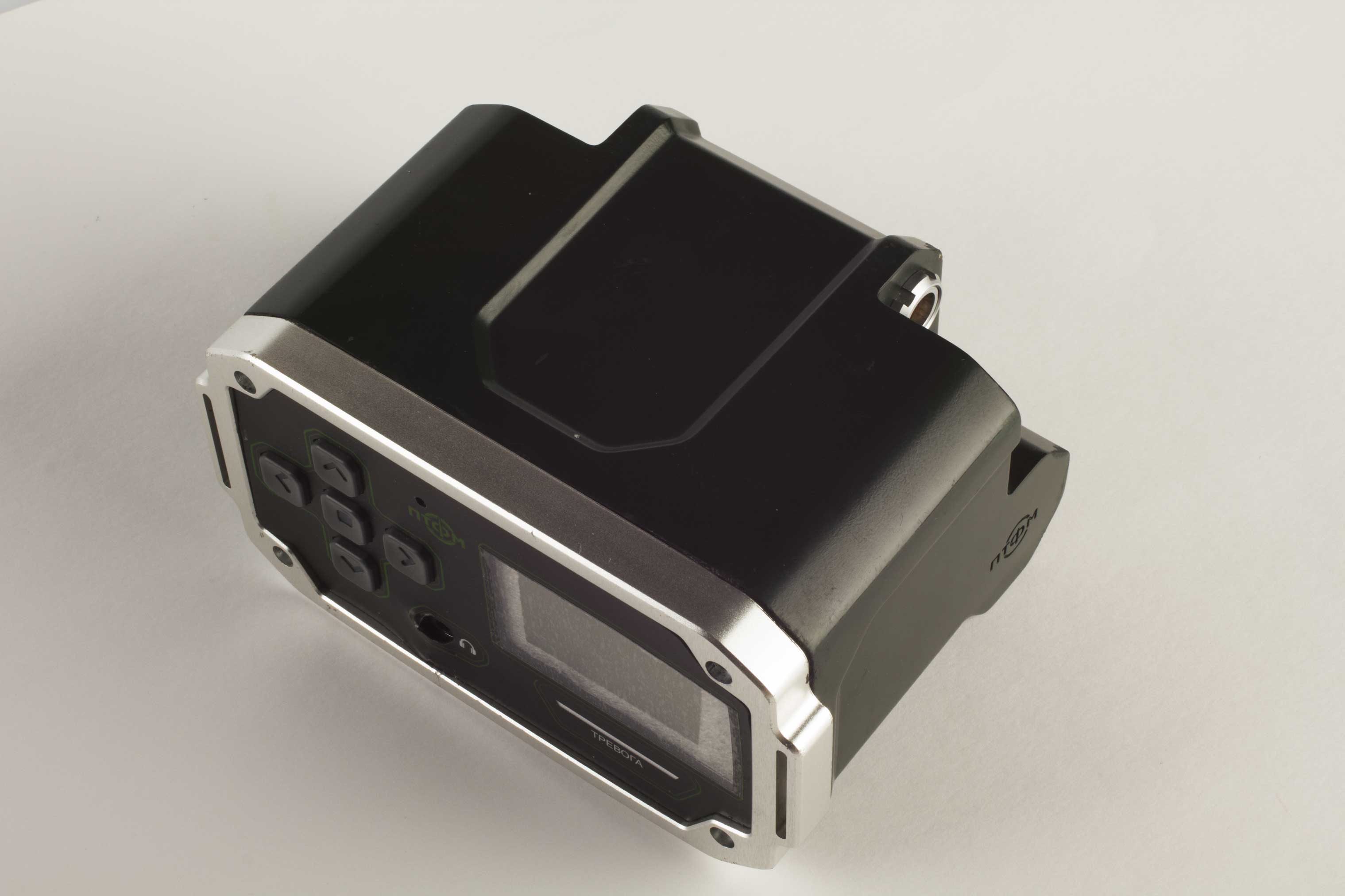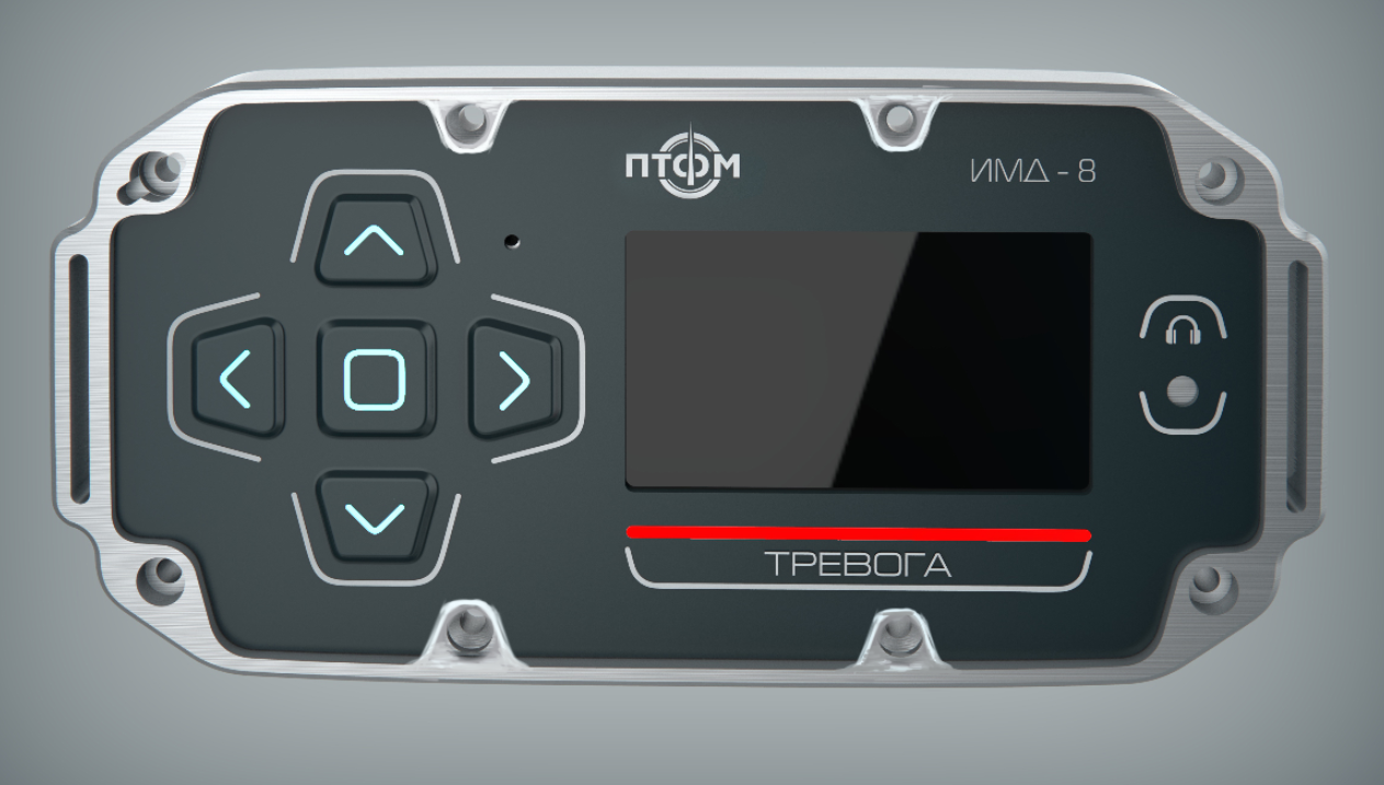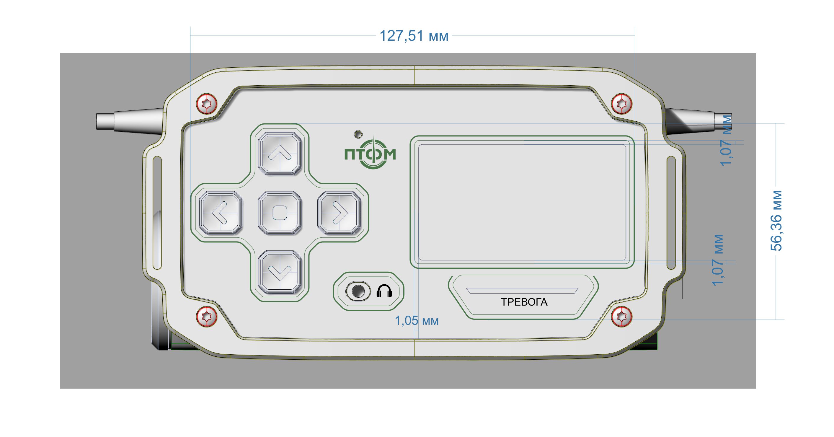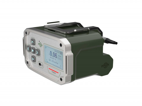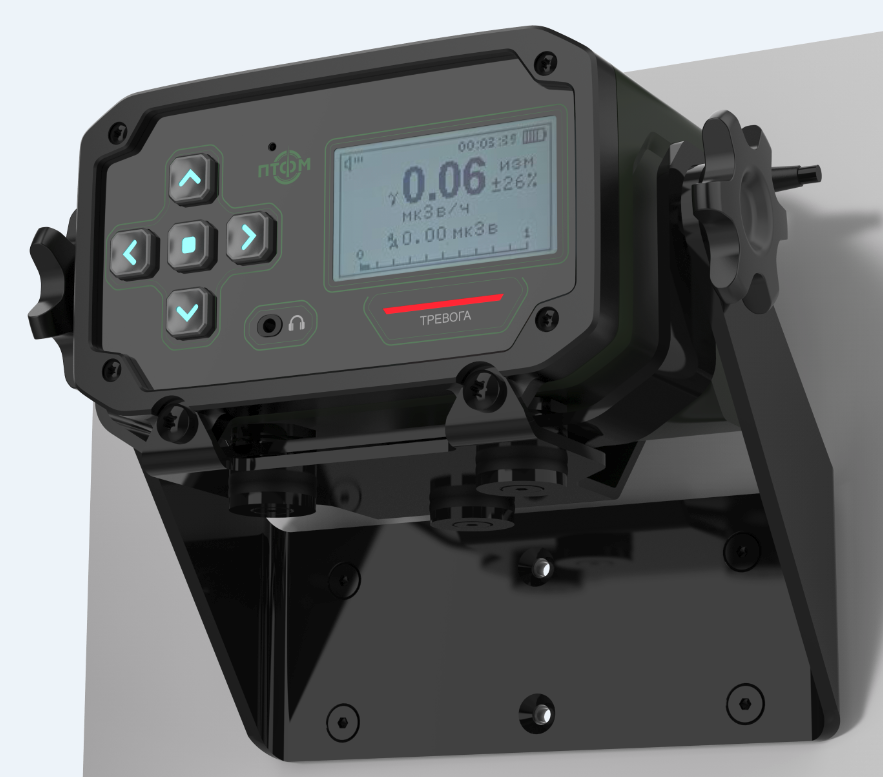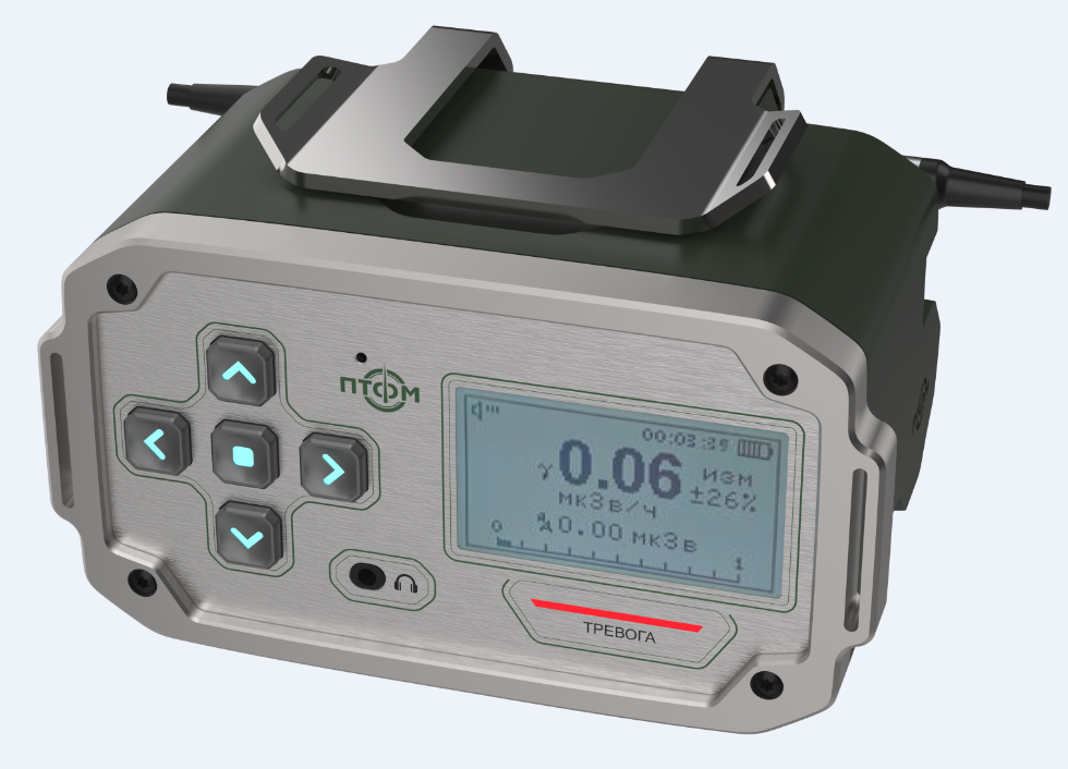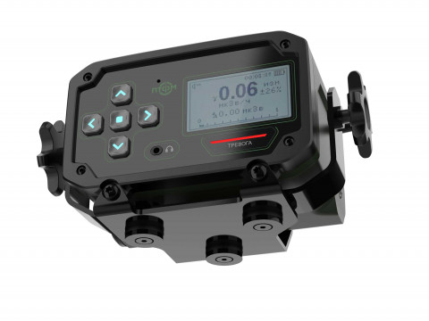 Состав корпуса – основная часть с аккумуляторным отсеком и его крышкой плюс передняя панель. Внешние элементы – монитор за защитным стеклом, прорезиненная клавиатура с подсветкой кнопок, обязательная индикация превышения порога (красного цвета), защищенный разъем для наушников (только для носимого варианта, в других версиях будет заглушка), разъемы для передачи данных от внешних блоков, питания и сети. Для носимого исполнения нужны крепление плечевого ремня, клипса для ношения пульта на поясном ремне и кронштейн для крепления к стене (размещения на столе и подвешивания под потолком).