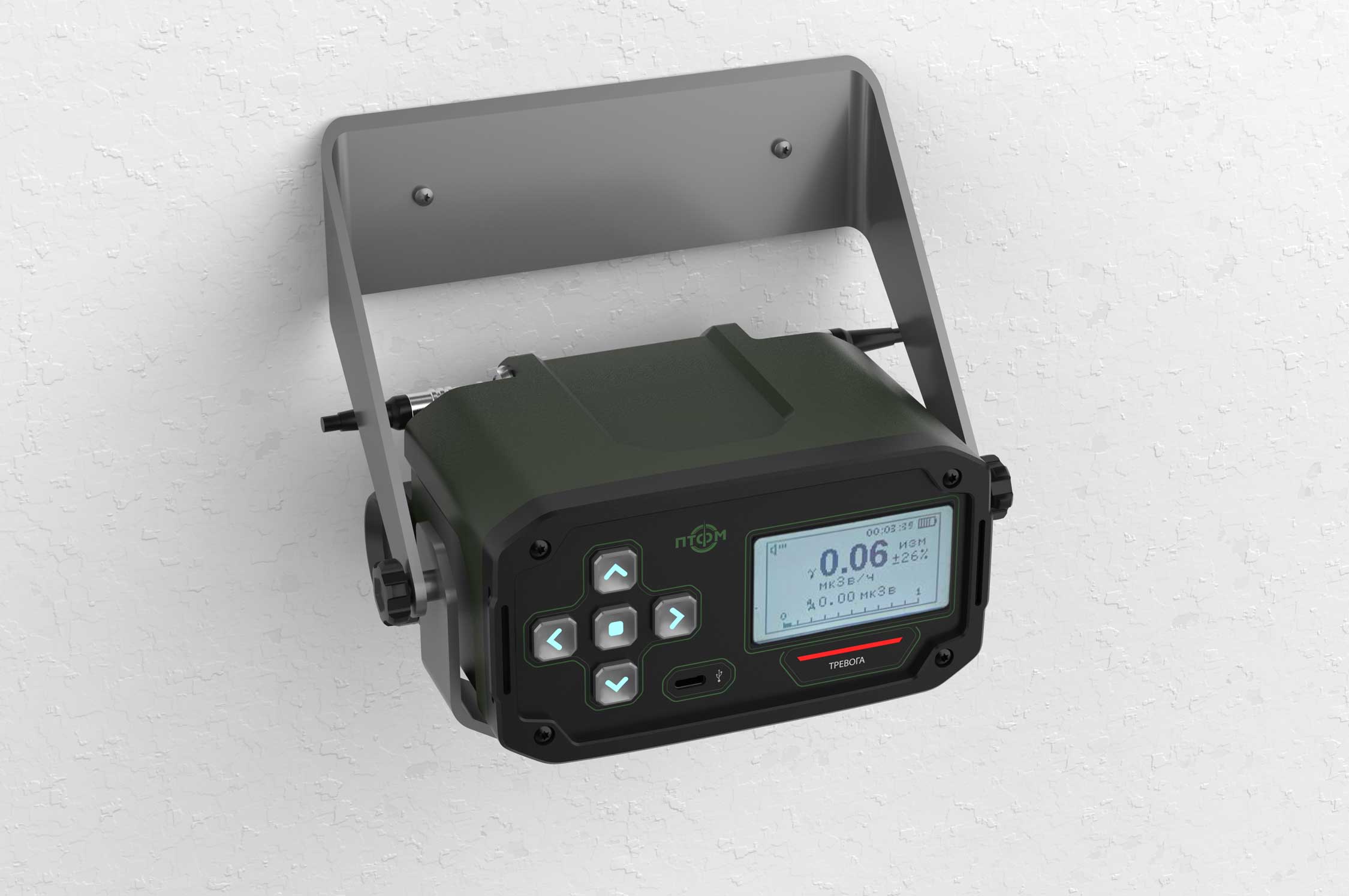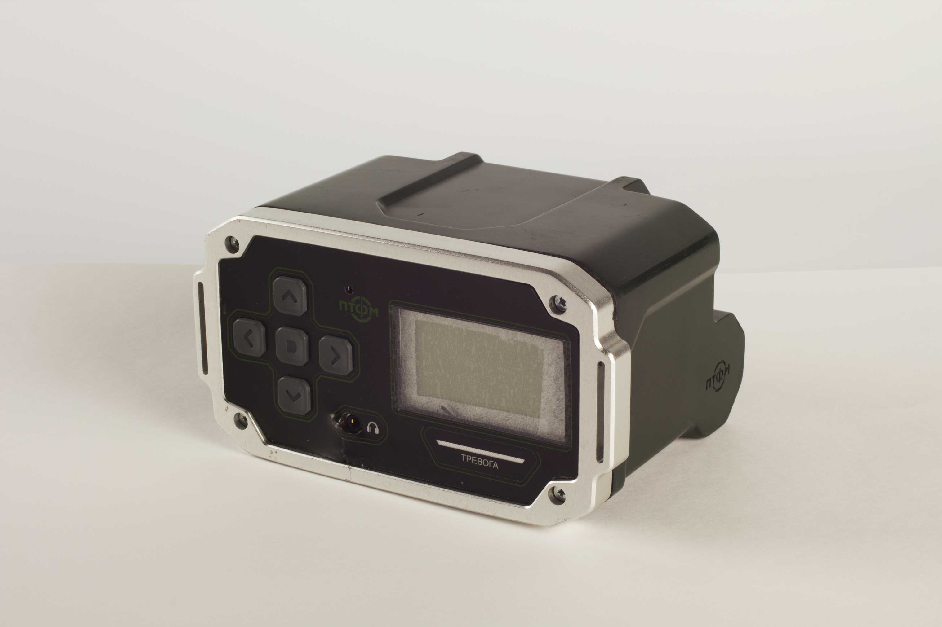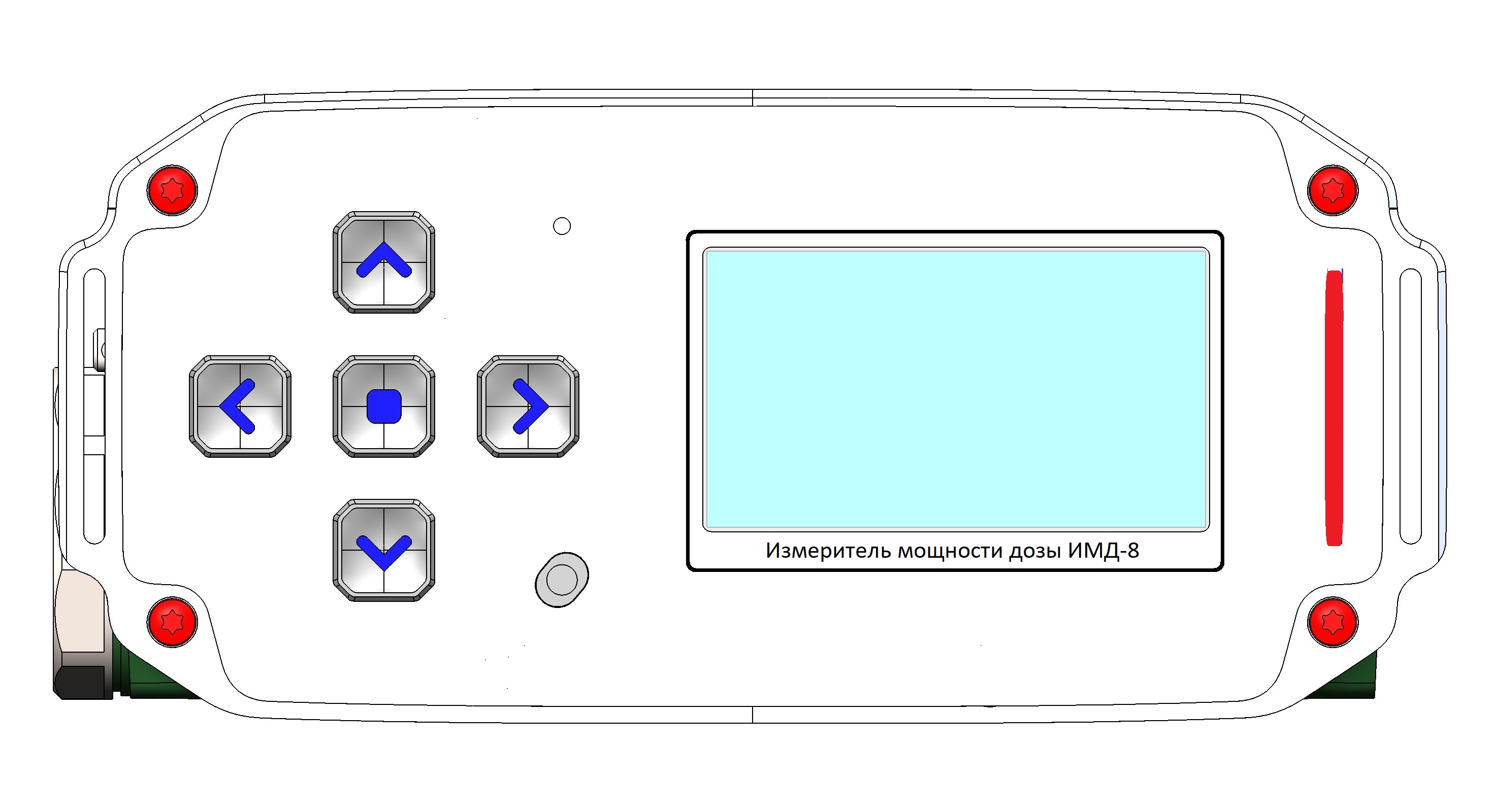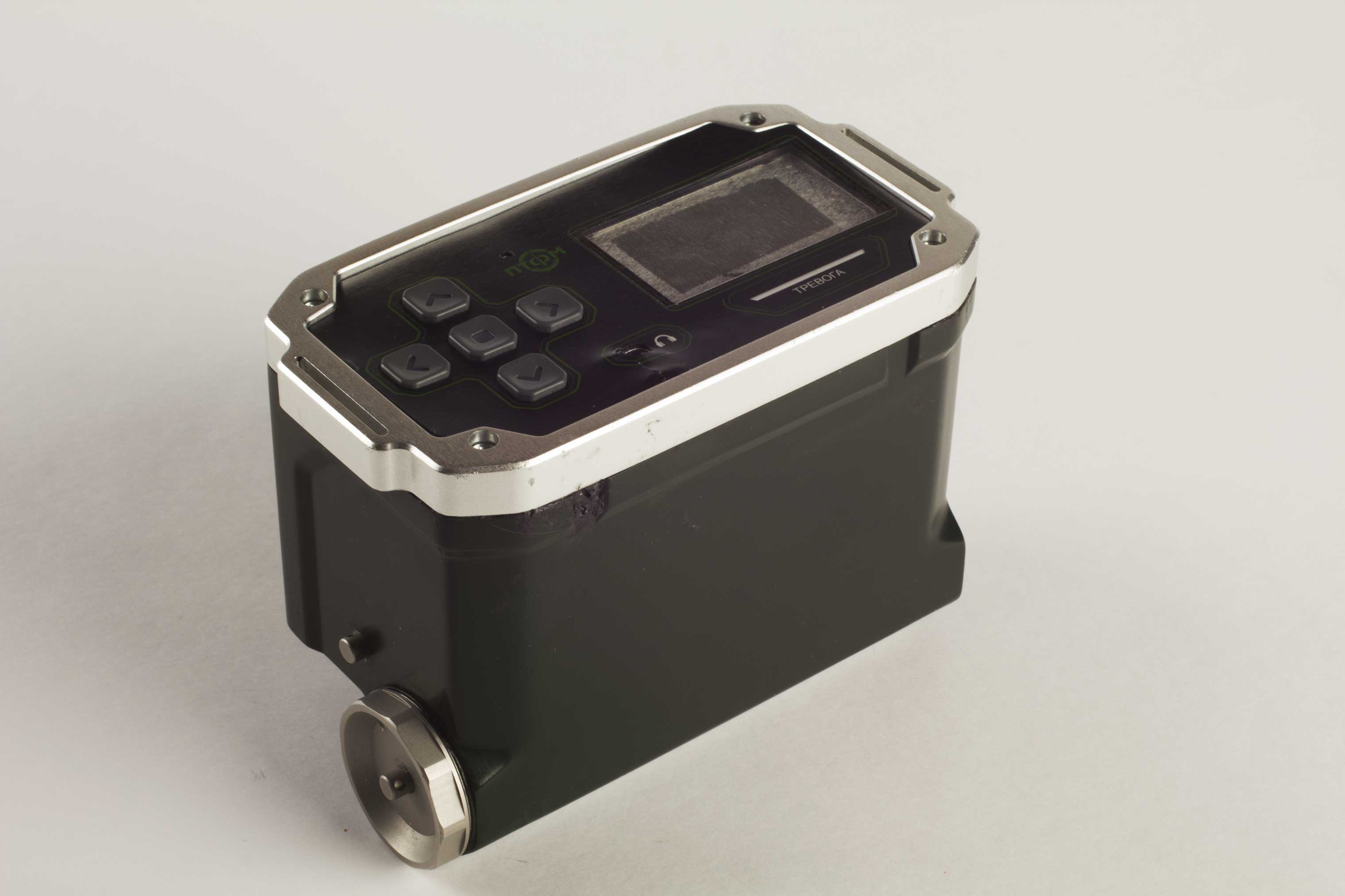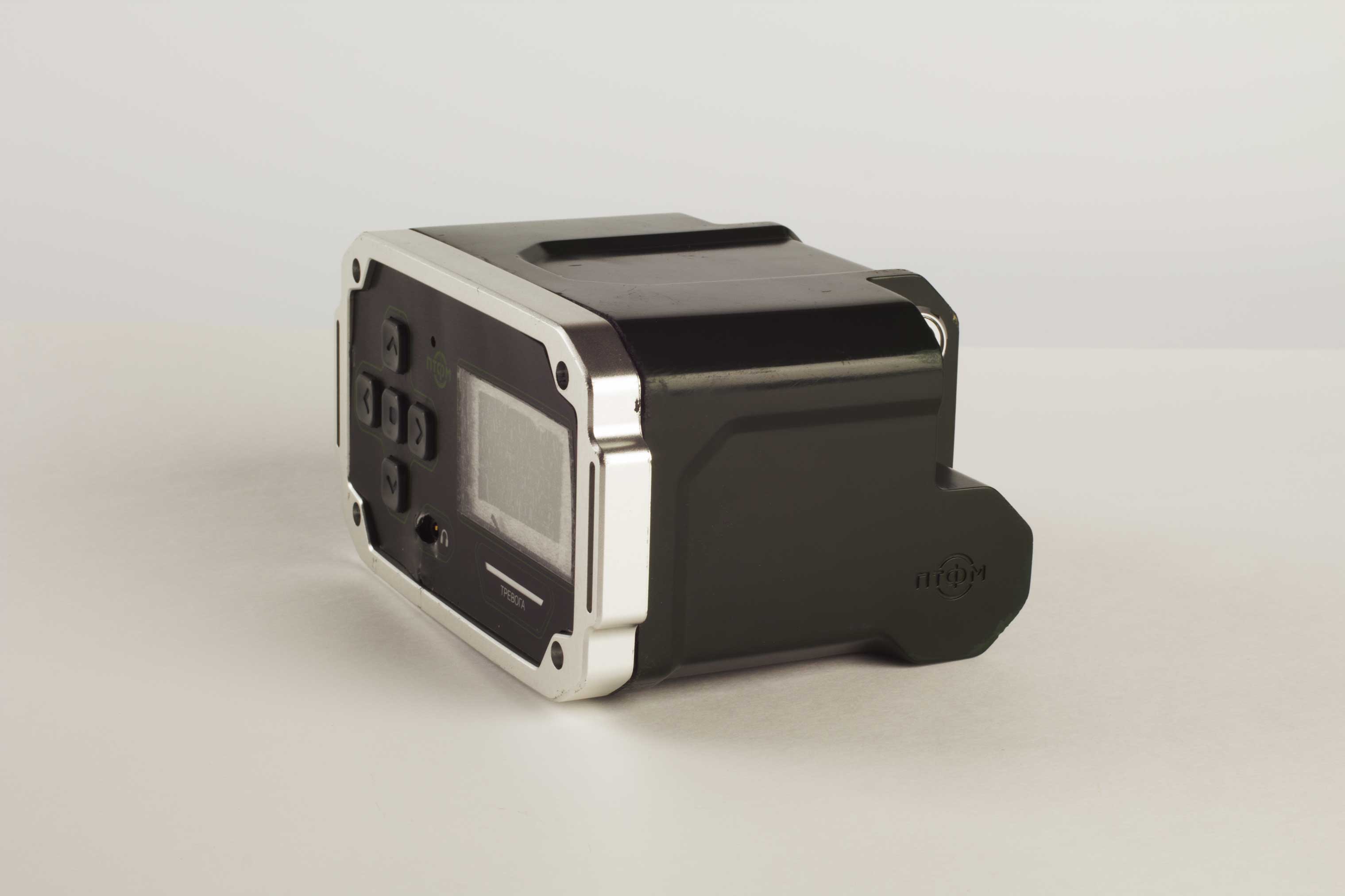 Состав корпуса – основная часть с аккумуляторным отсеком и его крышкой плюс передняя панель. Внешние элементы – монитор за защитным стеклом, прорезиненная клавиатура с подсветкой кнопок, обязательная индикация превышения порога (красного цвета), защищенный разъем для наушников (только для носимого варианта, в других версиях будет заглушка), разъемы для передачи данных от внешних блоков, питания и сети. Для носимого исполнения нужны крепление плечевого ремня, клипса для ношения пульта на поясном ремне и кронштейн для крепления к стене (размещения на столе и подвешивания под потолком).