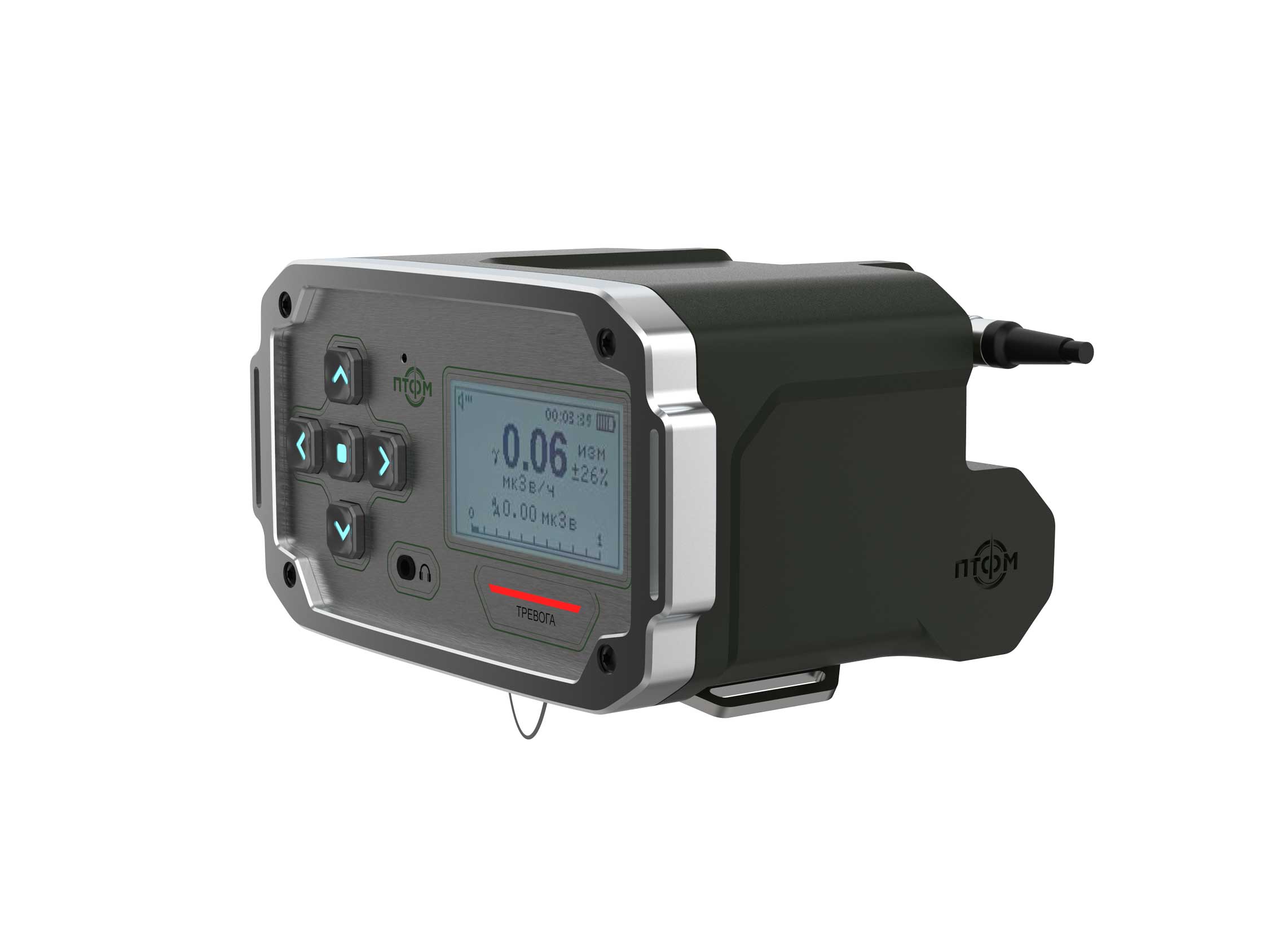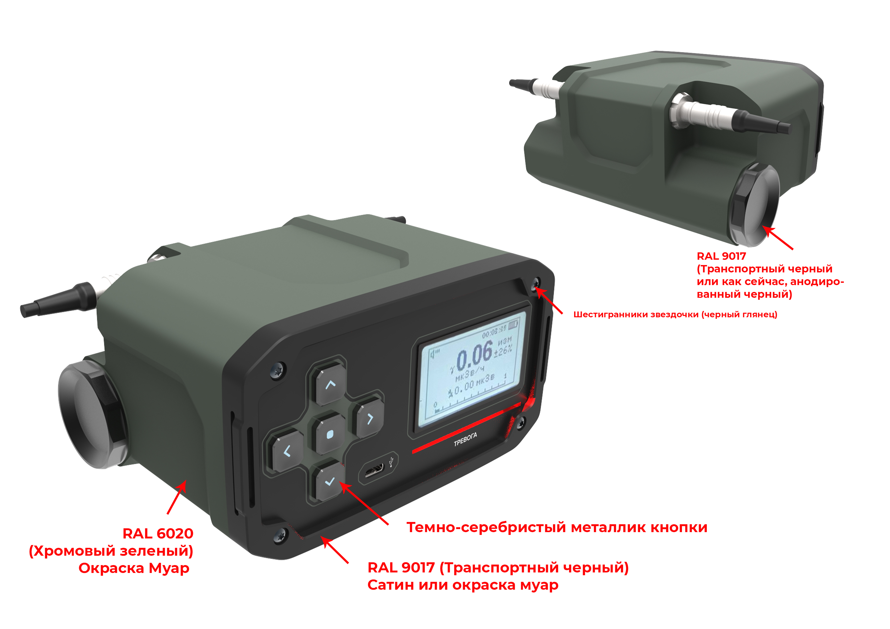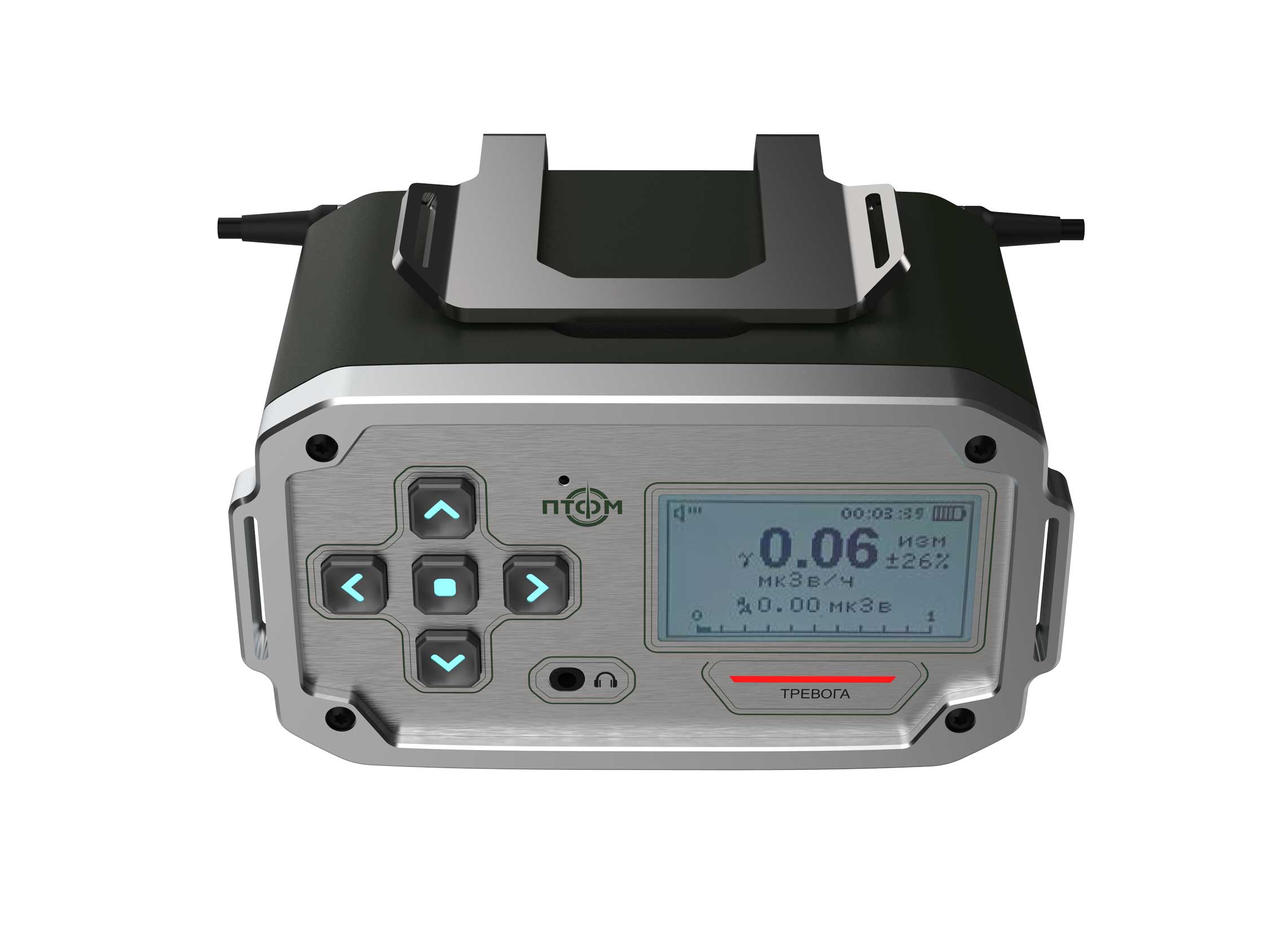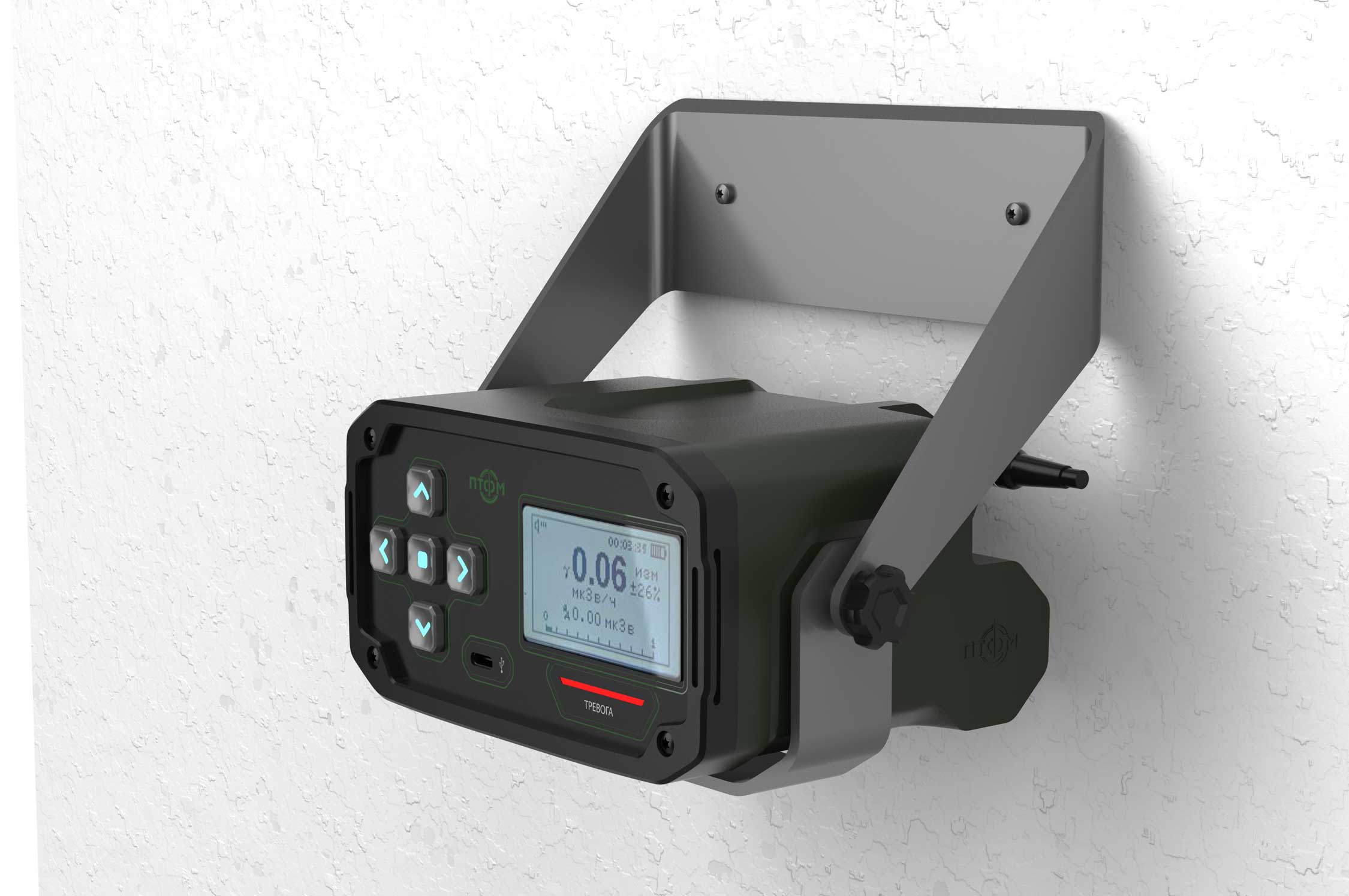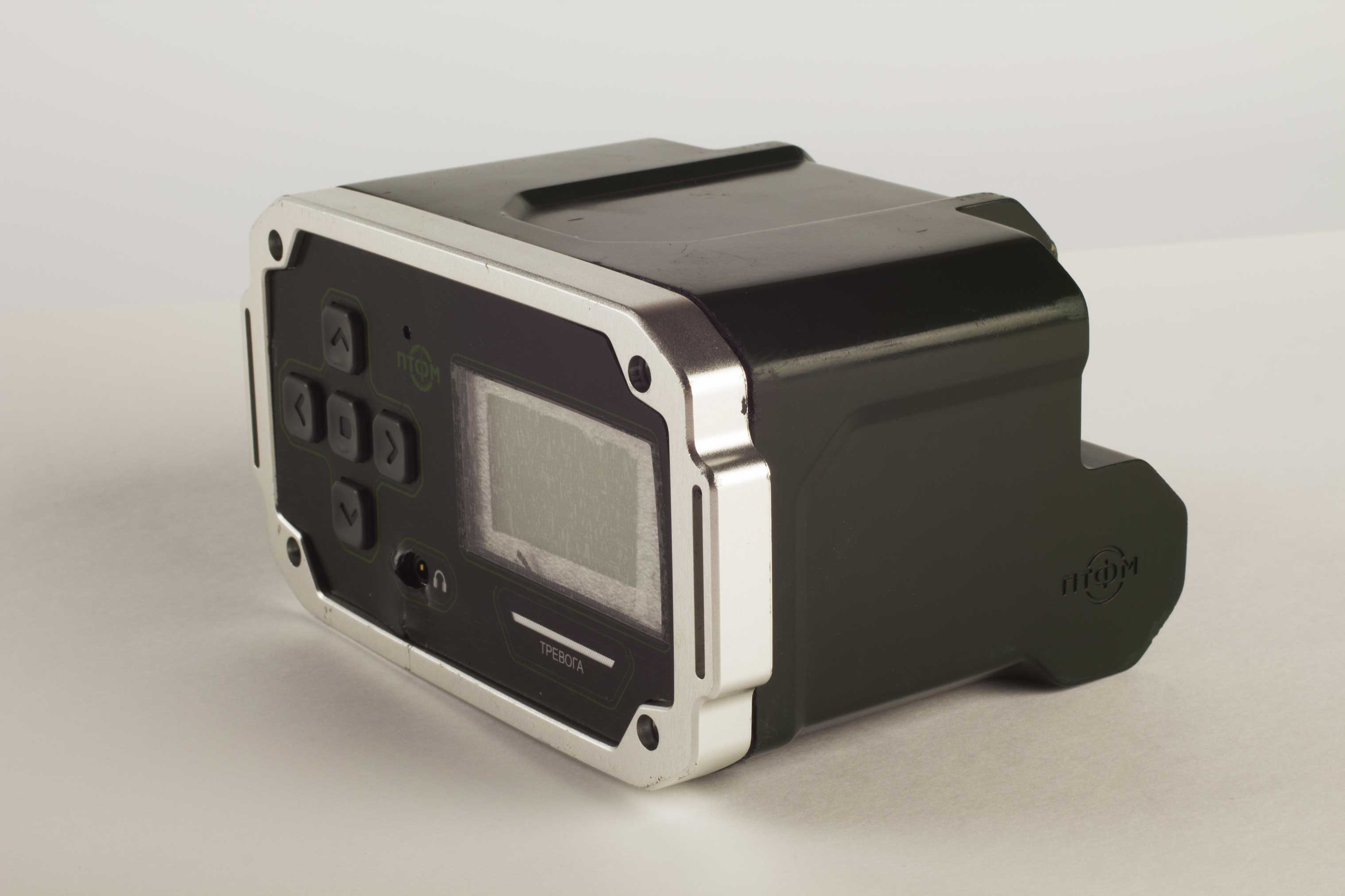 Состав корпуса – основная часть с аккумуляторным отсеком и его крышкой плюс передняя панель. Внешние элементы – монитор за защитным стеклом, прорезиненная клавиатура с подсветкой кнопок, обязательная индикация превышения порога (красного цвета), защищенный разъем для наушников (только для носимого варианта, в других версиях будет заглушка), разъемы для передачи данных от внешних блоков, питания и сети. Для носимого исполнения нужны крепление плечевого ремня, клипса для ношения пульта на поясном ремне и кронштейн для крепления к стене (размещения на столе и подвешивания под потолком).