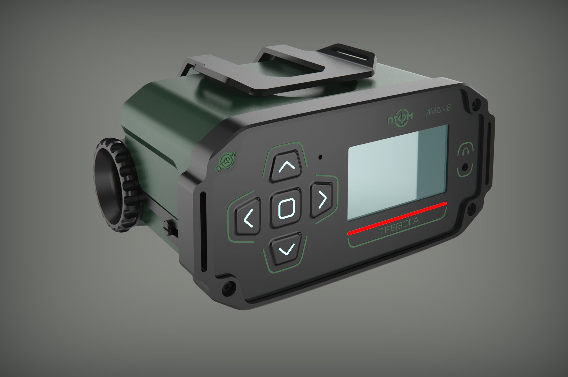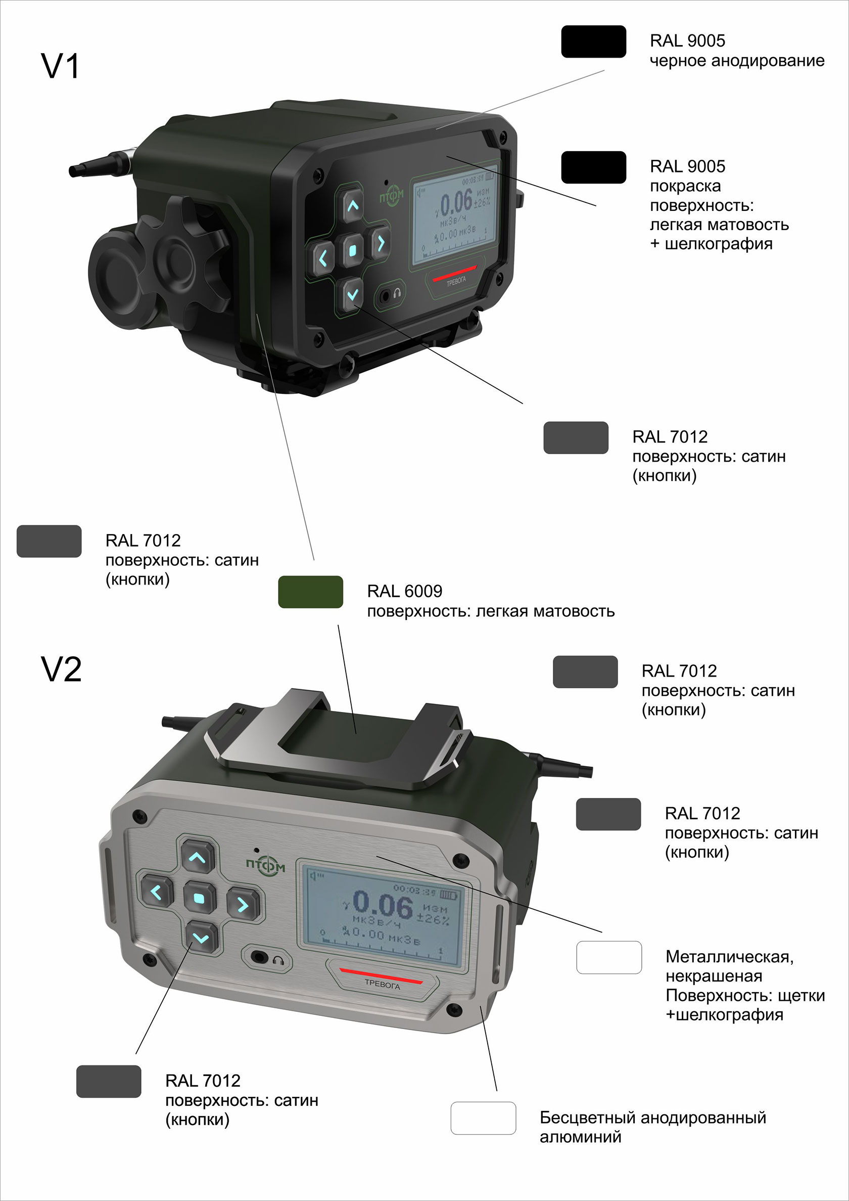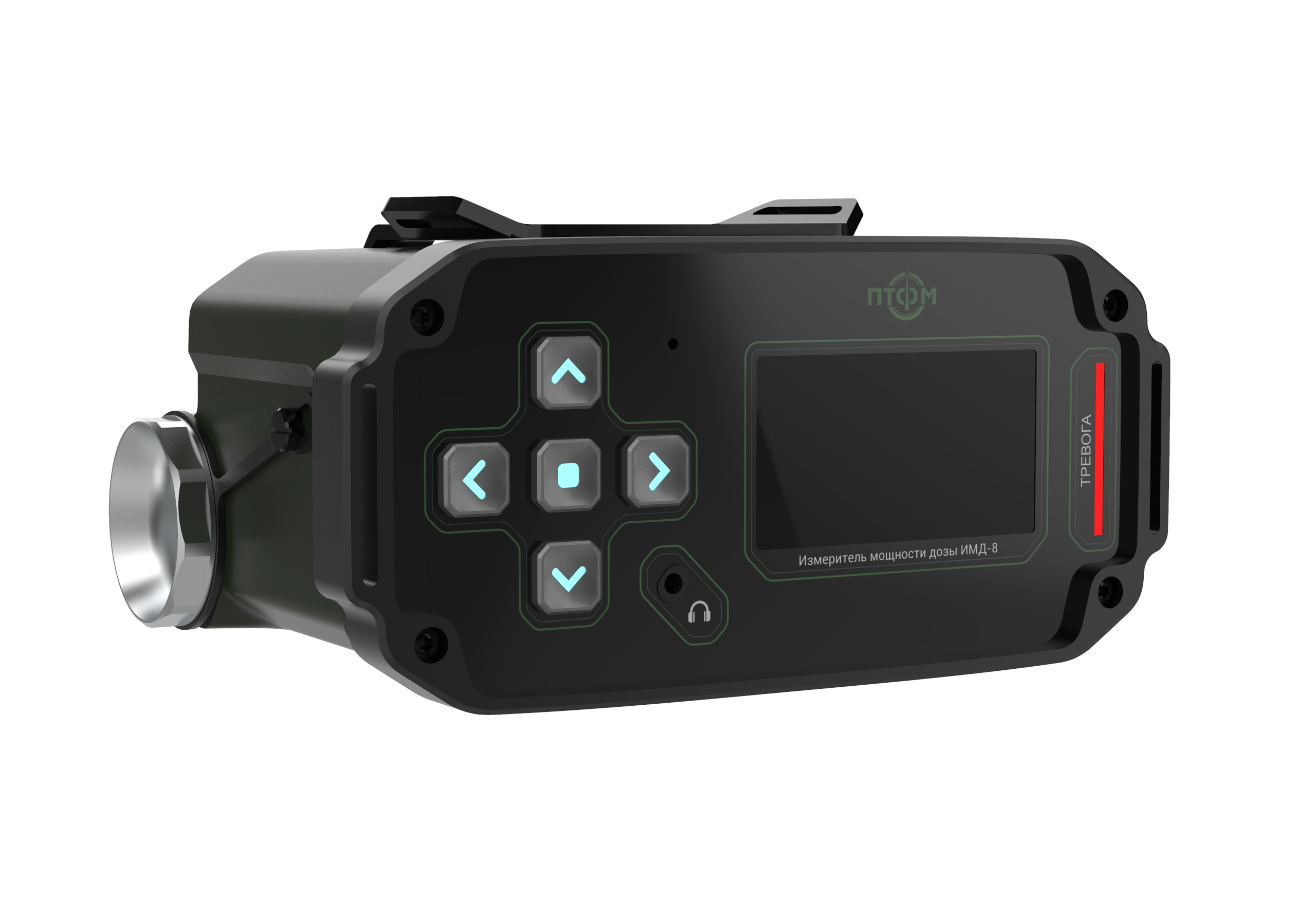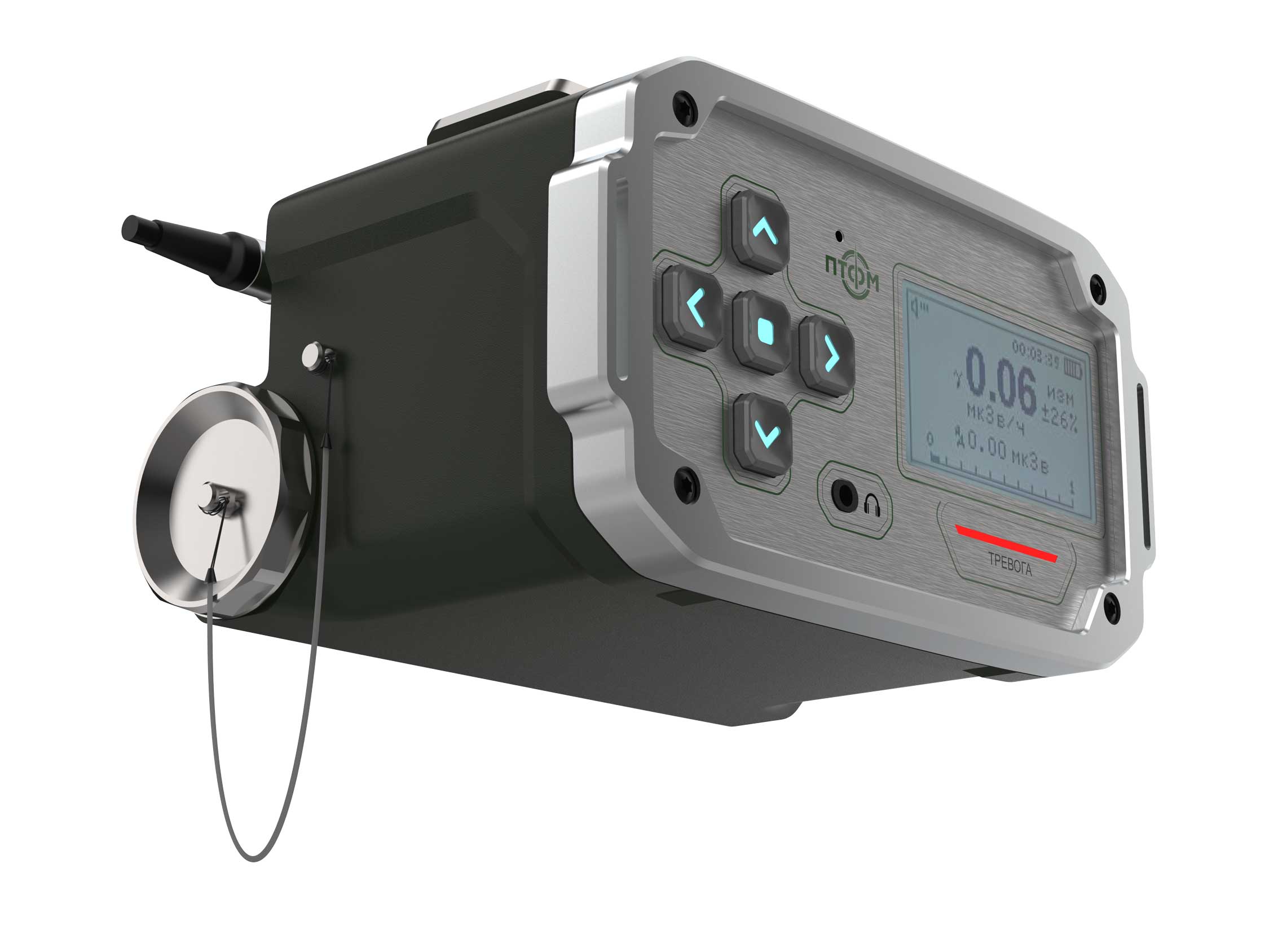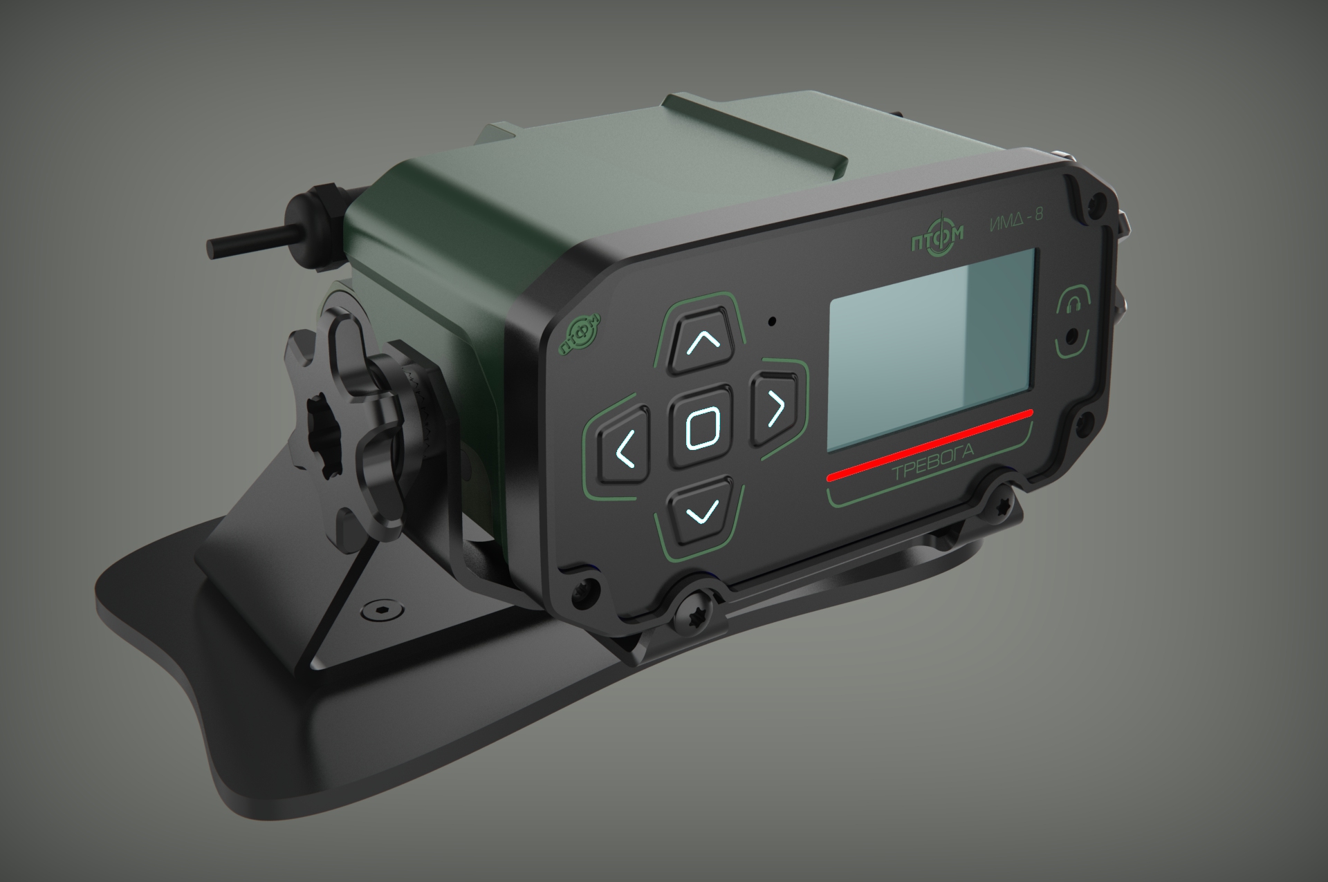 Состав корпуса – основная часть с аккумуляторным отсеком и его крышкой плюс передняя панель. Внешние элементы – монитор за защитным стеклом, прорезиненная клавиатура с подсветкой кнопок, обязательная индикация превышения порога (красного цвета), защищенный разъем для наушников (только для носимого варианта, в других версиях будет заглушка), разъемы для передачи данных от внешних блоков, питания и сети. Для носимого исполнения нужны крепление плечевого ремня, клипса для ношения пульта на поясном ремне и кронштейн для крепления к стене (размещения на столе и подвешивания под потолком).