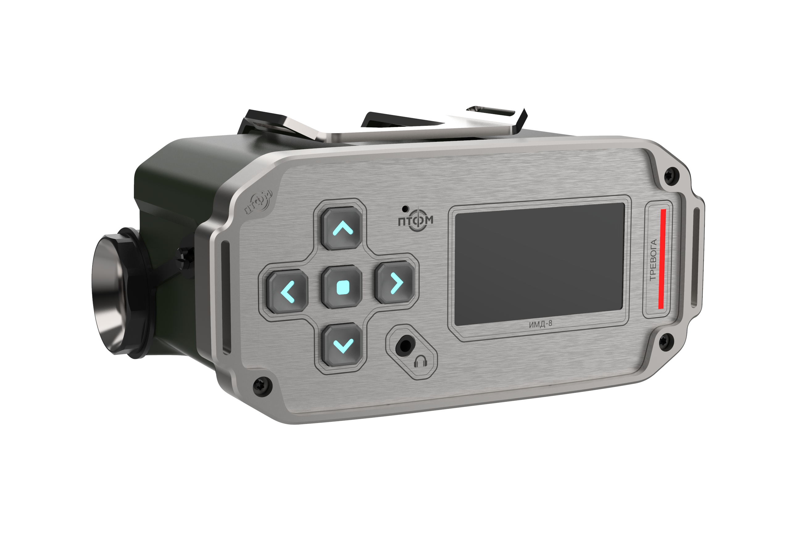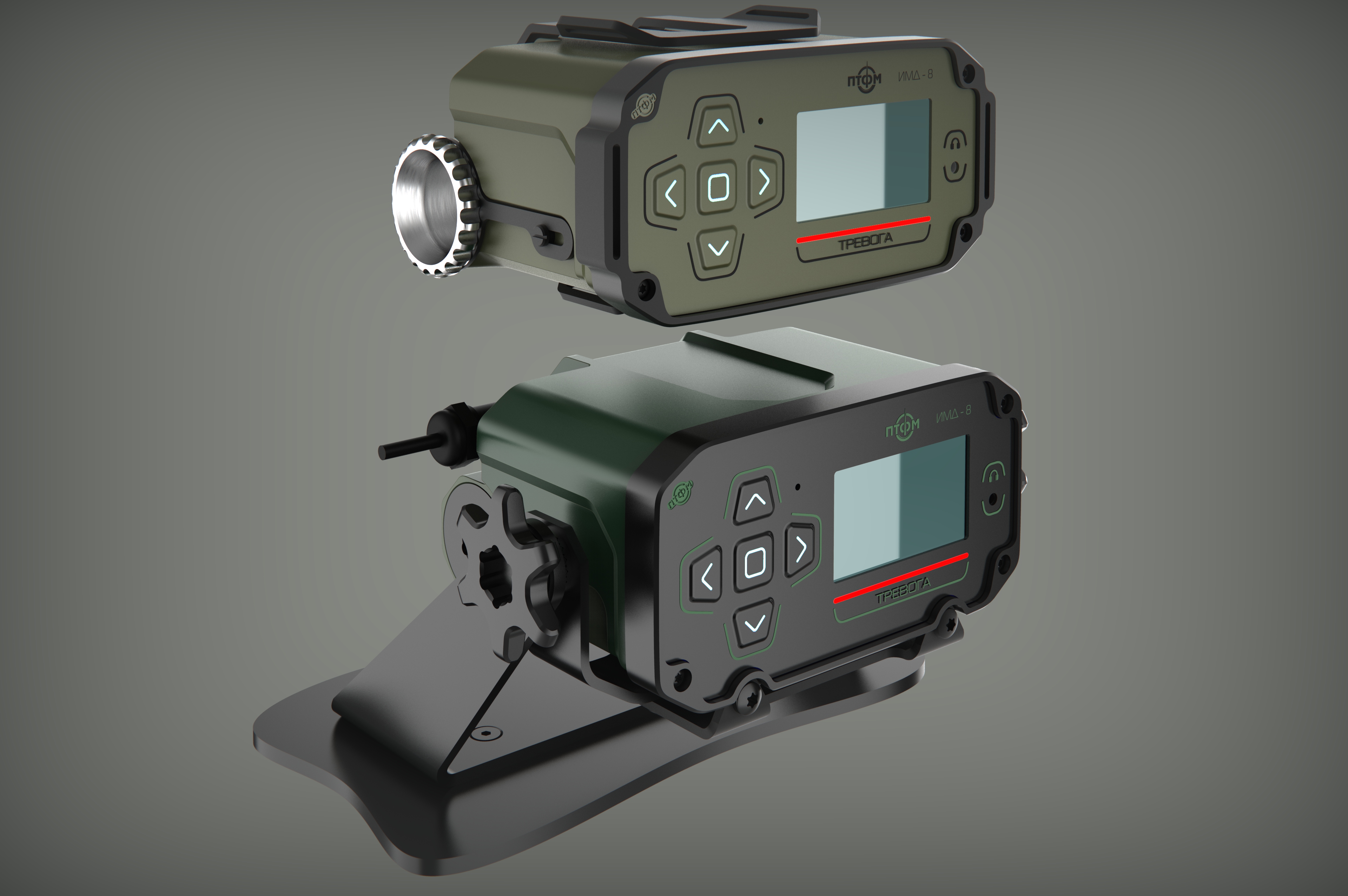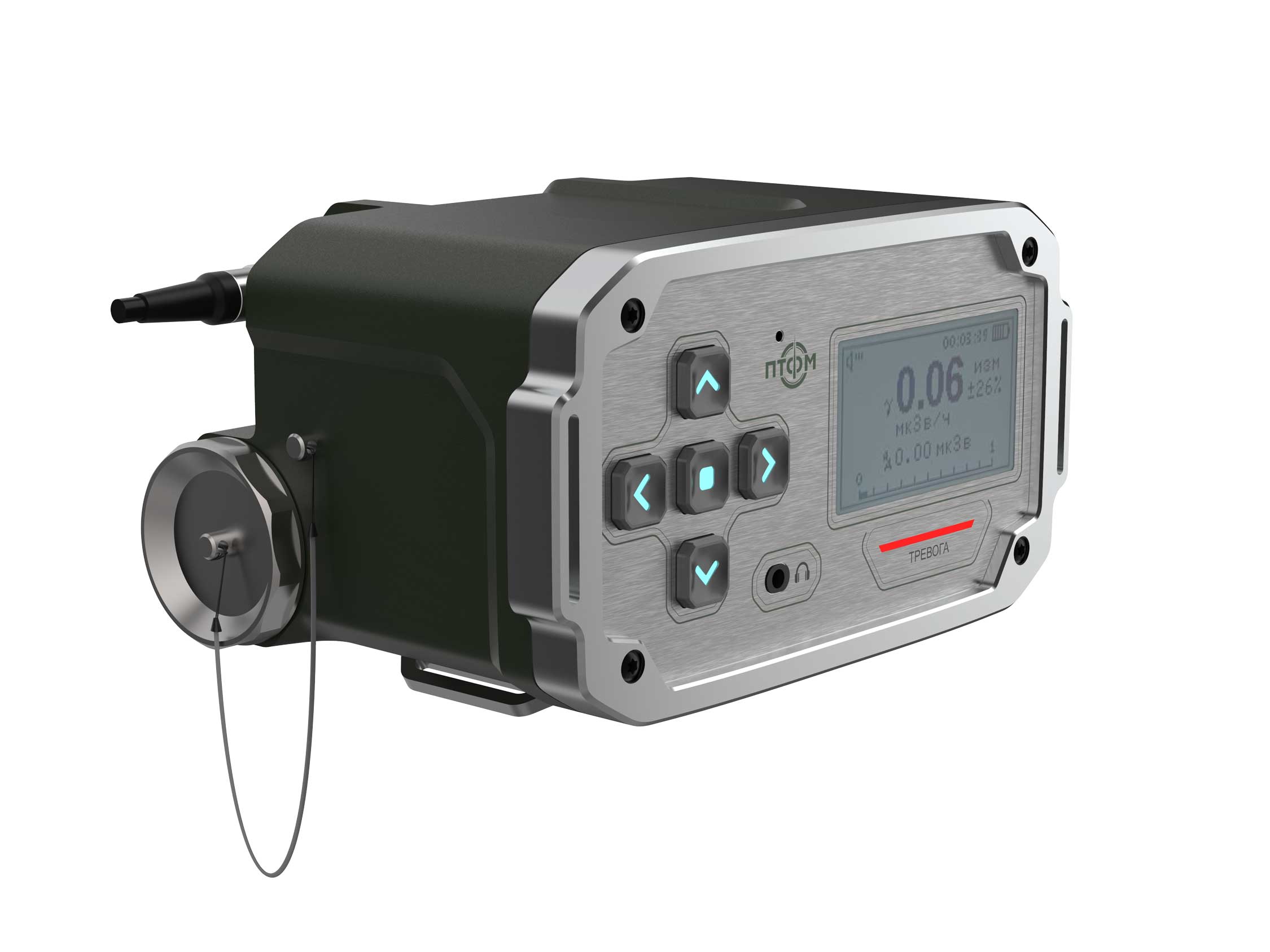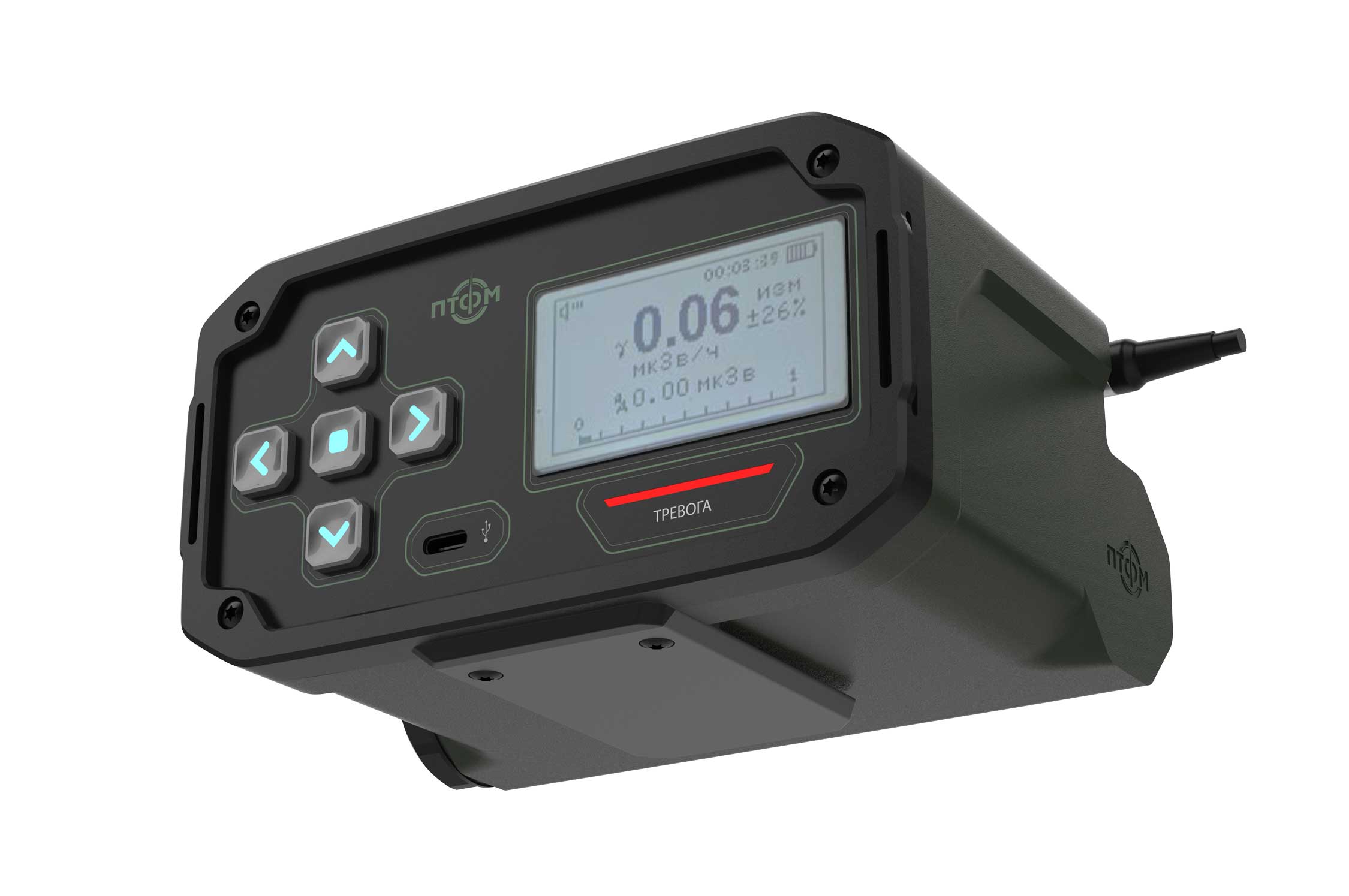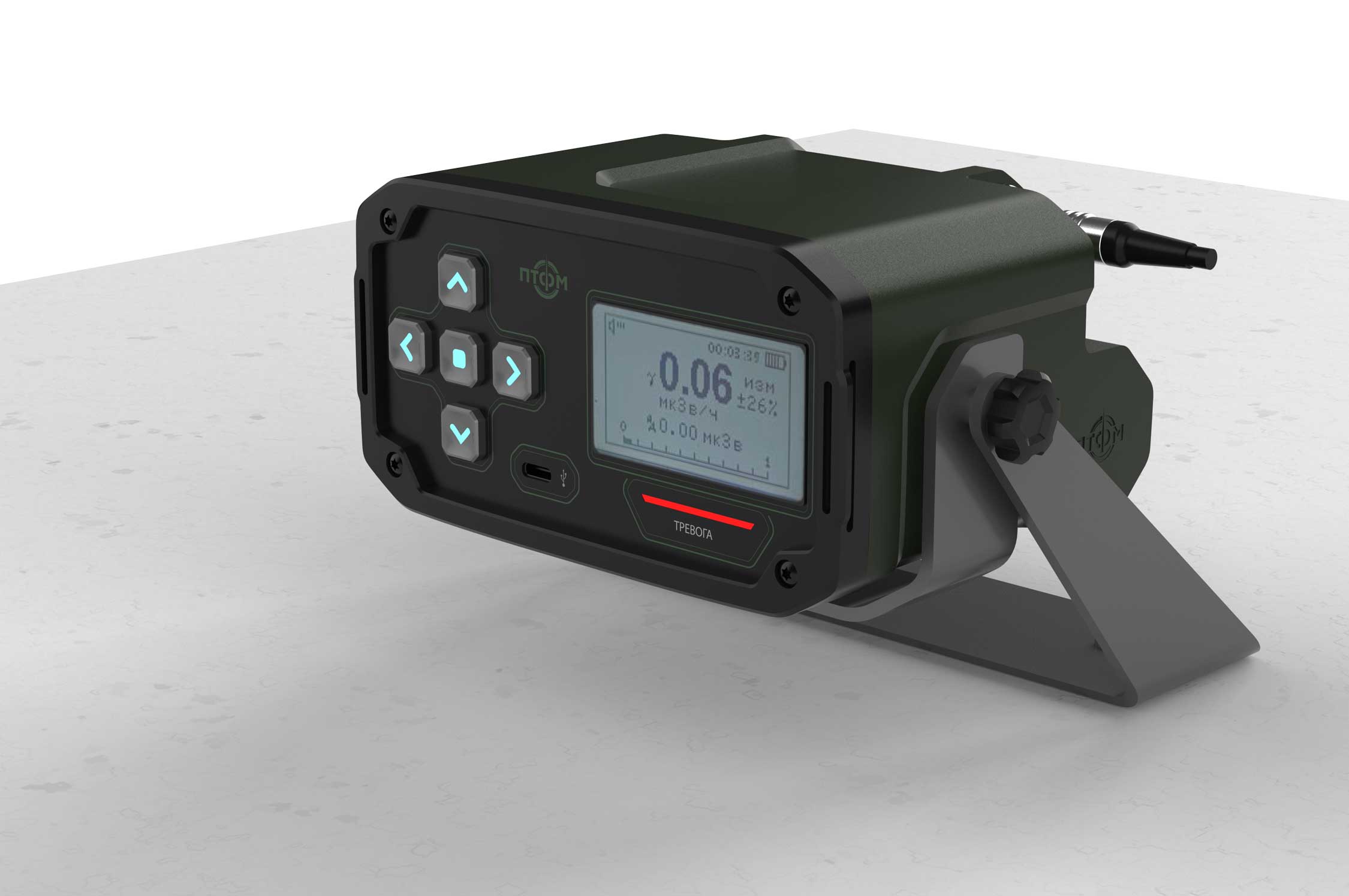 Состав корпуса – основная часть с аккумуляторным отсеком и его крышкой плюс передняя панель. Внешние элементы – монитор за защитным стеклом, прорезиненная клавиатура с подсветкой кнопок, обязательная индикация превышения порога (красного цвета), защищенный разъем для наушников (только для носимого варианта, в других версиях будет заглушка), разъемы для передачи данных от внешних блоков, питания и сети. Для носимого исполнения нужны крепление плечевого ремня, клипса для ношения пульта на поясном ремне и кронштейн для крепления к стене (размещения на столе и подвешивания под потолком).