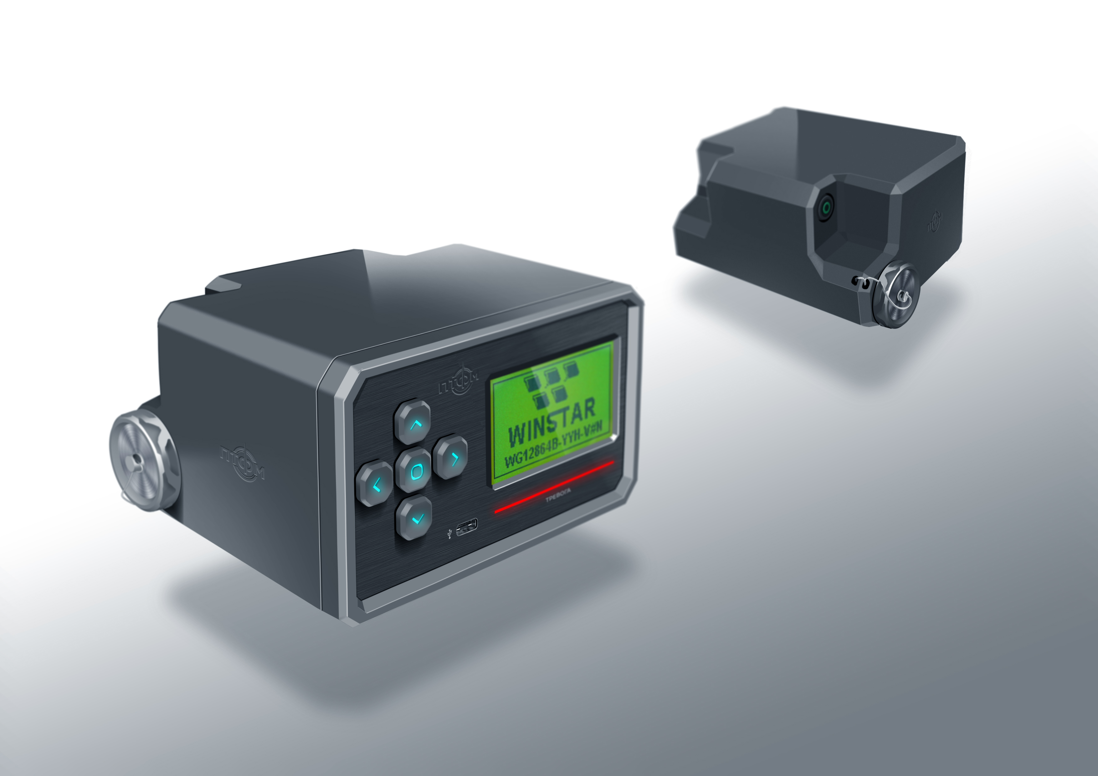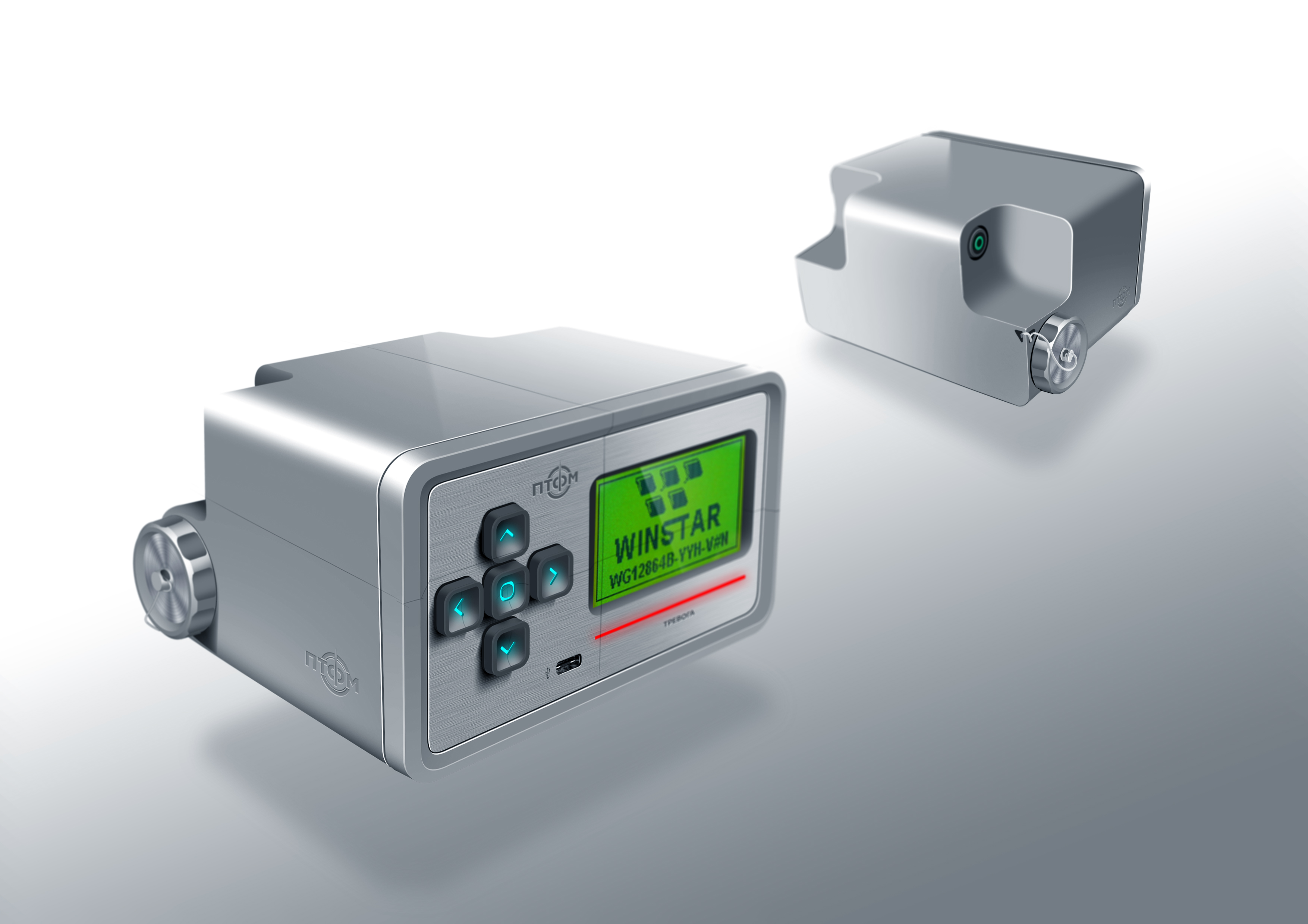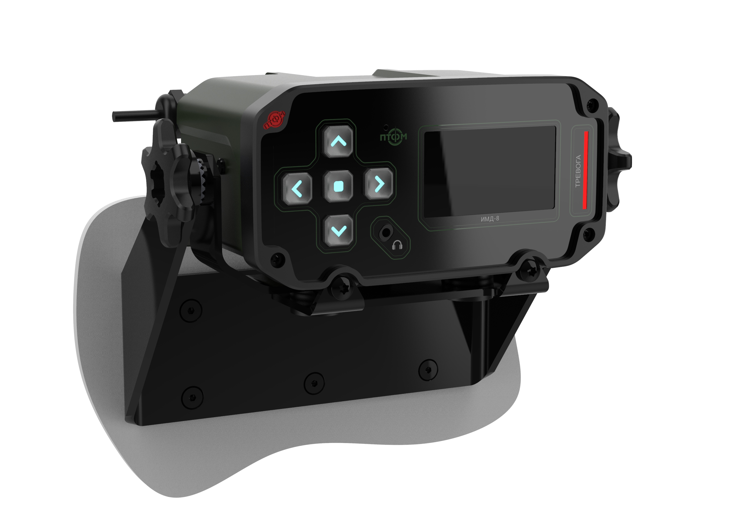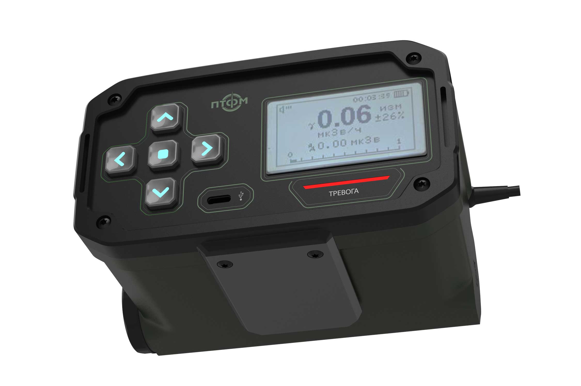 Состав корпуса – основная часть с аккумуляторным отсеком и его крышкой плюс передняя панель. Внешние элементы – монитор за защитным стеклом, прорезиненная клавиатура с подсветкой кнопок, обязательная индикация превышения порога (красного цвета), защищенный разъем для наушников (только для носимого варианта, в других версиях будет заглушка), разъемы для передачи данных от внешних блоков, питания и сети. Для носимого исполнения нужны крепление плечевого ремня, клипса для ношения пульта на поясном ремне и кронштейн для крепления к стене (размещения на столе и подвешивания под потолком).
