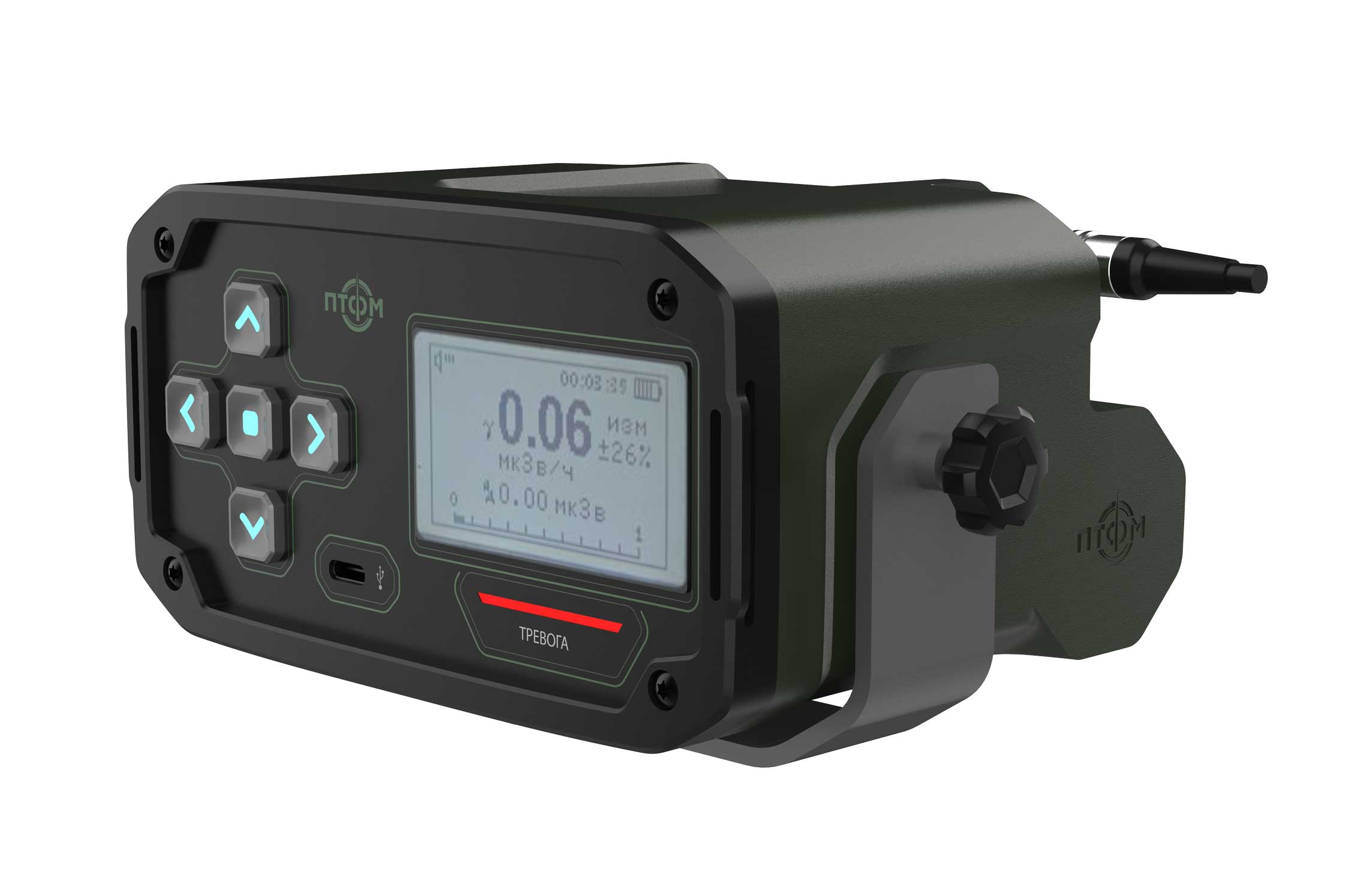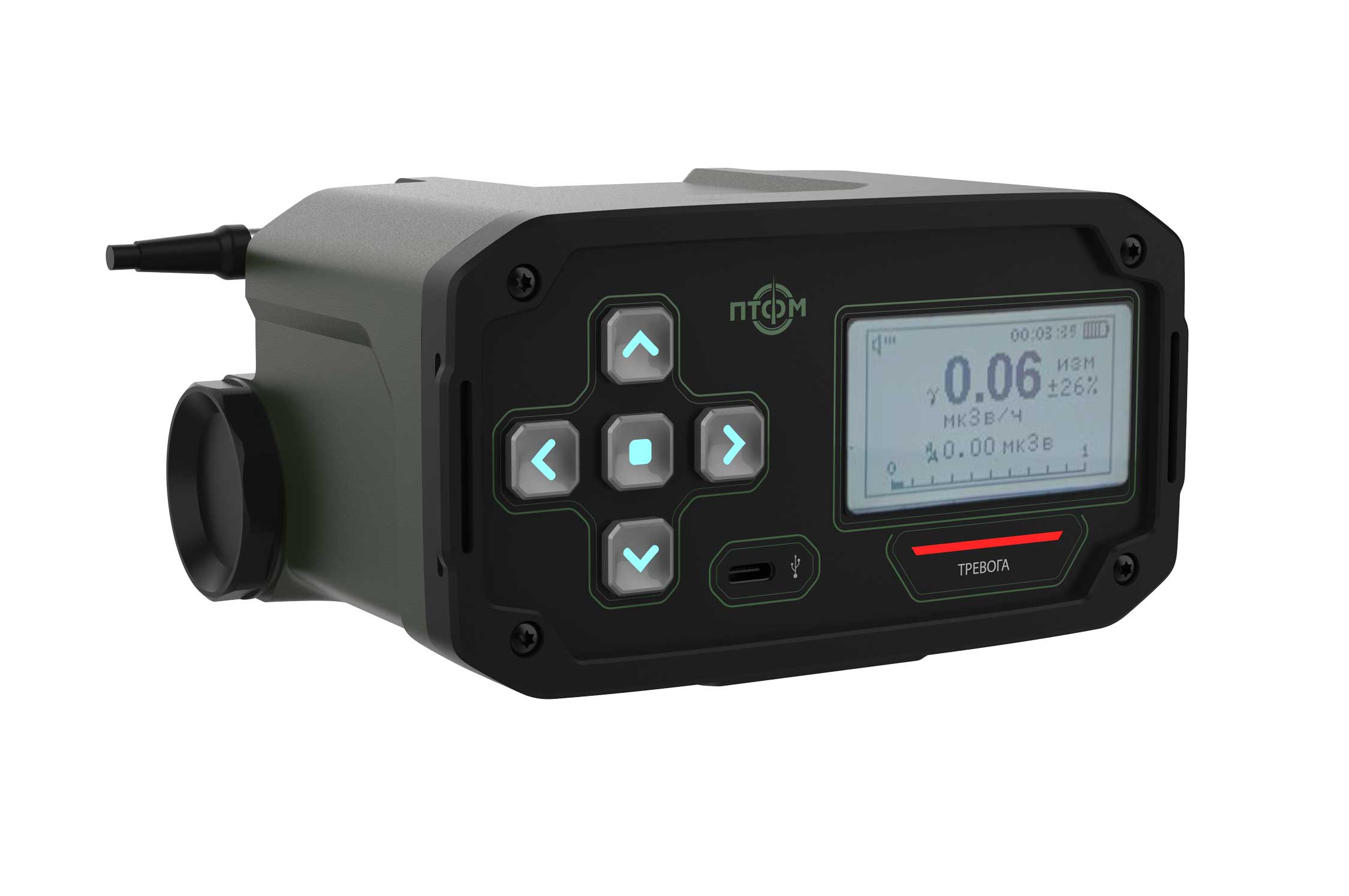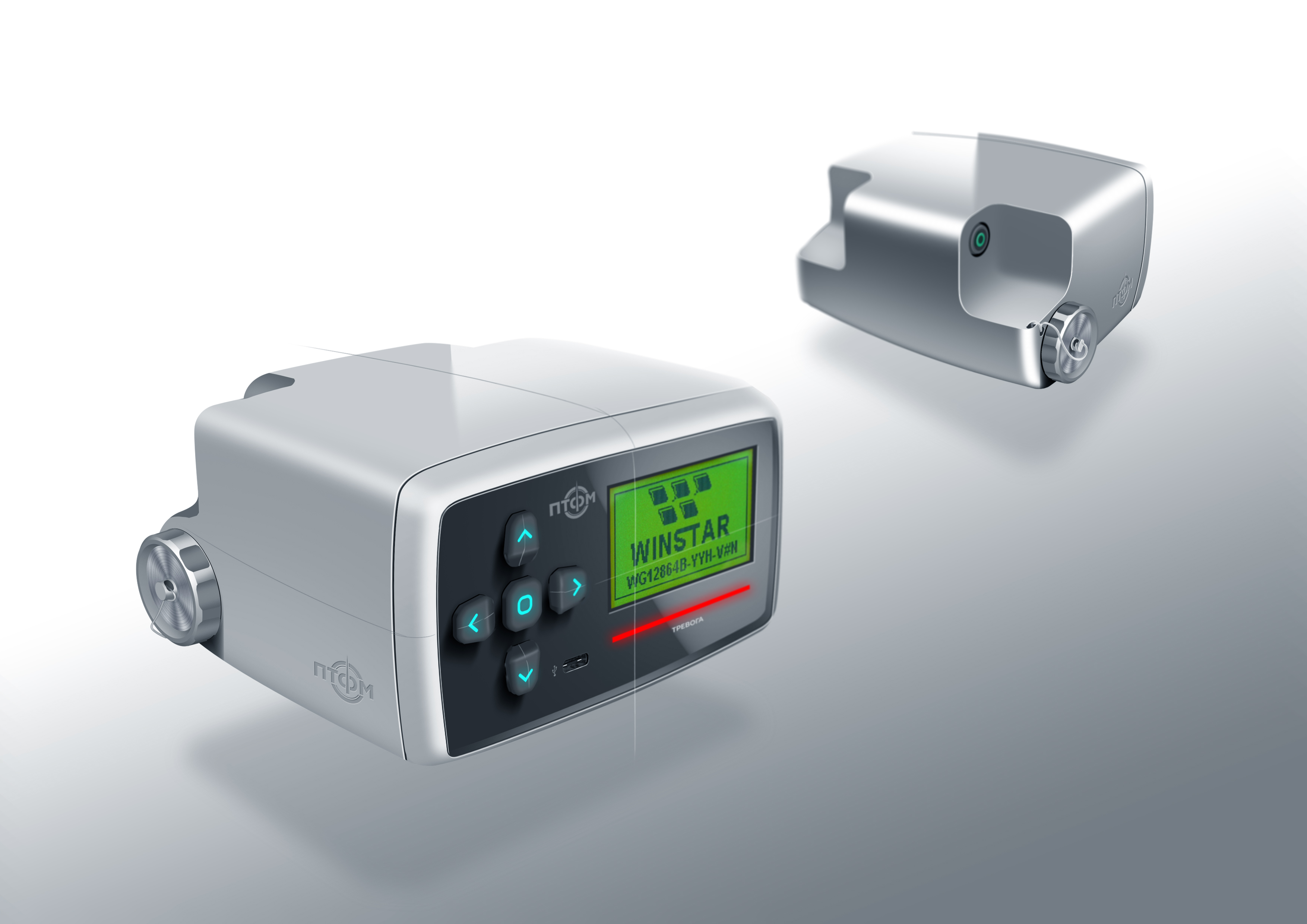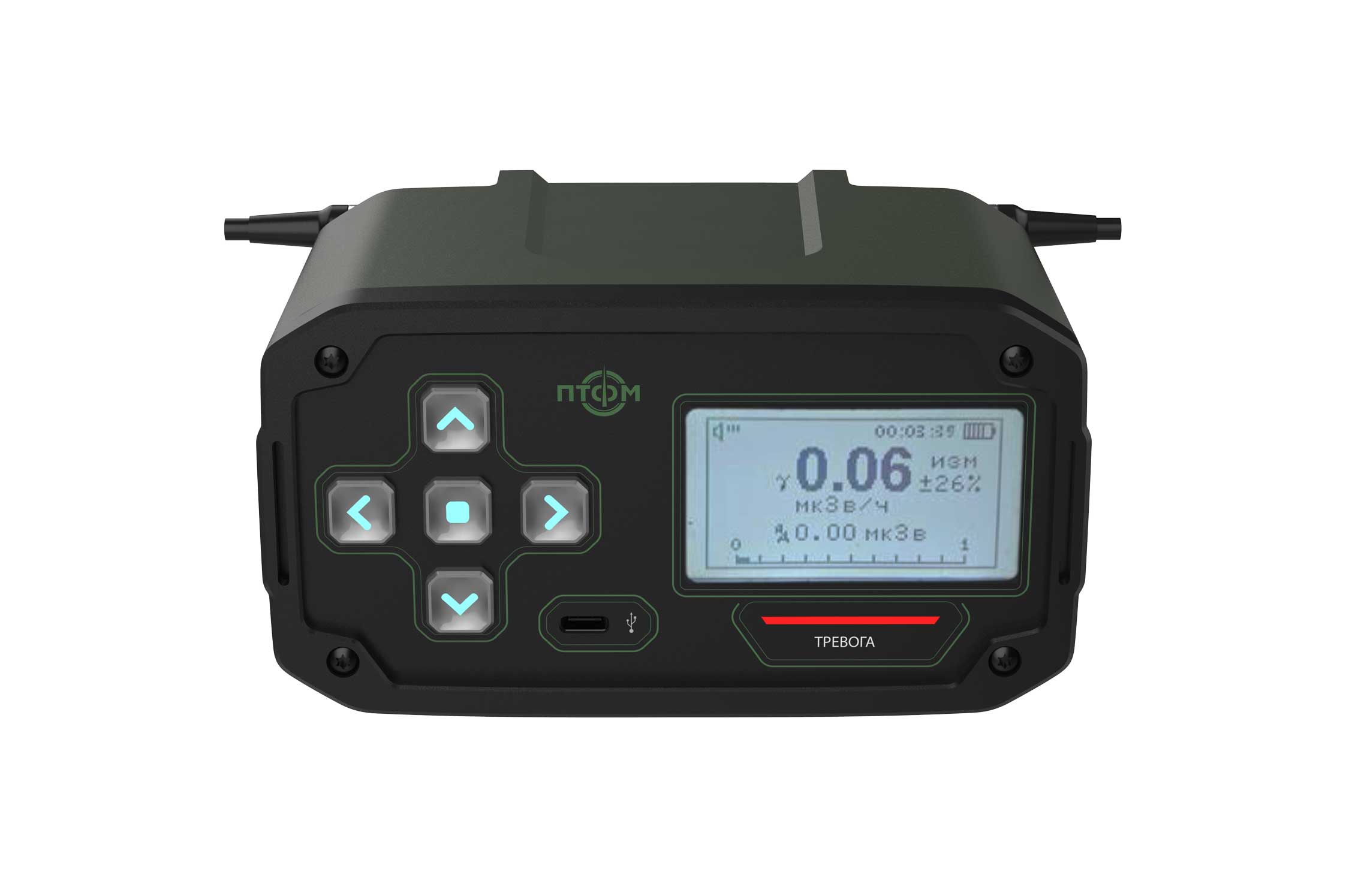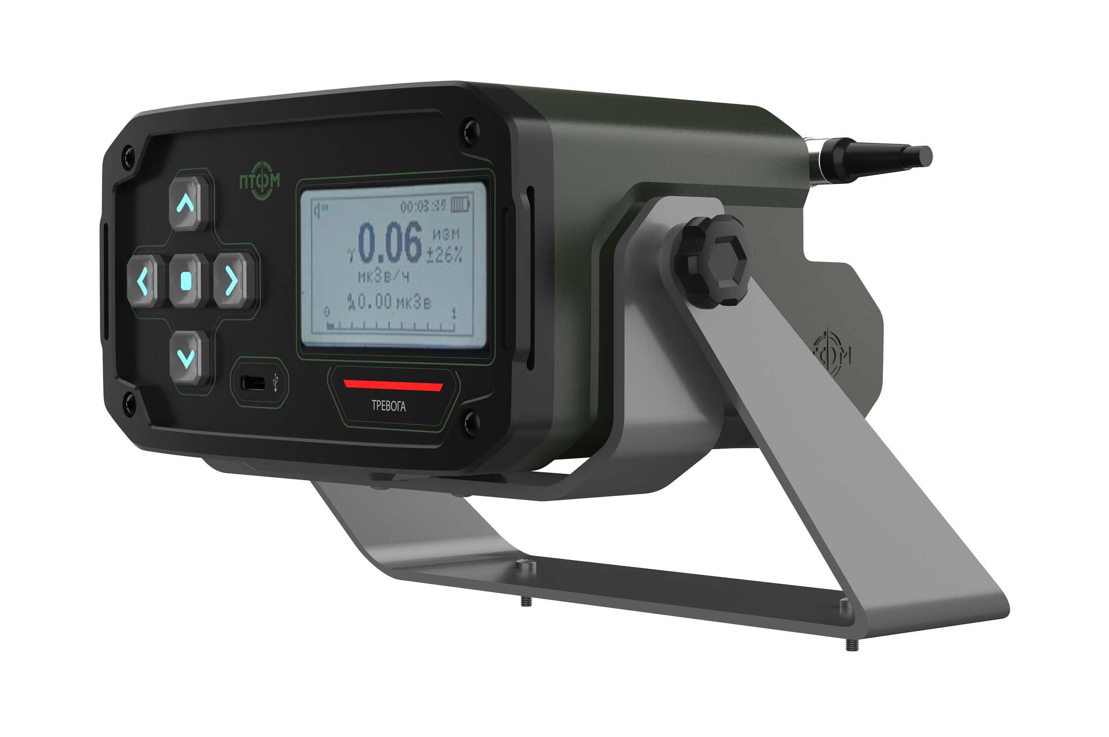 Состав корпуса – основная часть с аккумуляторным отсеком и его крышкой плюс передняя панель. Внешние элементы – монитор за защитным стеклом, прорезиненная клавиатура с подсветкой кнопок, обязательная индикация превышения порога (красного цвета), защищенный разъем для наушников (только для носимого варианта, в других версиях будет заглушка), разъемы для передачи данных от внешних блоков, питания и сети. Для носимого исполнения нужны крепление плечевого ремня, клипса для ношения пульта на поясном ремне и кронштейн для крепления к стене (размещения на столе и подвешивания под потолком).