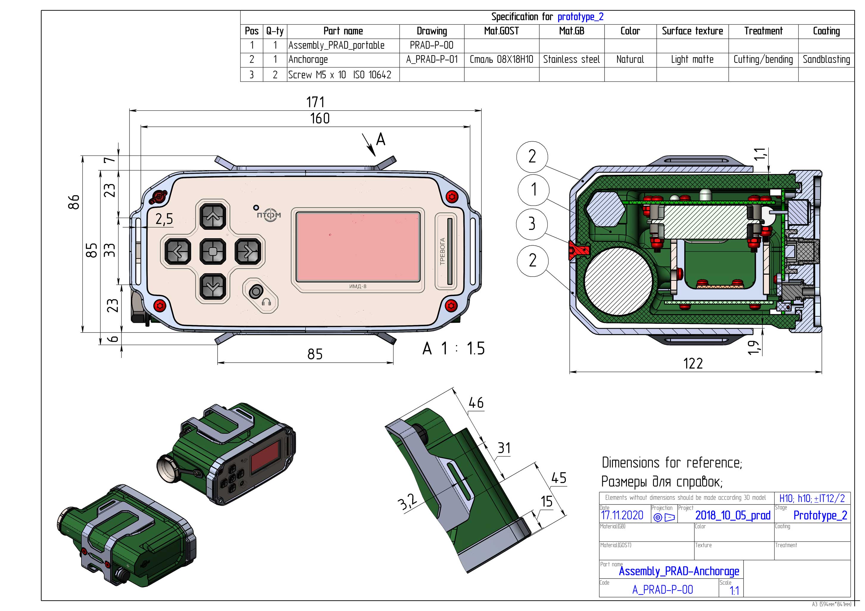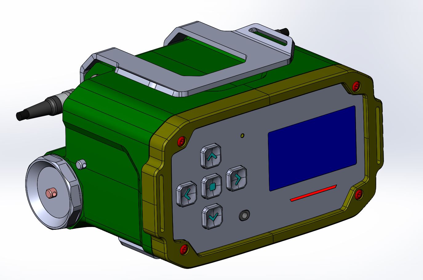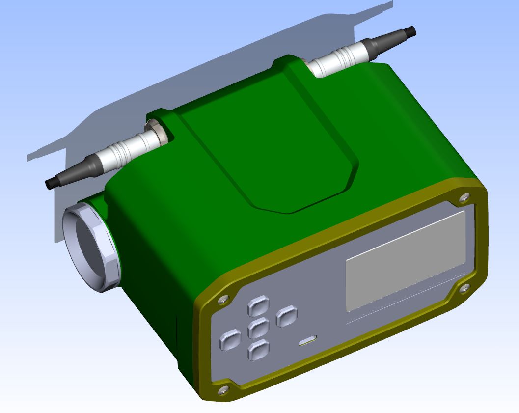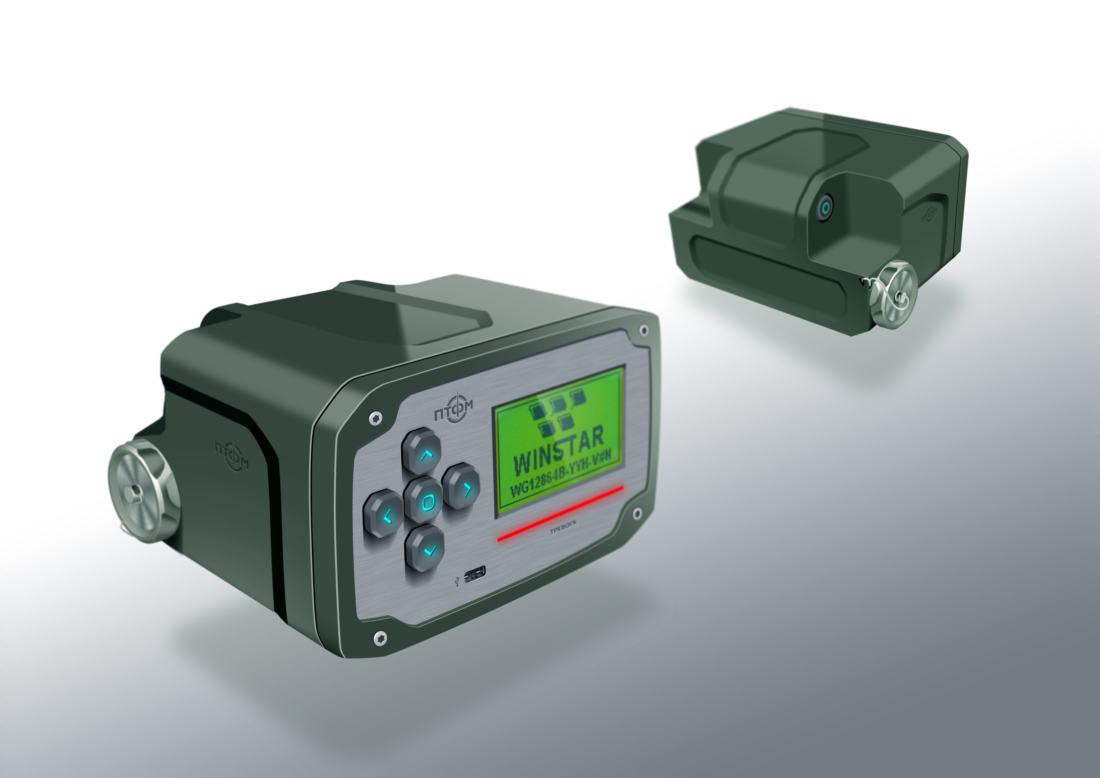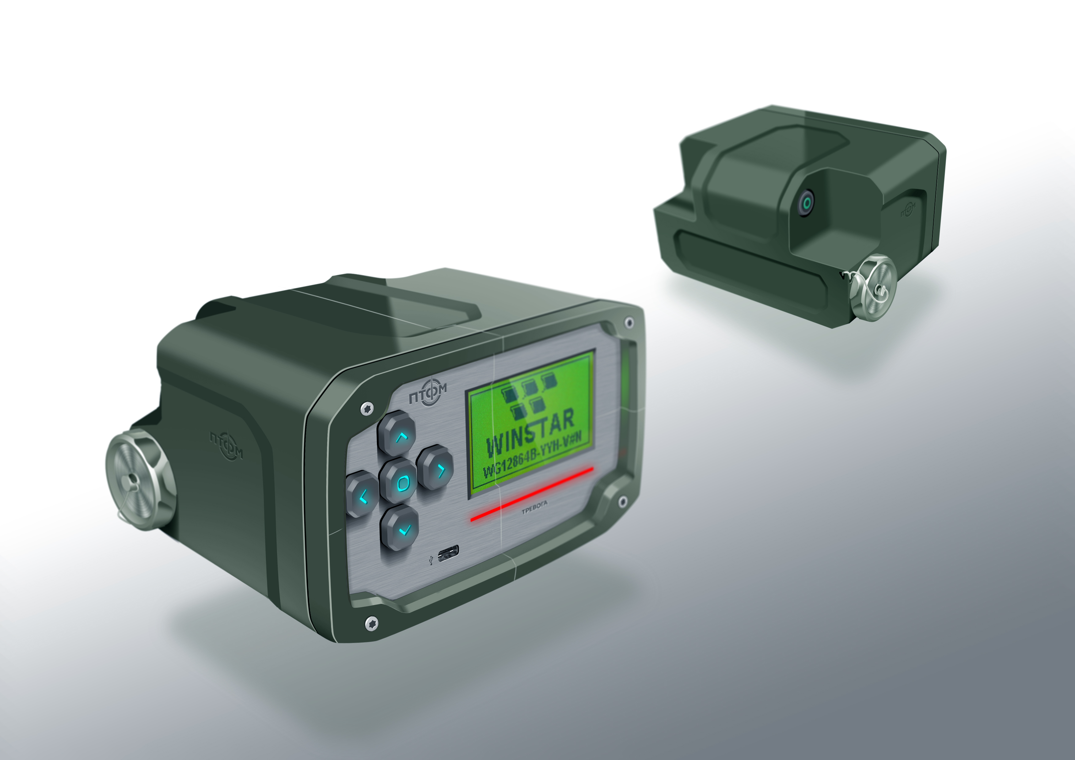 Состав корпуса – основная часть с аккумуляторным отсеком и его крышкой плюс передняя панель. Внешние элементы – монитор за защитным стеклом, прорезиненная клавиатура с подсветкой кнопок, обязательная индикация превышения порога (красного цвета), защищенный разъем для наушников (только для носимого варианта, в других версиях будет заглушка), разъемы для передачи данных от внешних блоков, питания и сети. Для носимого исполнения нужны крепление плечевого ремня, клипса для ношения пульта на поясном ремне и кронштейн для крепления к стене (размещения на столе и подвешивания под потолком).