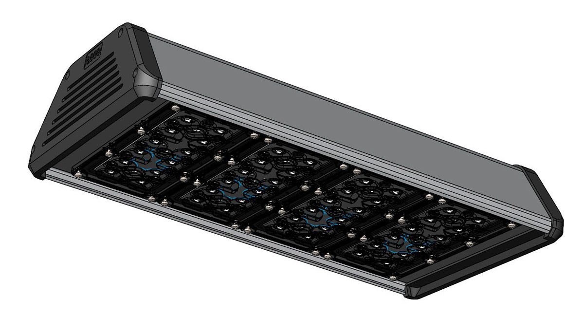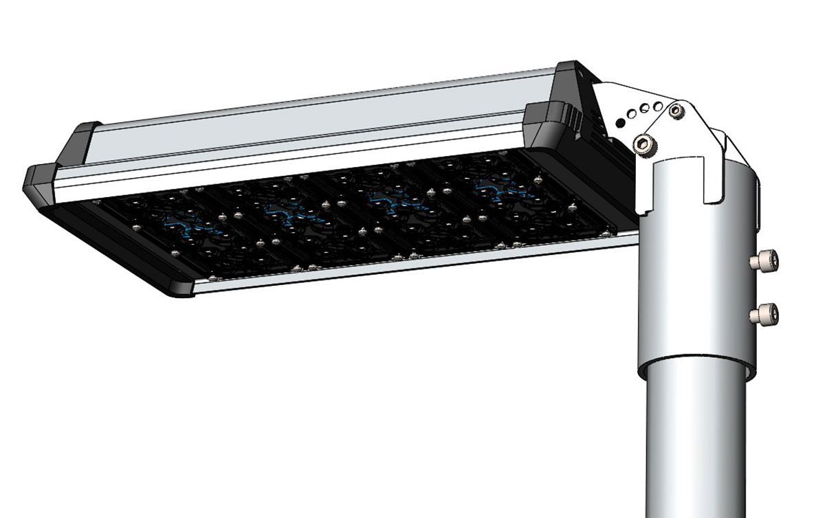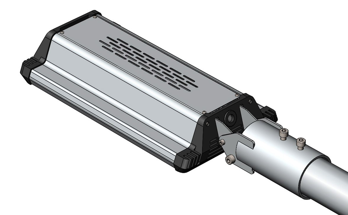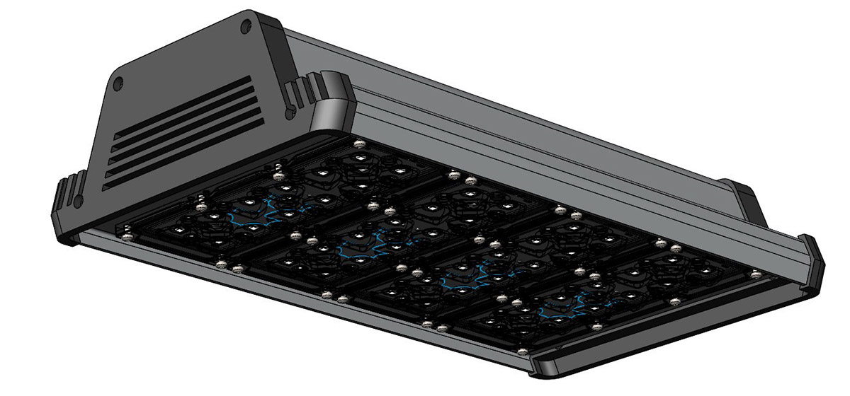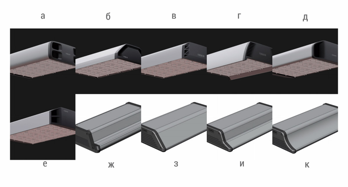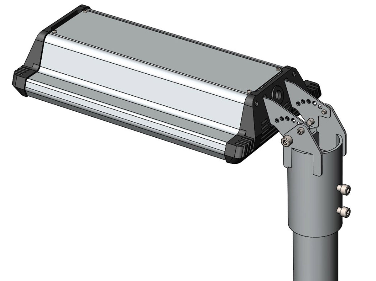 Корпус промышленного светильника будет выполнен из анодированного алюминиевого профиля — без внешнего оребрения. В нём должен быть отдельный отсек для источника питания со степенью защиты IP 54, который закрывается от прямого попадания осадков и пыли выдвижной планкой. При необходимости источник планируется менять без демонтажа светильника, сразу на высоте.