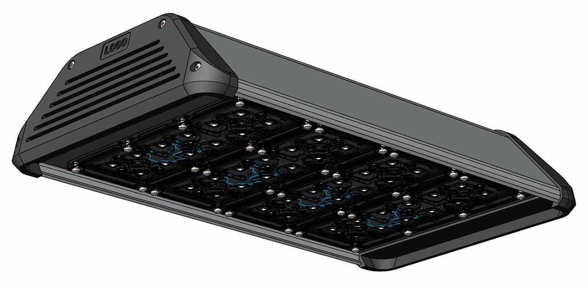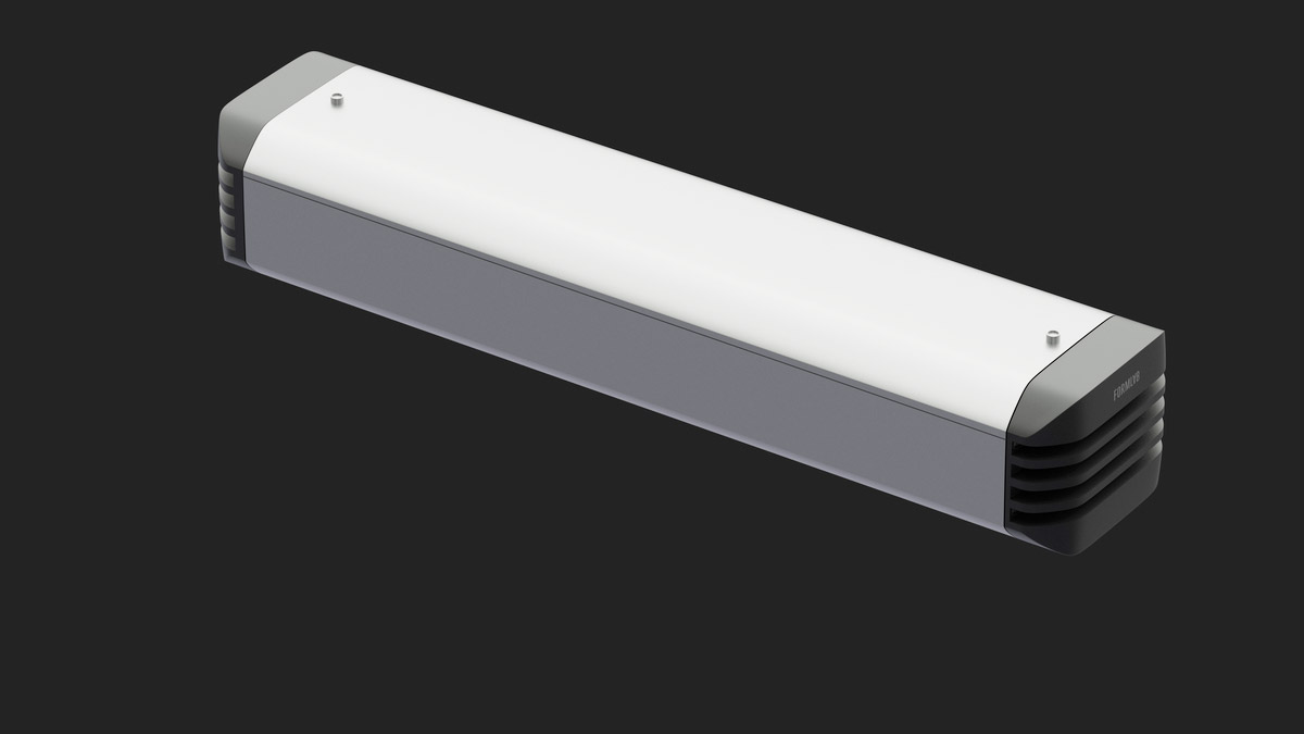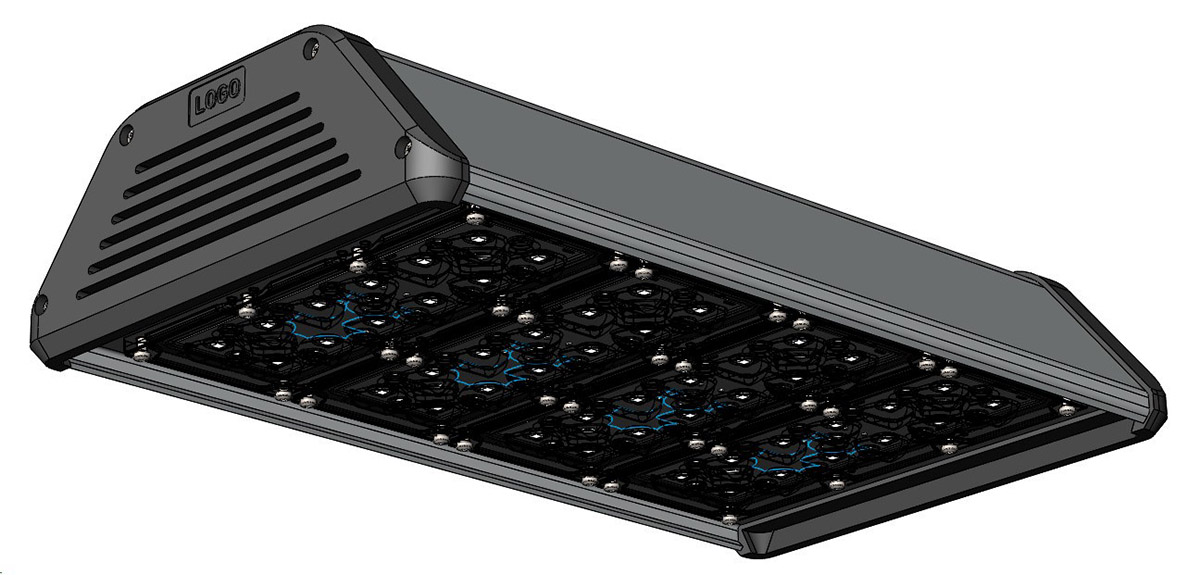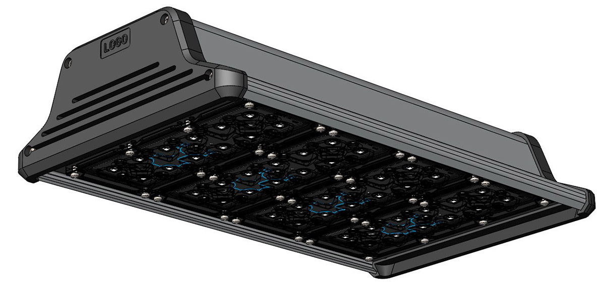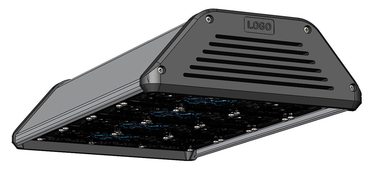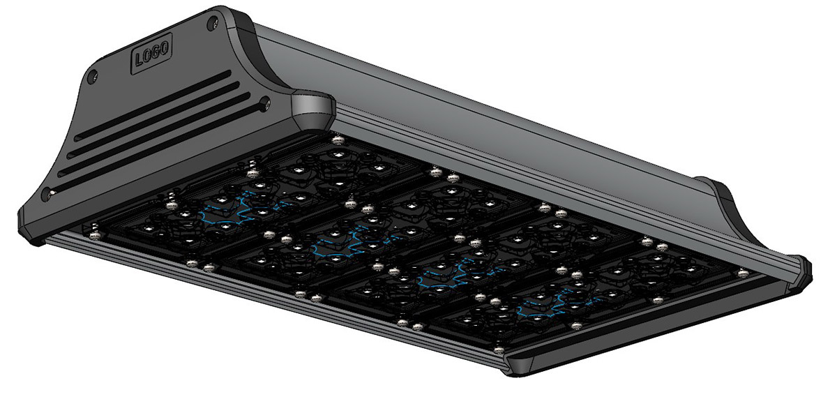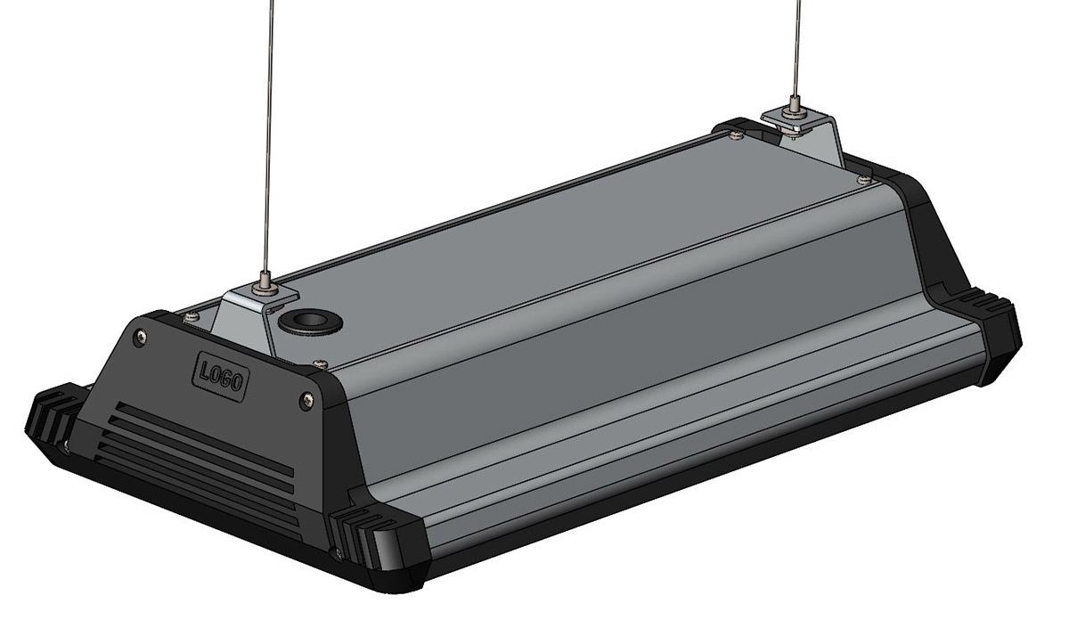 Корпус промышленного светильника будет выполнен из анодированного алюминиевого профиля — без внешнего оребрения. В нём должен быть отдельный отсек для источника питания со степенью защиты IP 54, который закрывается от прямого попадания осадков и пыли выдвижной планкой. При необходимости источник планируется менять без демонтажа светильника, сразу на высоте.