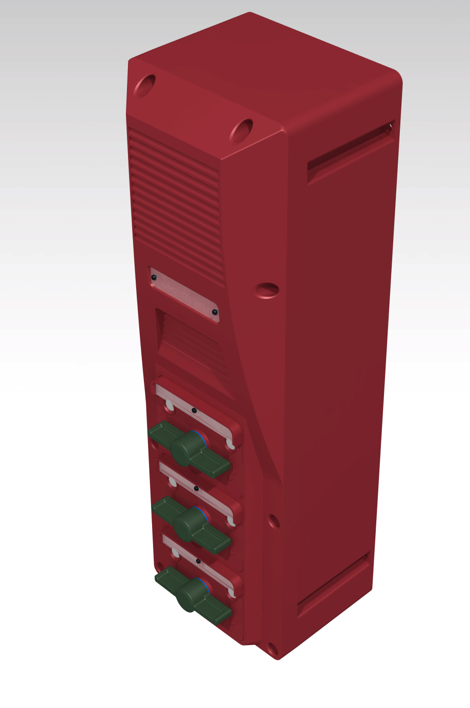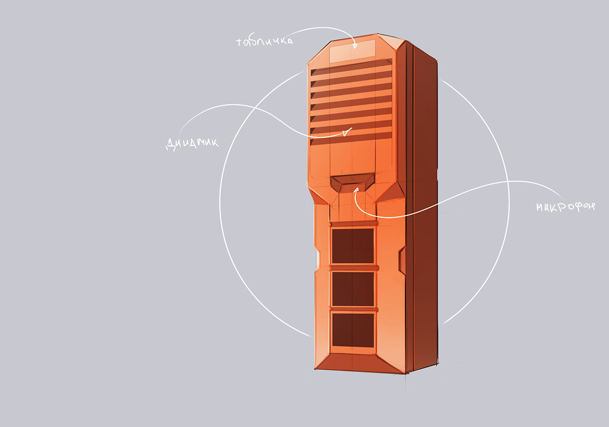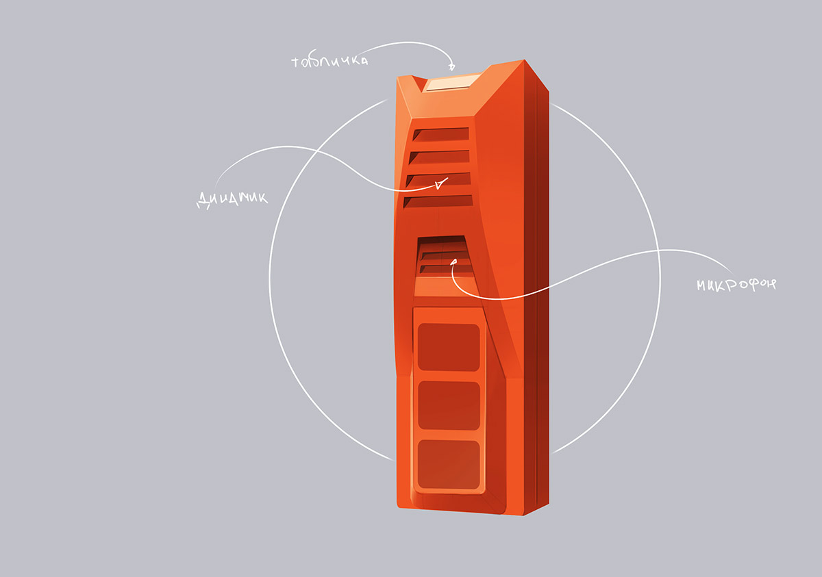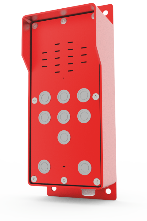 В нижней части — 3-4 кабельных ввода, на лицевой панели (в верхней части) — динамик, далее — микрофон, универсальные слоты для установки органов управления: кнопок-качелей, панели с несколькими кнопками, тастатуры для набора номера (разработка всех трёх типов панелей, и с одной кнопкой, и с несколькими, и с тастатурой — тоже наша задача).