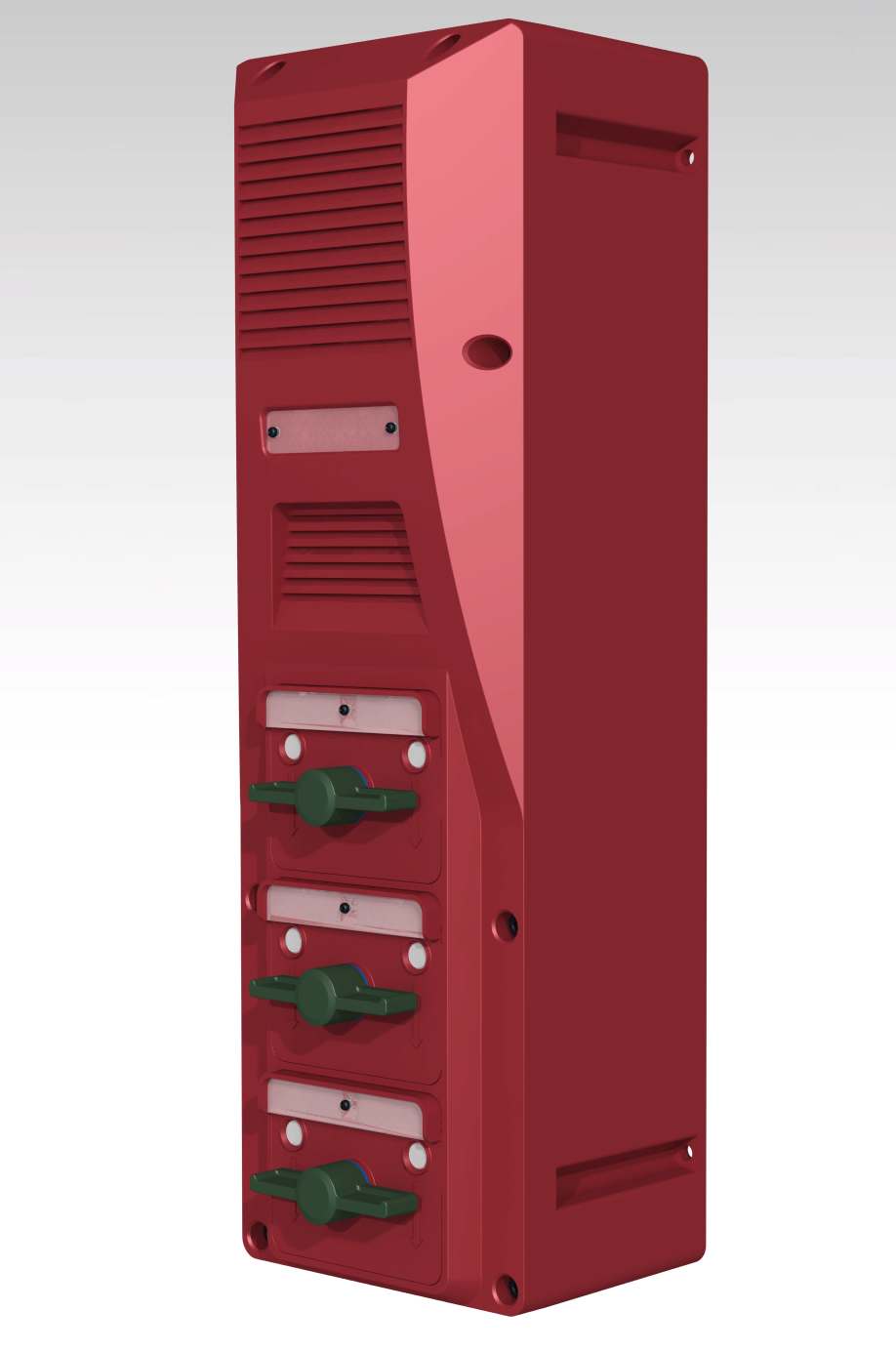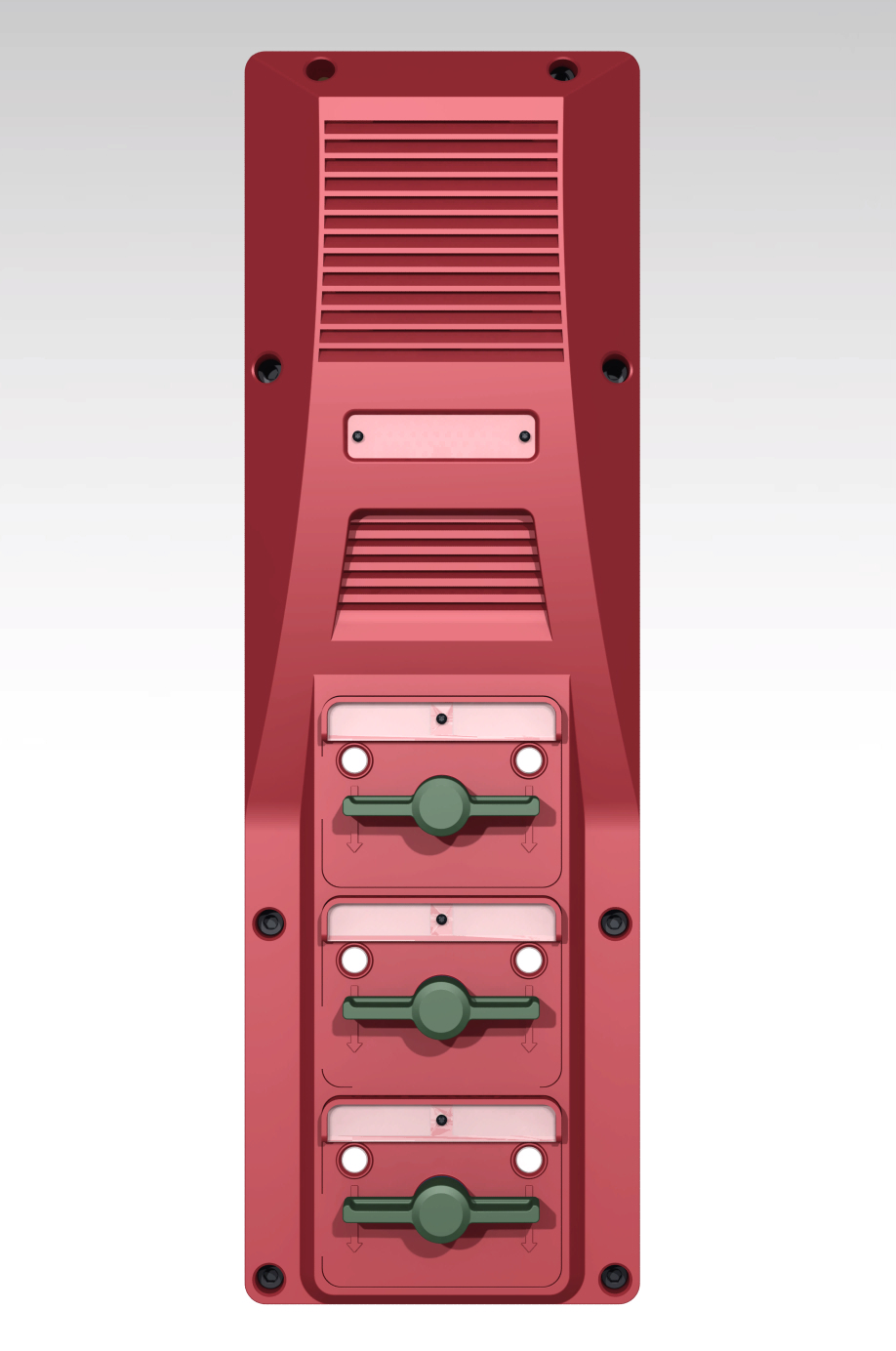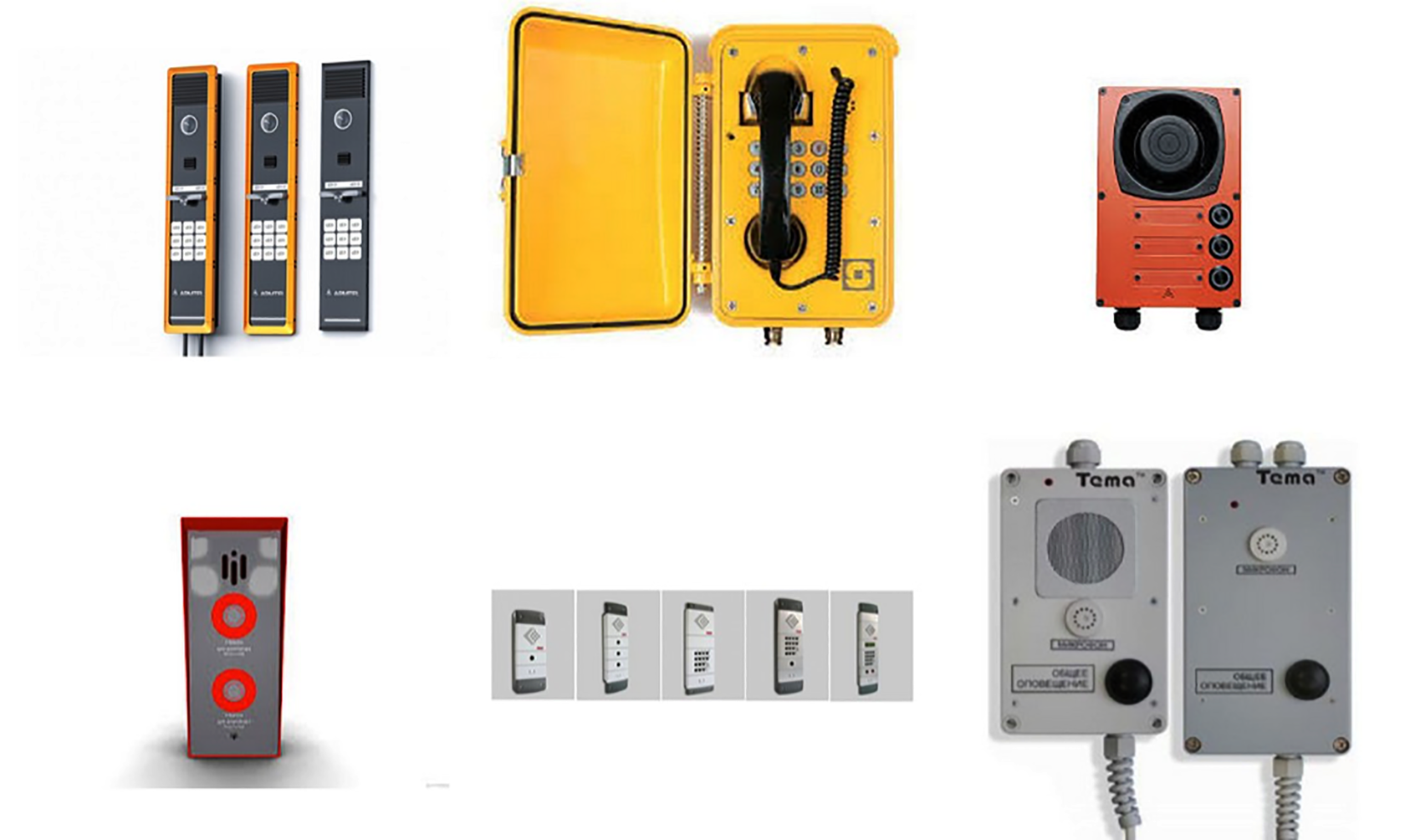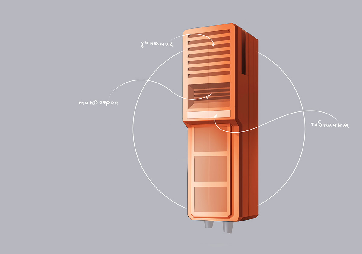 В нижней части — 3-4 кабельных ввода, на лицевой панели (в верхней части) — динамик, далее — микрофон, универсальные слоты для установки органов управления: кнопок-качелей, панели с несколькими кнопками, тастатуры для набора номера (разработка всех трёх типов панелей, и с одной кнопкой, и с несколькими, и с тастатурой — тоже наша задача).