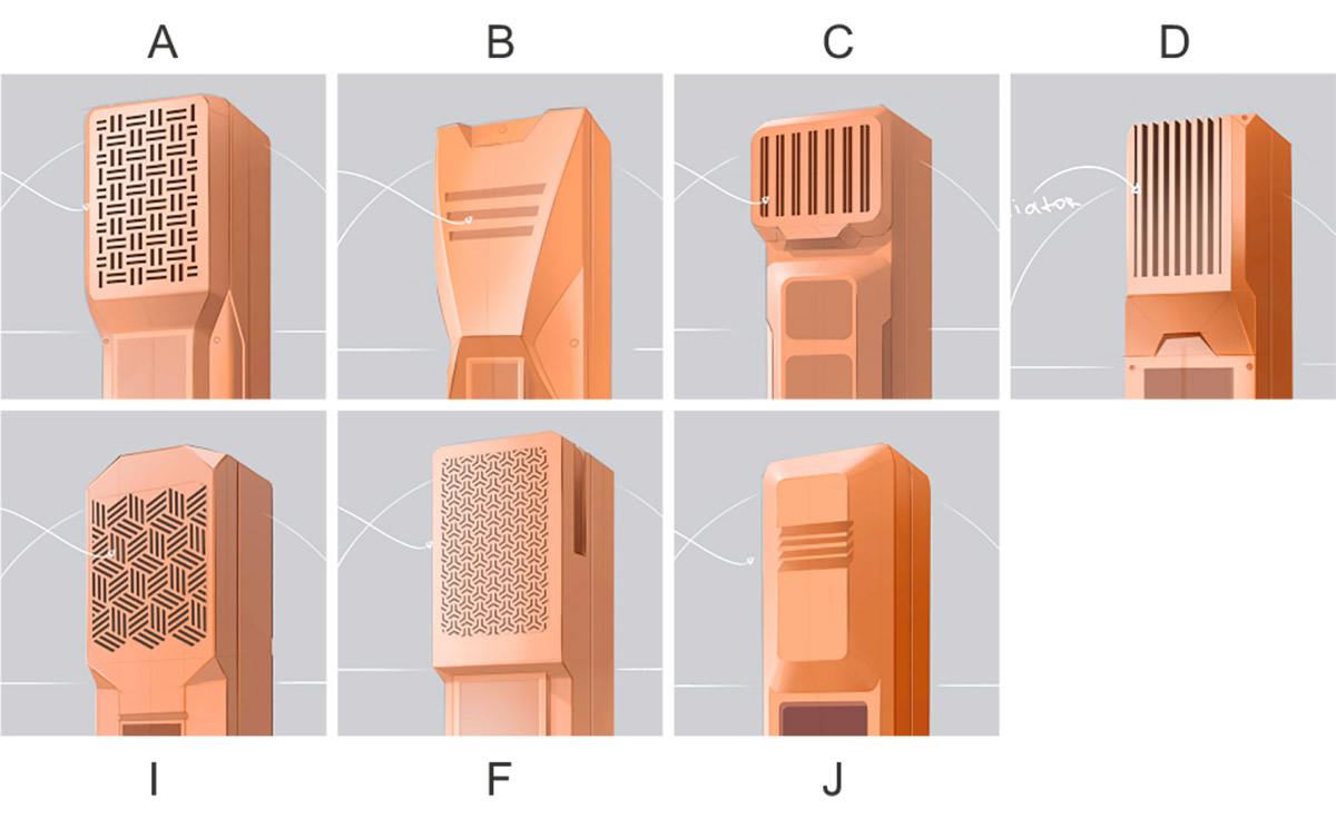Некоторые варианты отмели сразу. В верхней части переговорного устройства располагается динамик (а у нас, как показалось заказчику, получилось что-то, похожее на радиатор). Но основная проблема заключается в том, что все вариации с мелкими и вертикальными отверстиями отпадают: поскольку устройство всепогодное и может быть прикручено где угодно, то мелкие отверстия почти наверняка забьются снегом и льдом. А в вертикальные будет попадать вода.