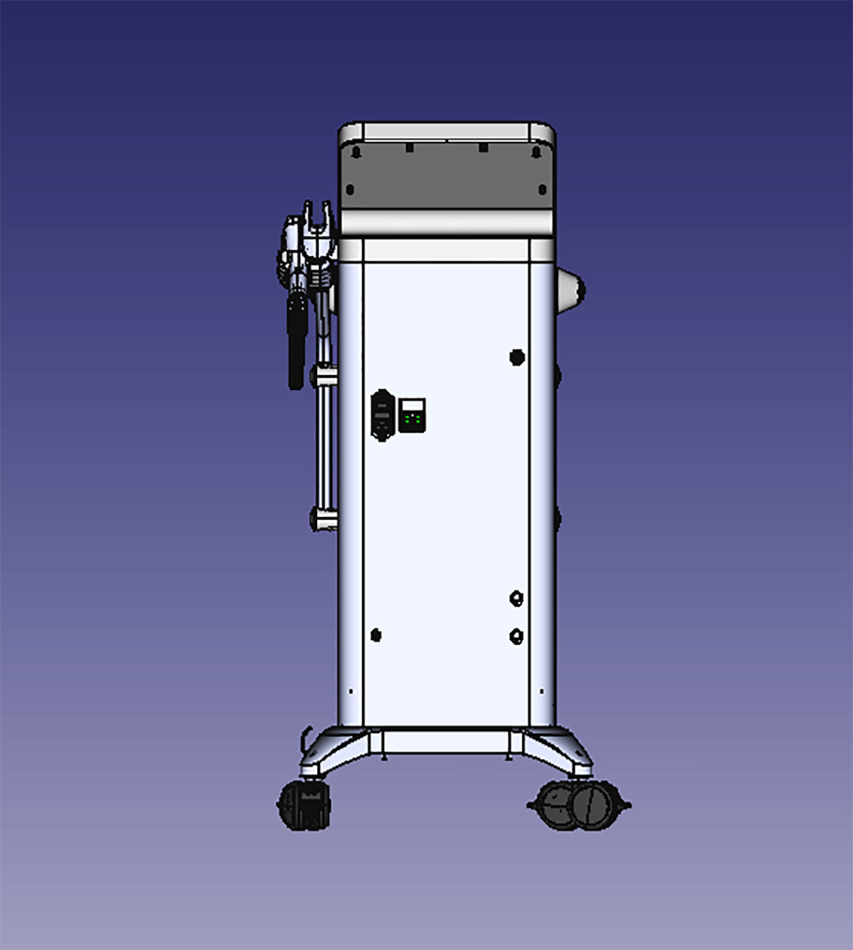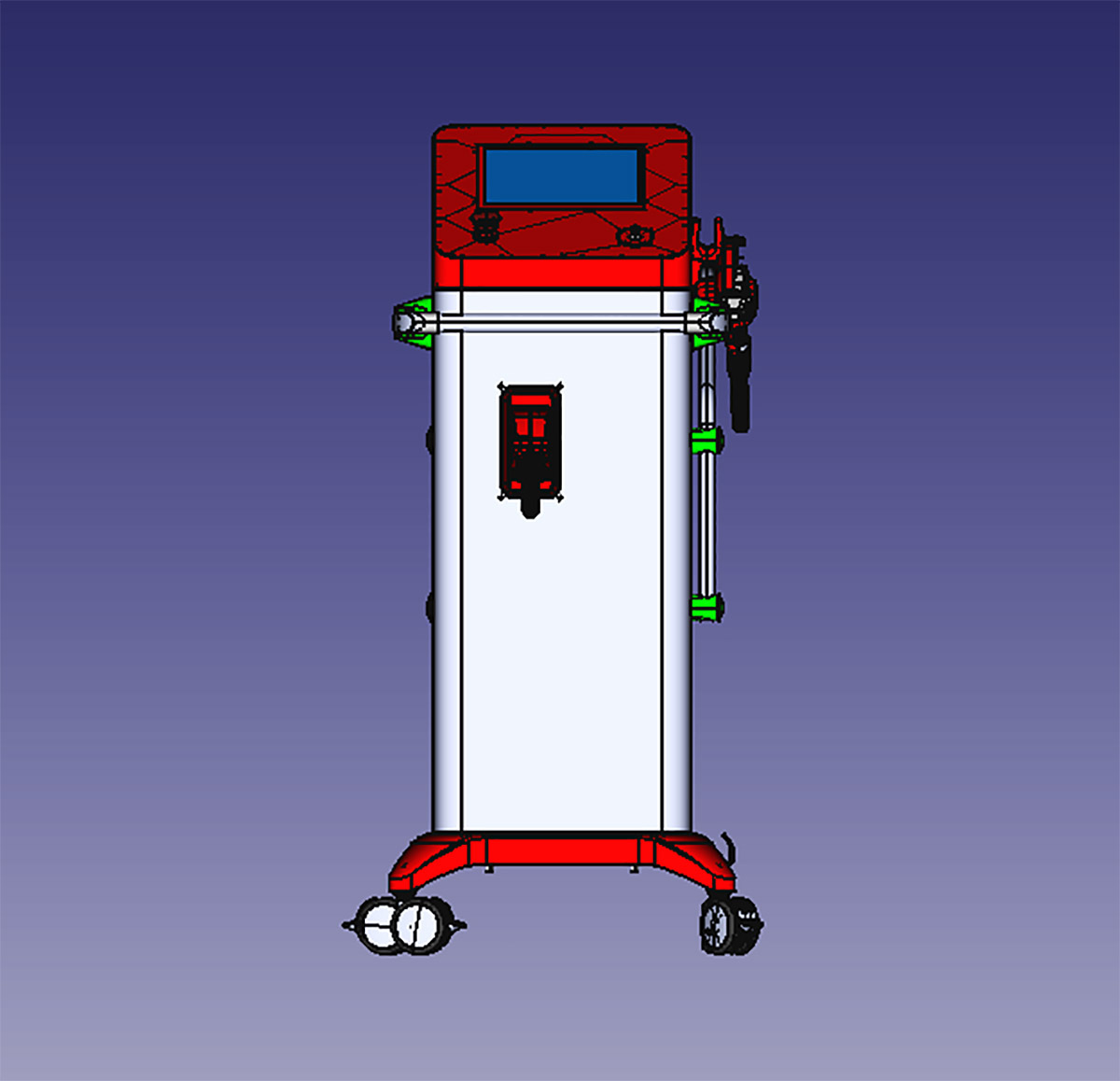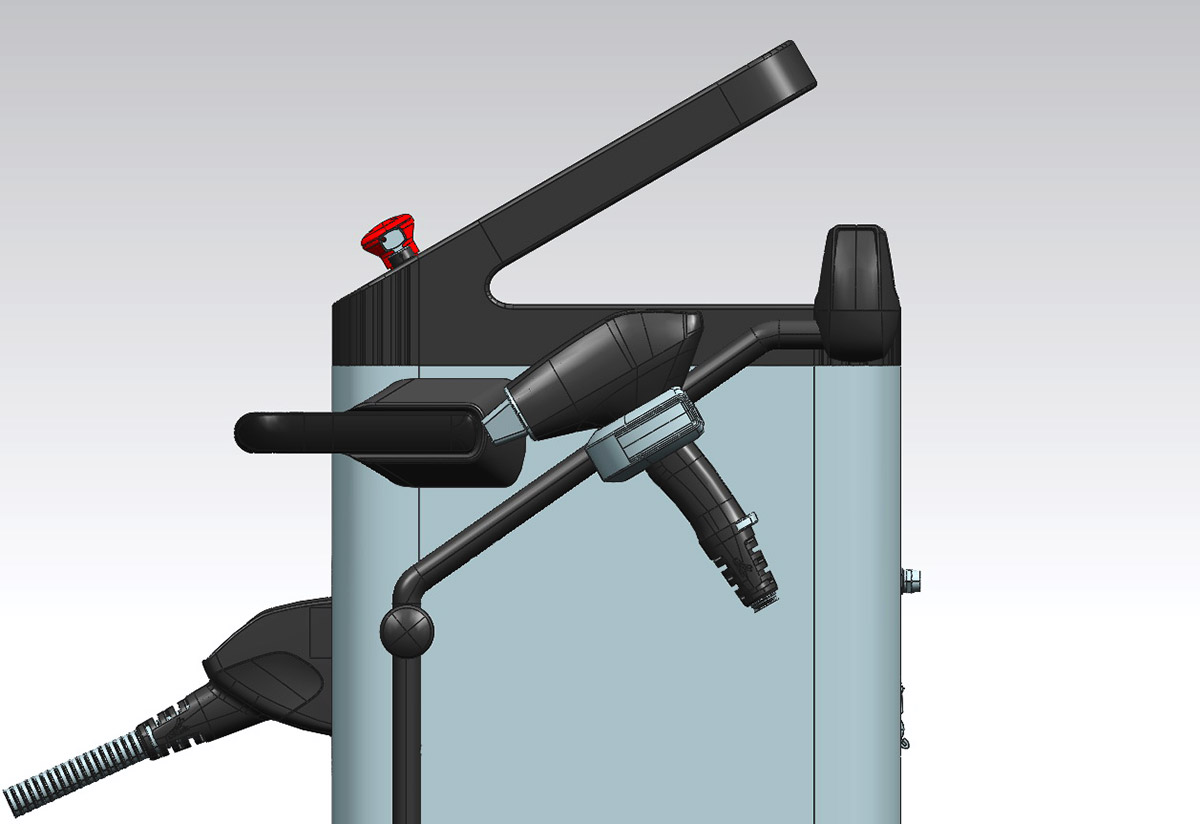 Схема работы аппарата: оператор включает аппарат поворотом ключа, загорается светодиод. Теперь можно выбрать на дисплее нужную программу. После этого оператор достаёт рукоятку из держателя, штанга поворачивается на 180° или удобный пользователю угол. Если шланг своей массой начнёт тянуть рукоятку вниз, его можно закрепить (на картинке это синяя деталь).