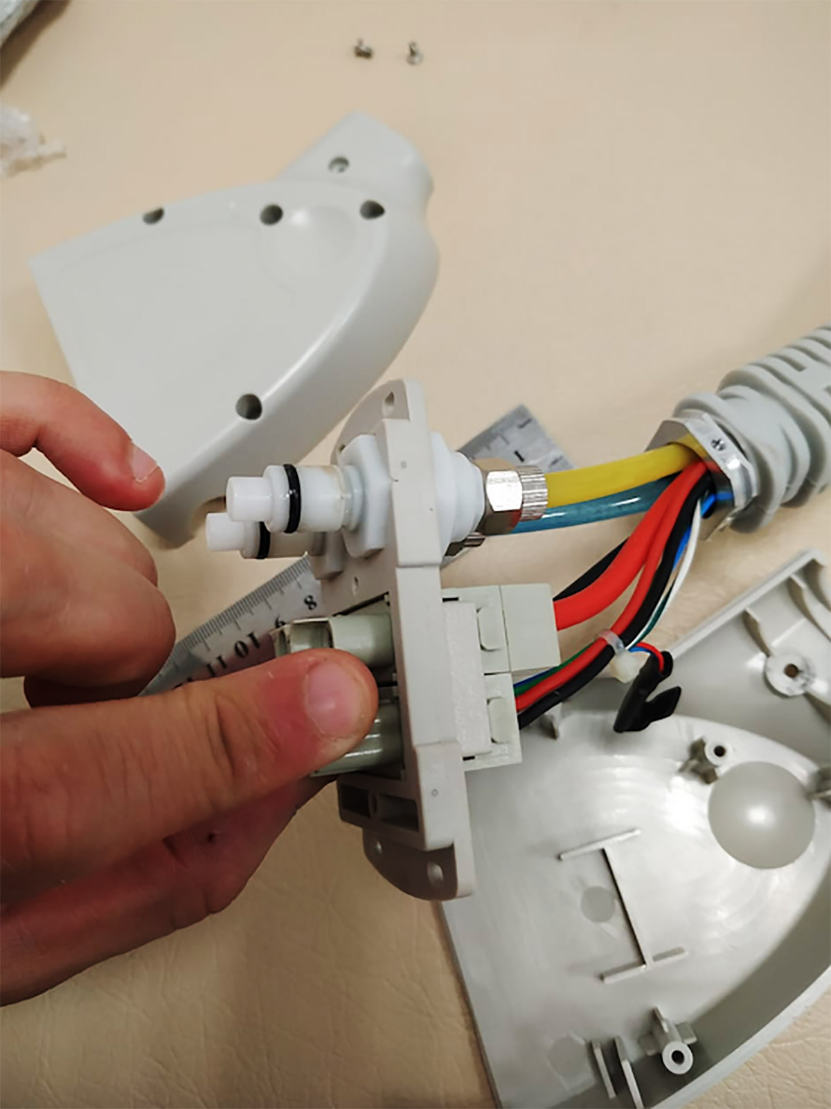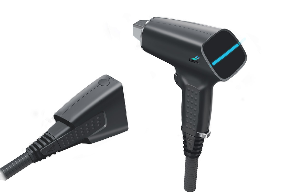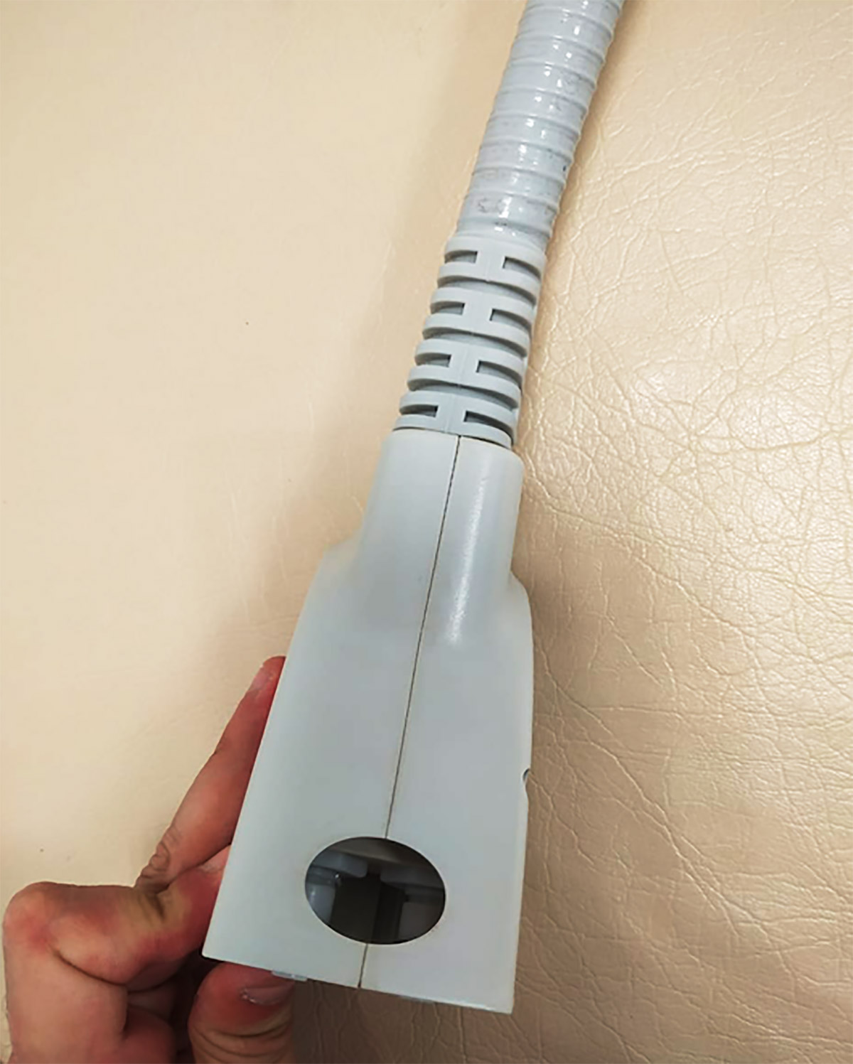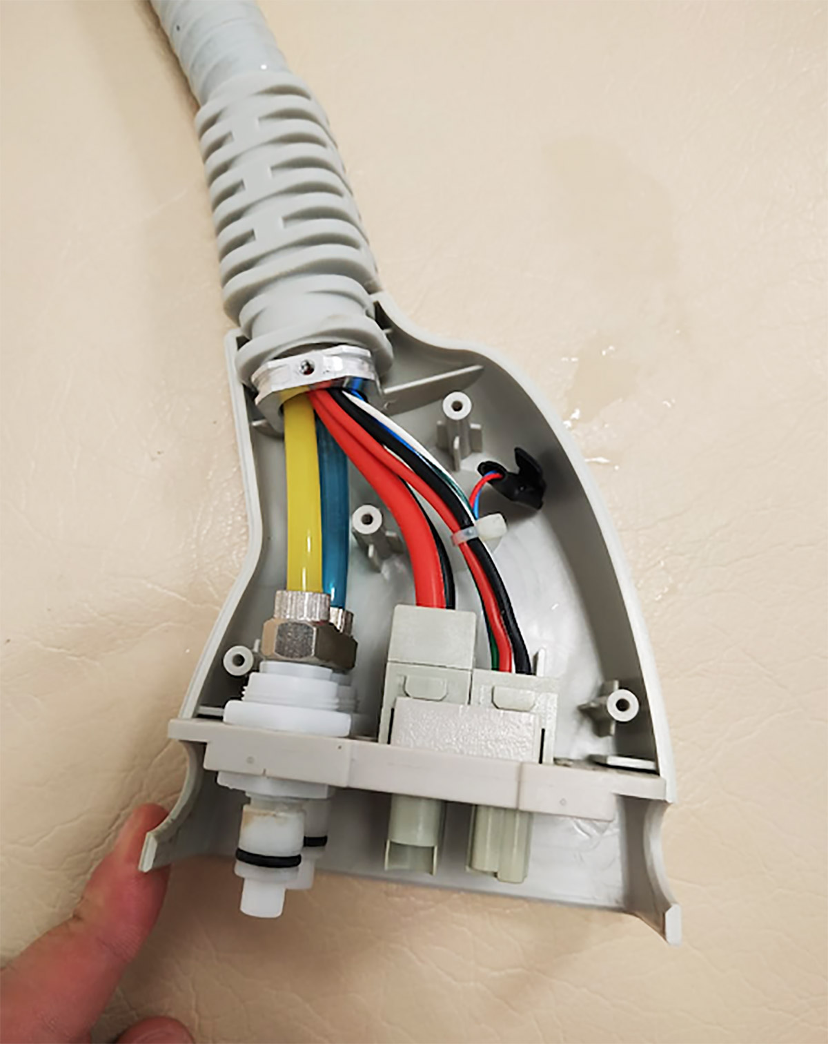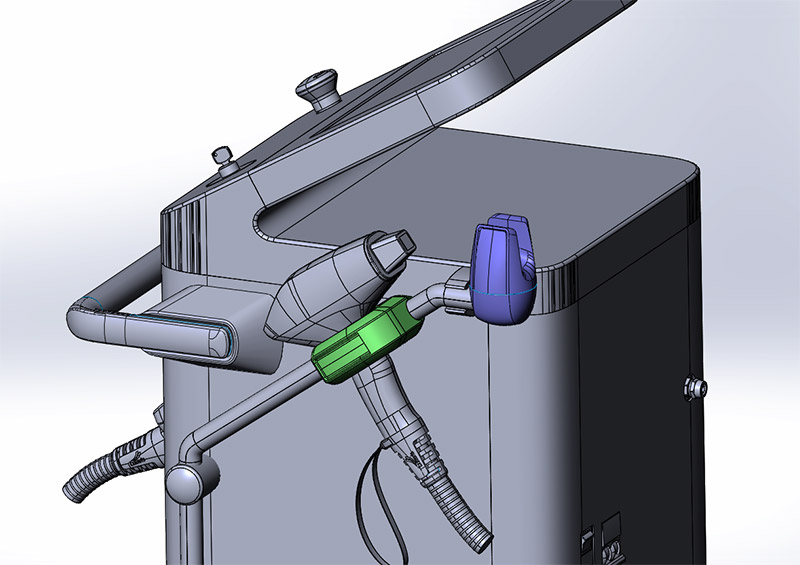 Конструкция у аппарата довольно сложная — достаточно много электронных компонентов. «Наши» объекты — корпус с дисплеем и сенсорной панелью, стоящий на опорной площадке с колёсами, и насадка с коннектором и шлангом. Герметичная насадка с металлической головкой оснащена светодиодной подсветкой, в шланге «спрятаны» трубопровод и кабель.