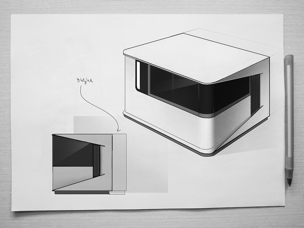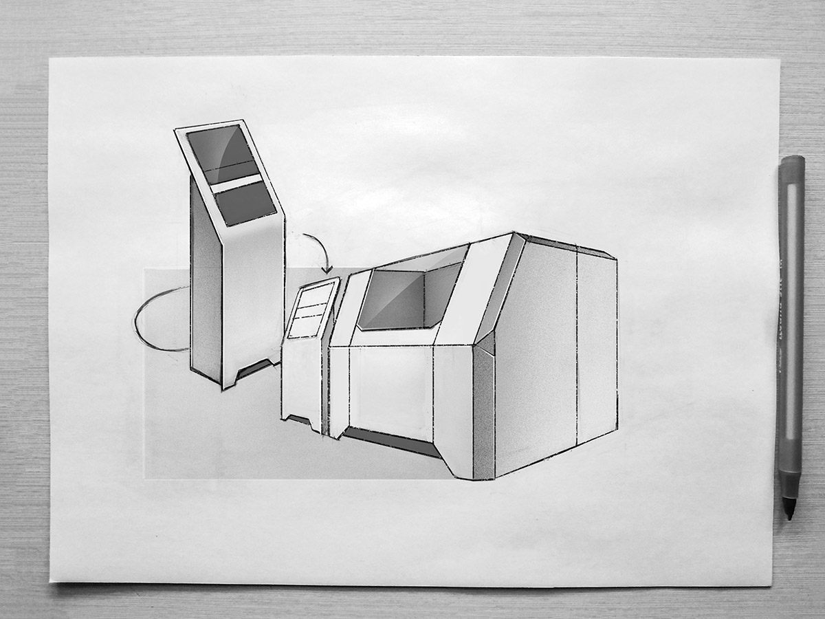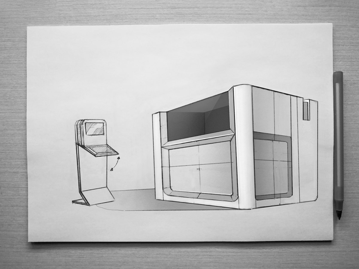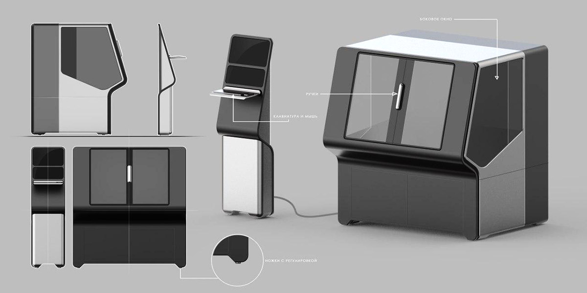 Что же касается дверей для доступа к рабочей камере, то их не будет. Нужна одна большая сдвижная дверь, смещённая в правую сторону. А на место, которое освободится с противоположной стороны, можно установить монитор, например. В крайнем случае — разместить там логотип производителя.