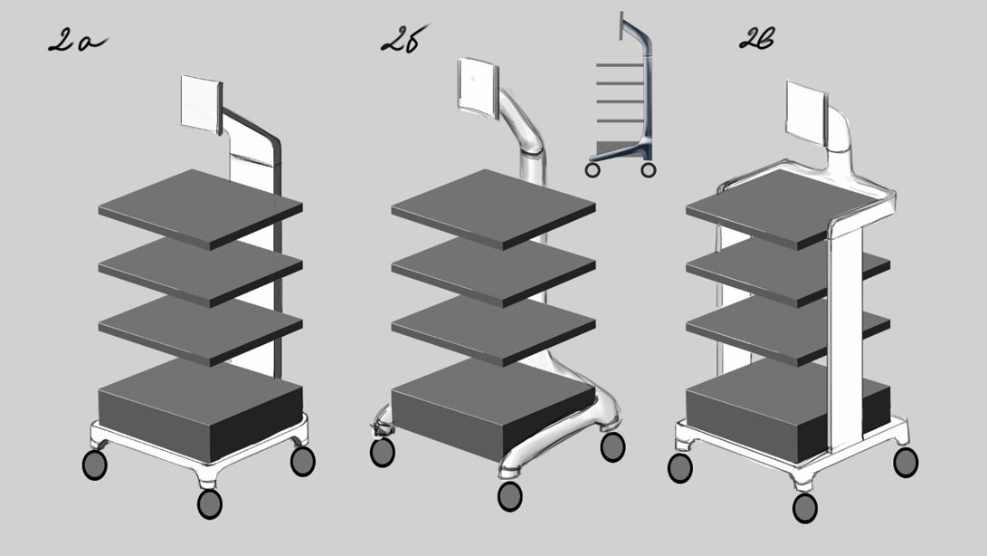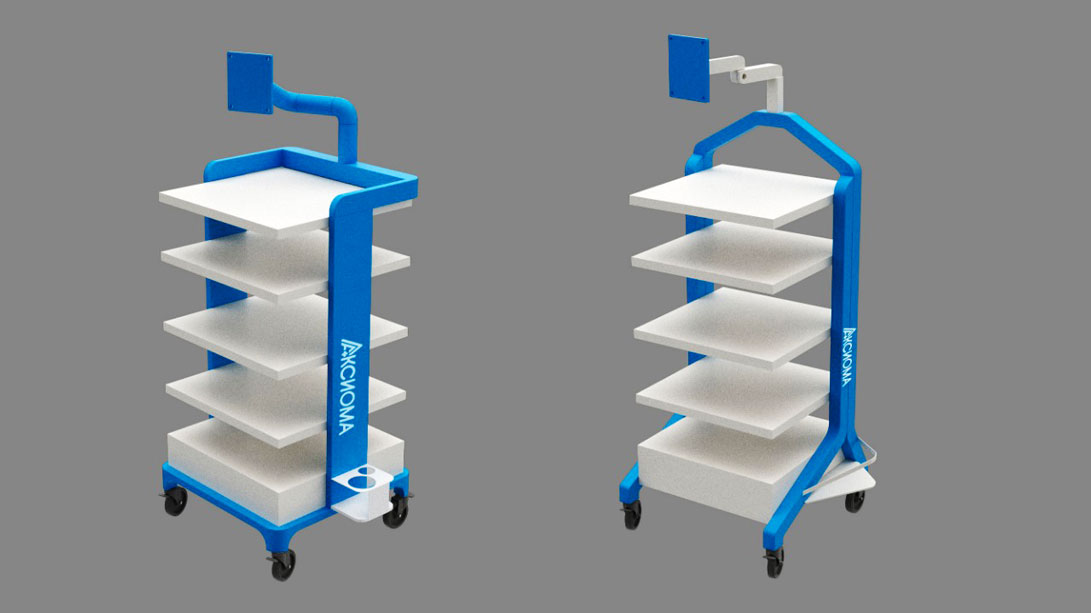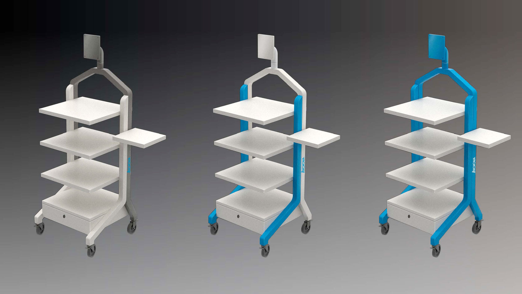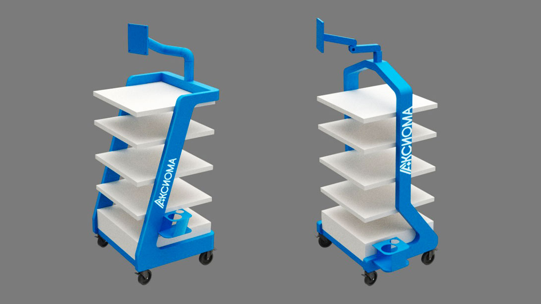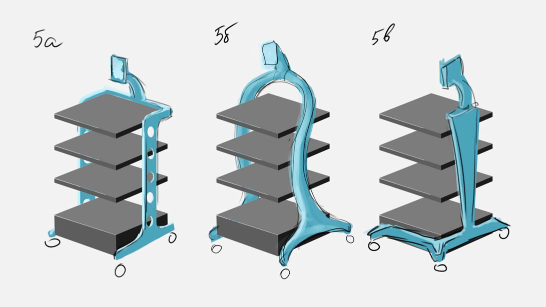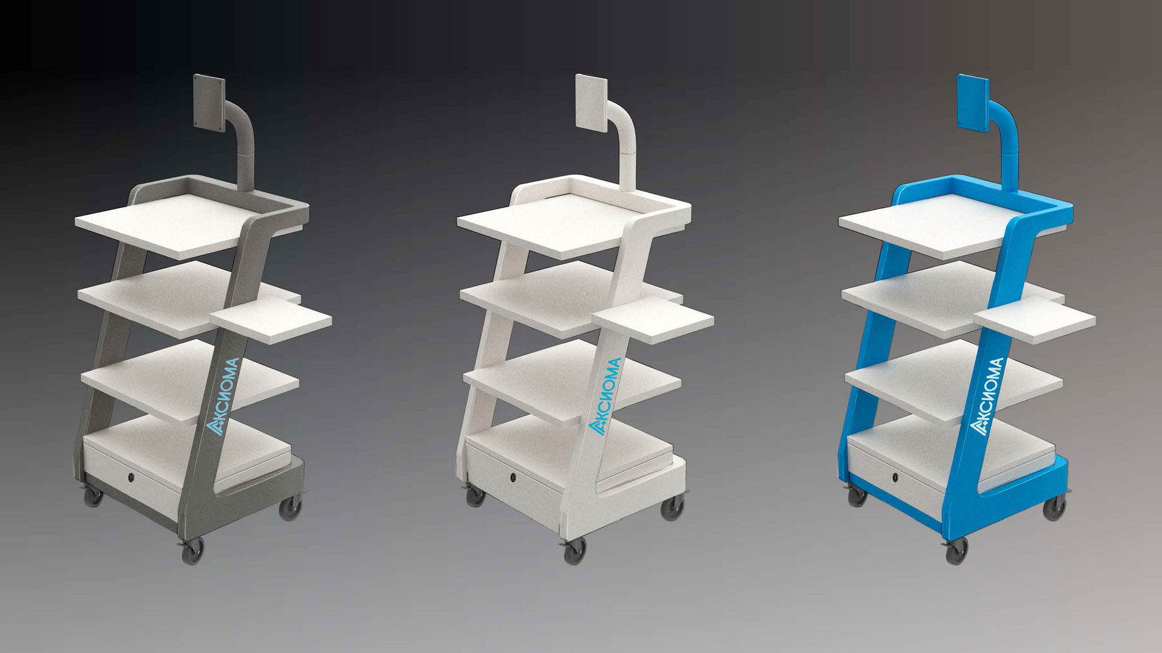 Нас ждёт обновление дизайна очень простой и одновременно сложной конструкции — металлической медицинской стойки. Простая она потому, что в её составе всего лишь пять полок и один ящик, рама, шасси с колёсами и два крепления — одно для монитора, другое — внешнее для медицинских ёмкостей.