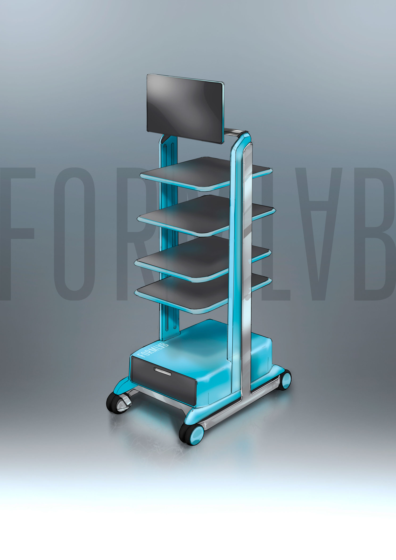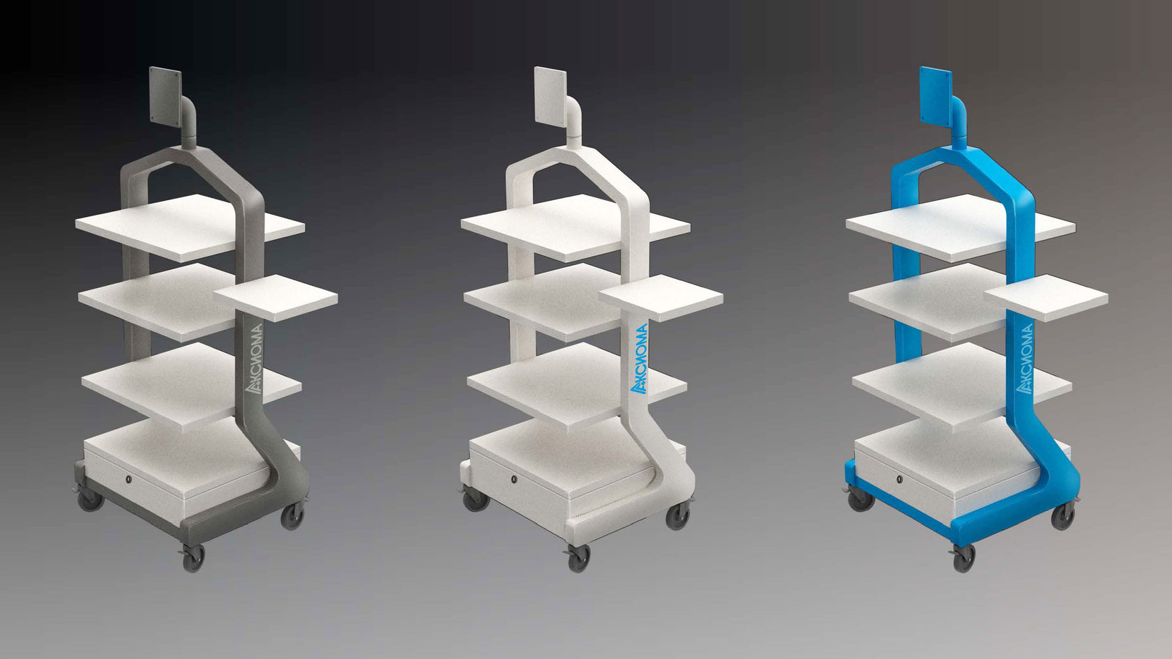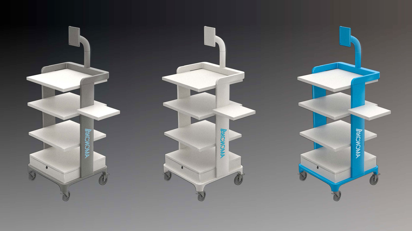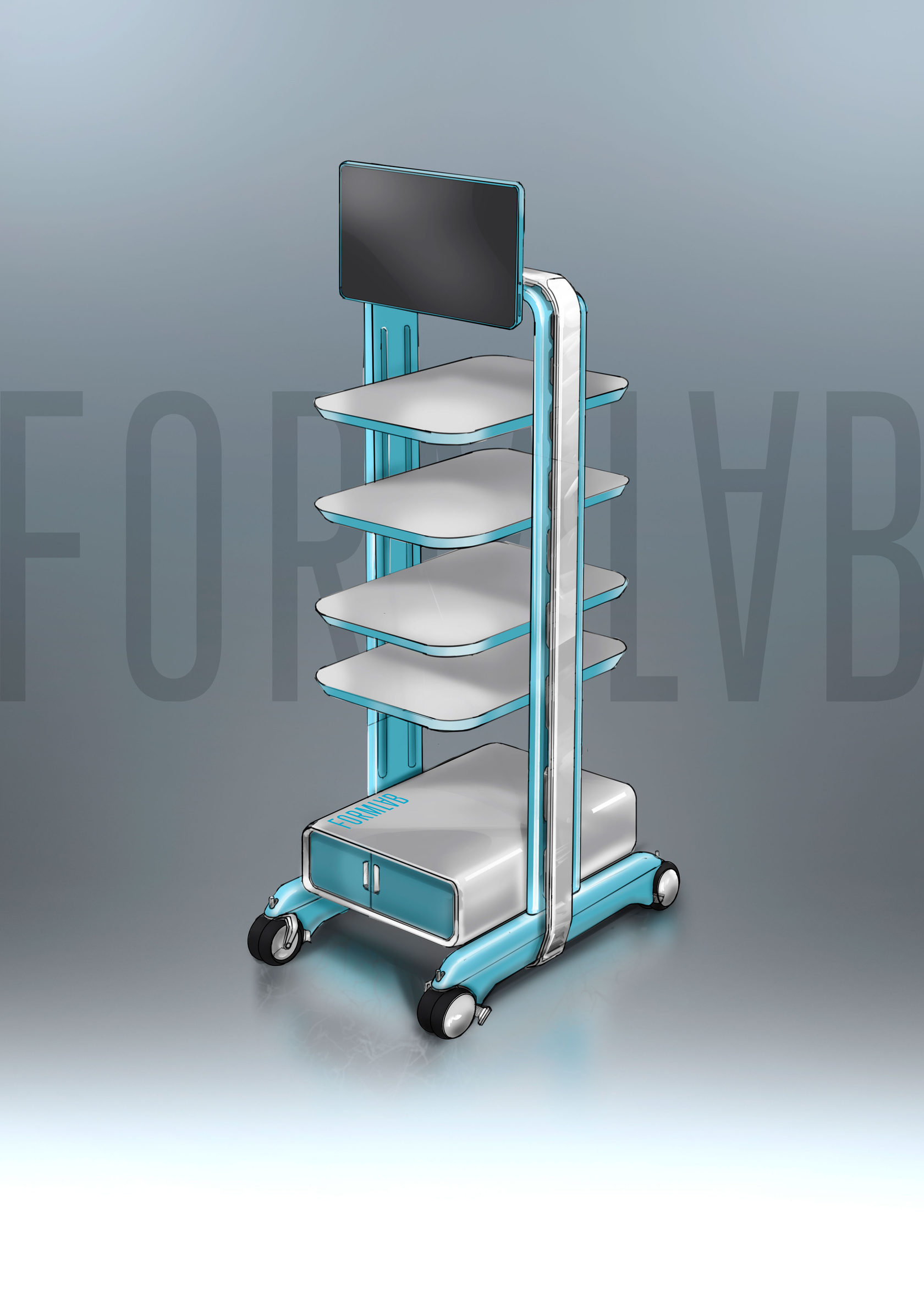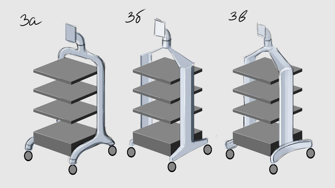 Нас ждёт обновление дизайна очень простой и одновременно сложной конструкции — металлической медицинской стойки. Простая она потому, что в её составе всего лишь пять полок и один ящик, рама, шасси с колёсами и два крепления — одно для монитора, другое — внешнее для медицинских ёмкостей.