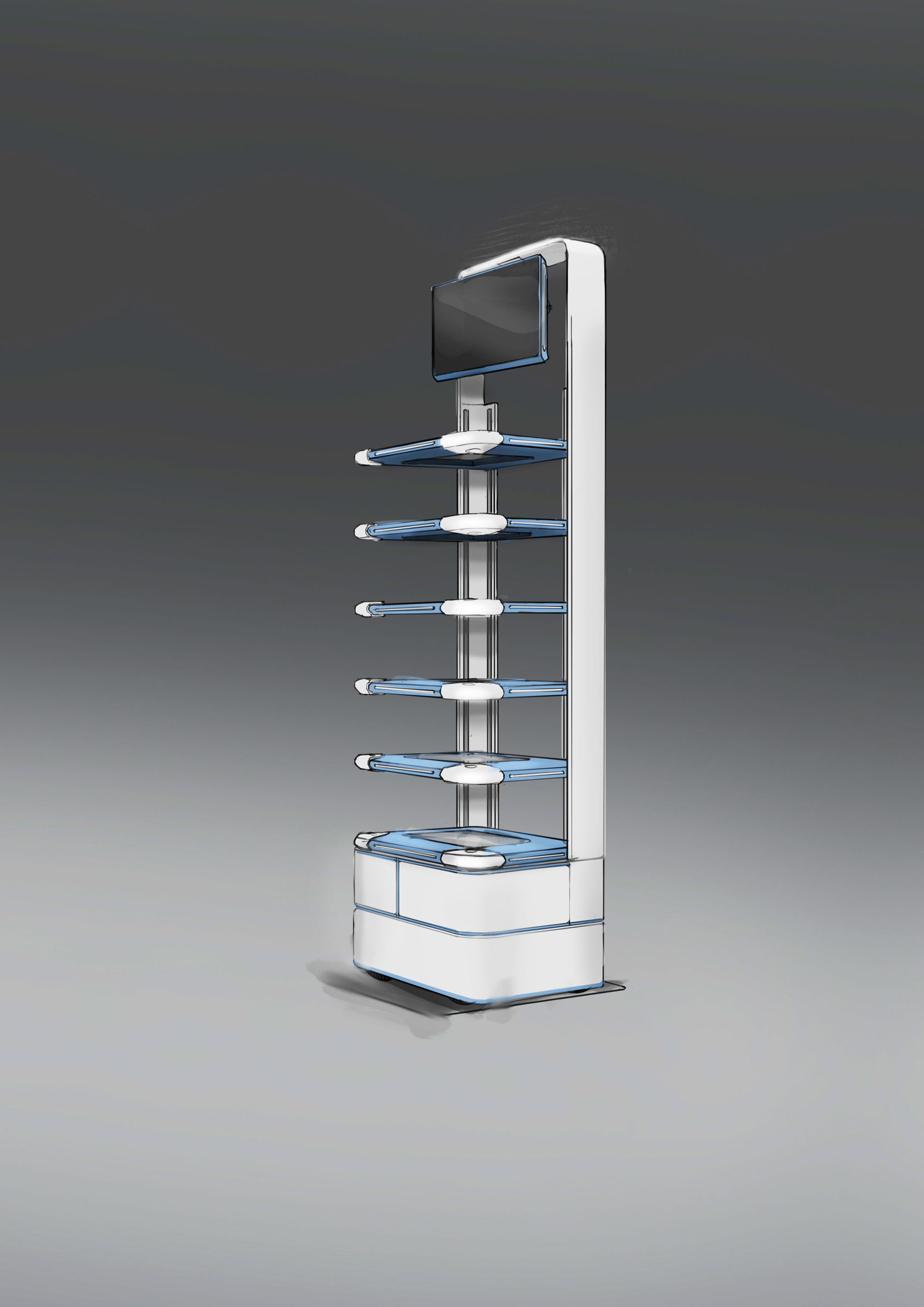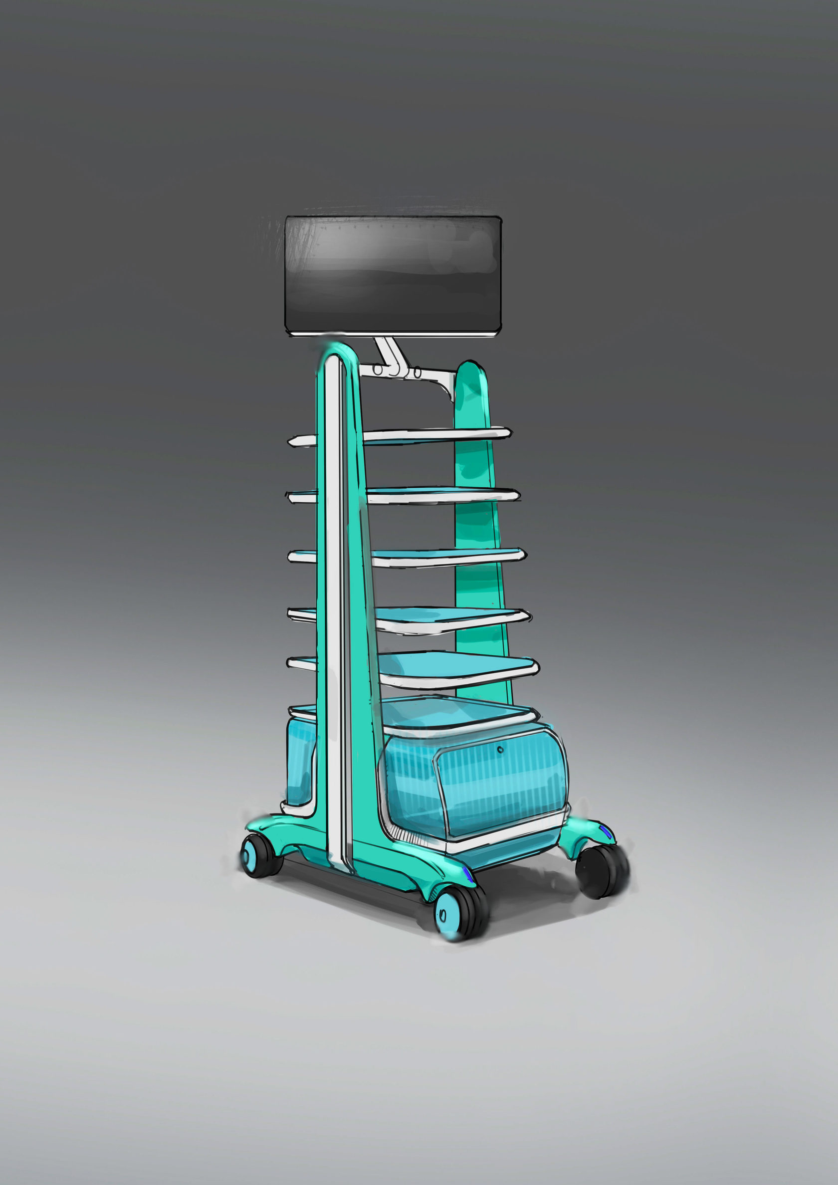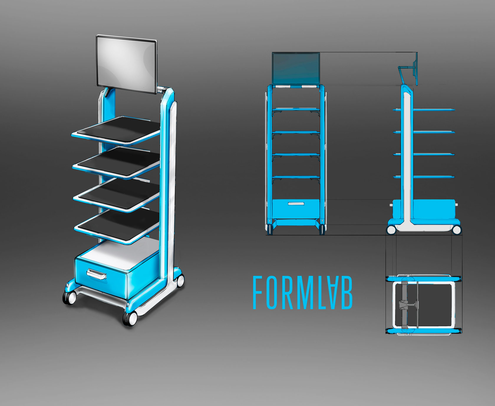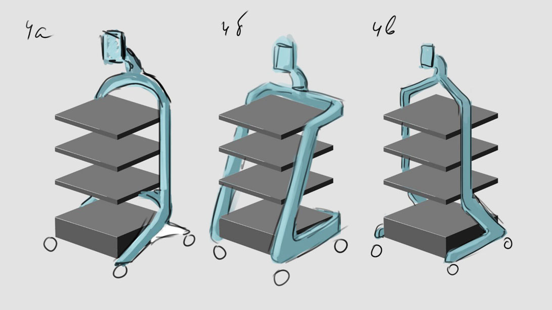 Нас ждёт обновление дизайна очень простой и одновременно сложной конструкции — металлической медицинской стойки. Простая она потому, что в её составе всего лишь пять полок и один ящик, рама, шасси с колёсами и два крепления — одно для монитора, другое — внешнее для медицинских ёмкостей.