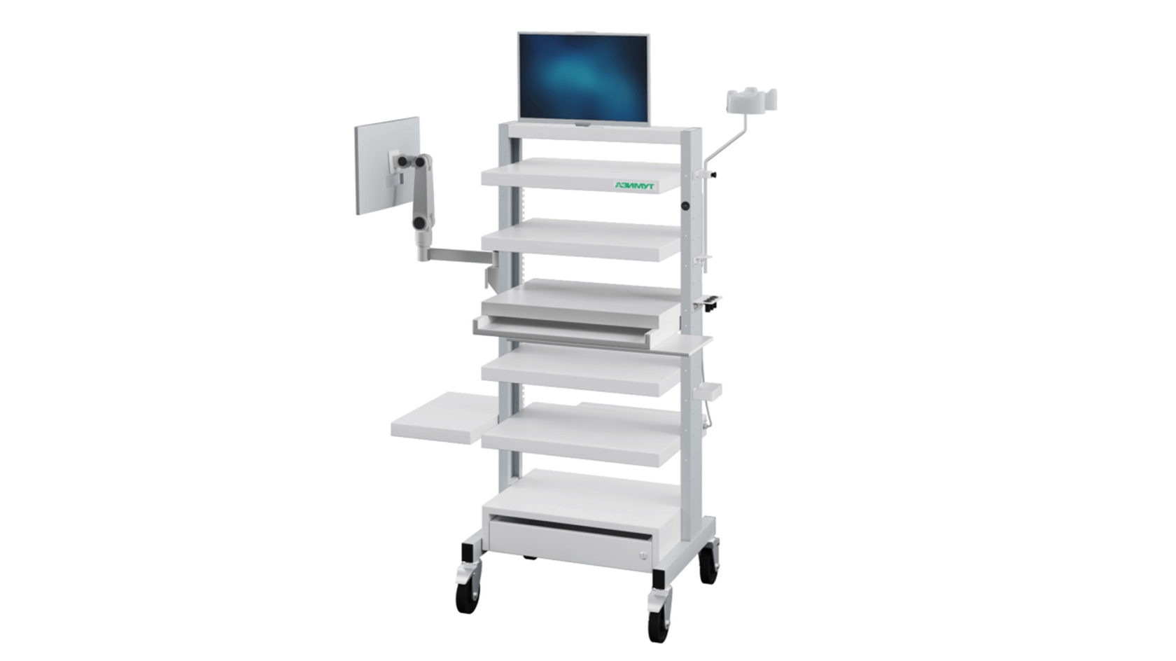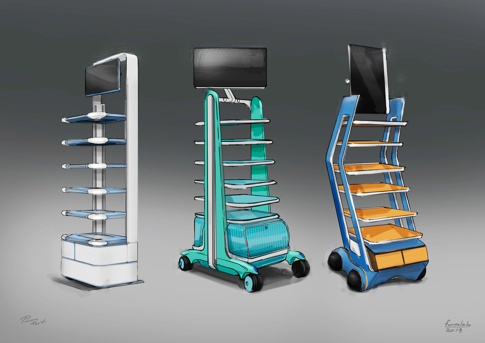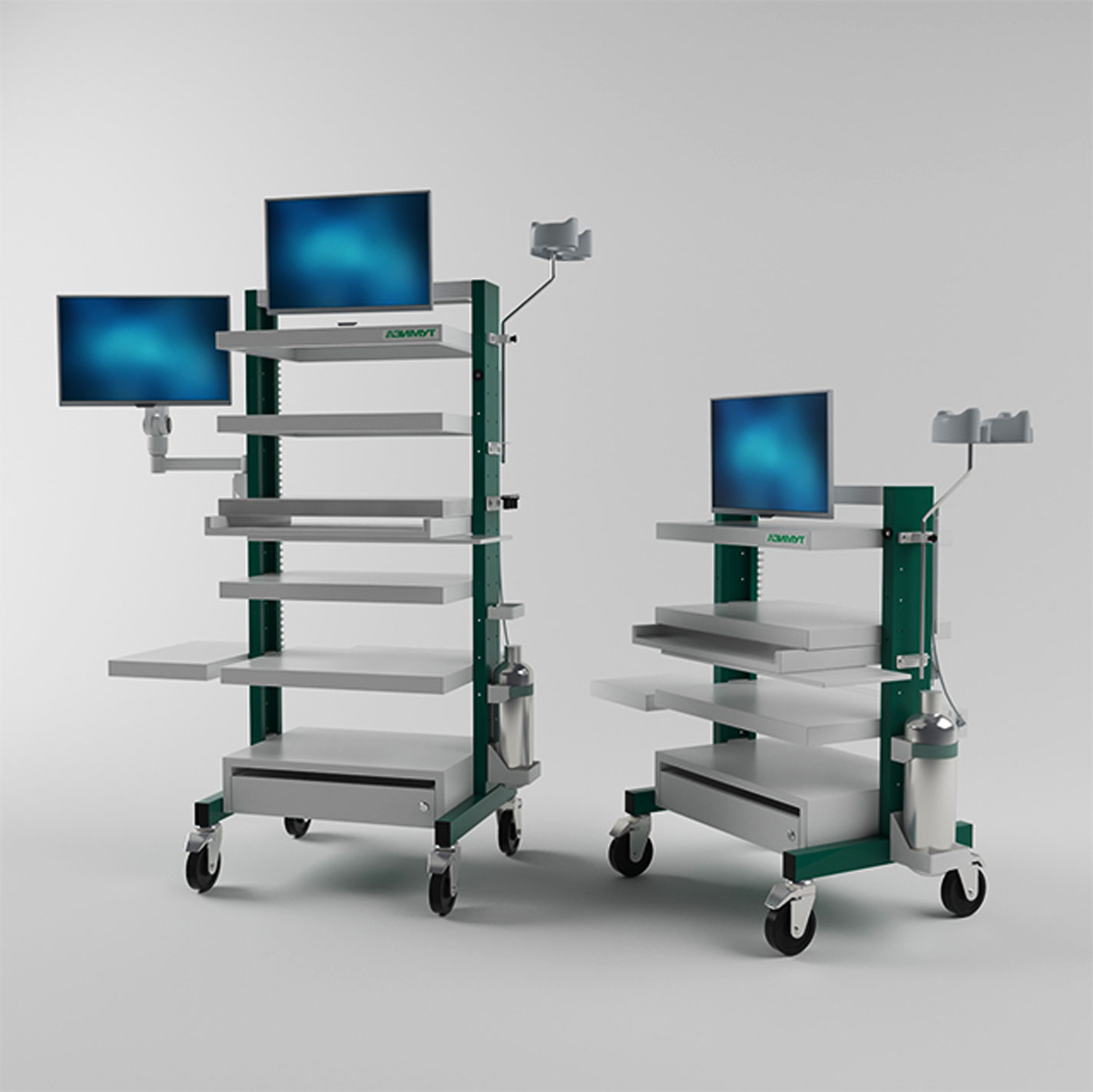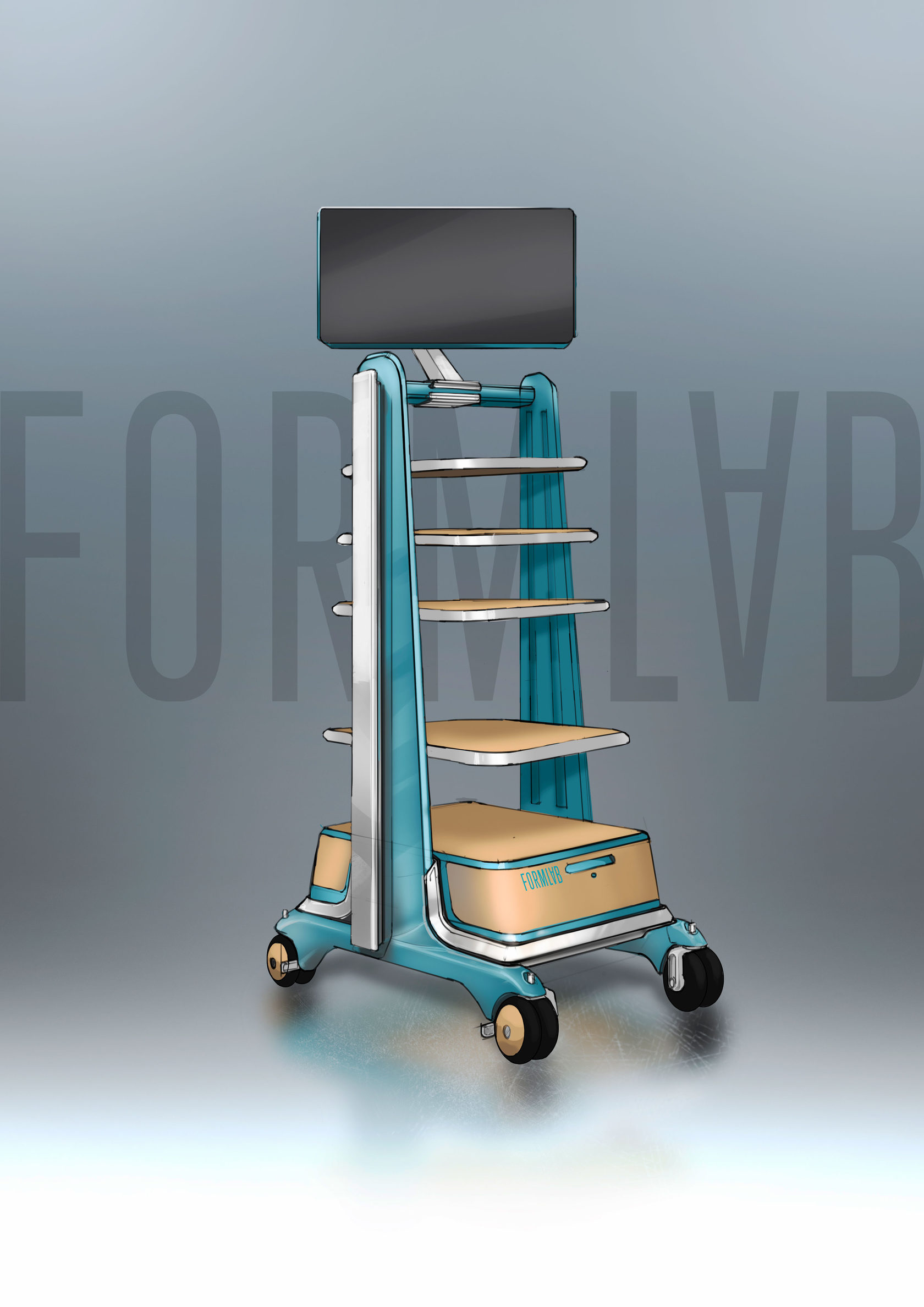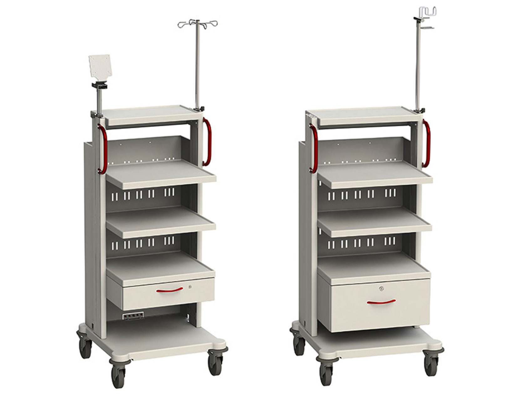 Нас ждёт обновление дизайна очень простой и одновременно сложной конструкции — металлической медицинской стойки. Простая она потому, что в её составе всего лишь пять полок и один ящик, рама, шасси с колёсами и два крепления — одно для монитора, другое — внешнее для медицинских ёмкостей.