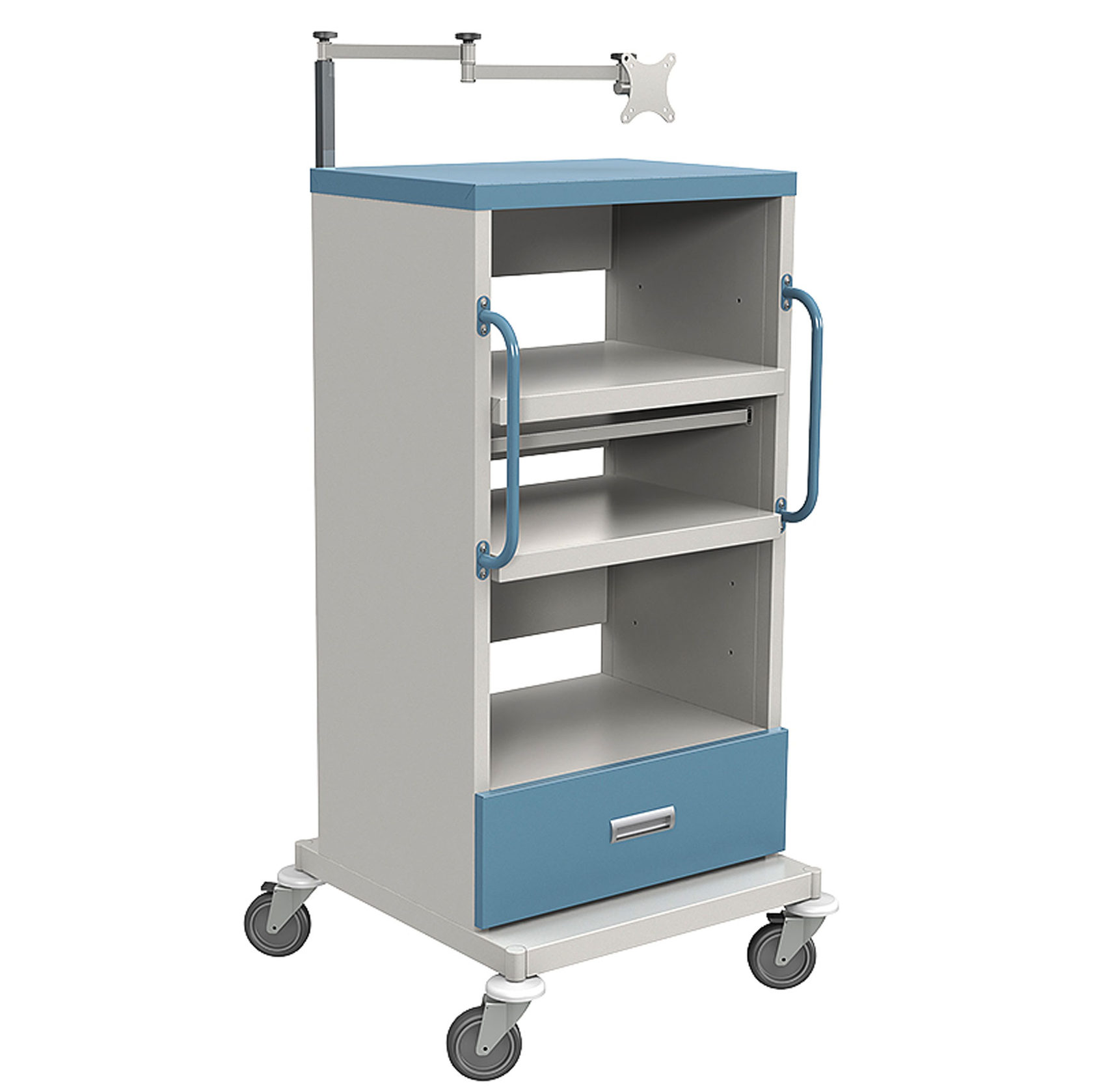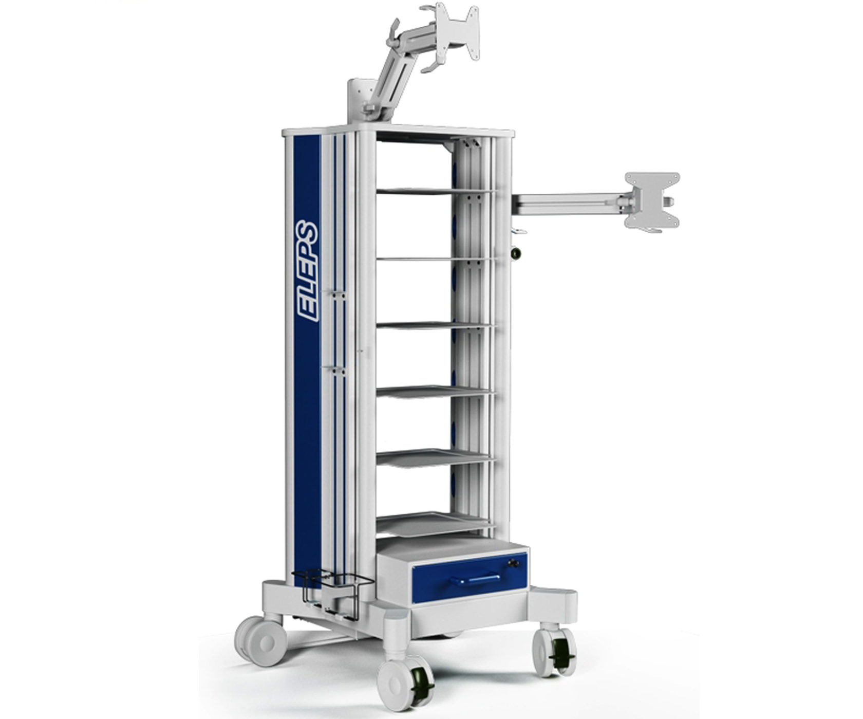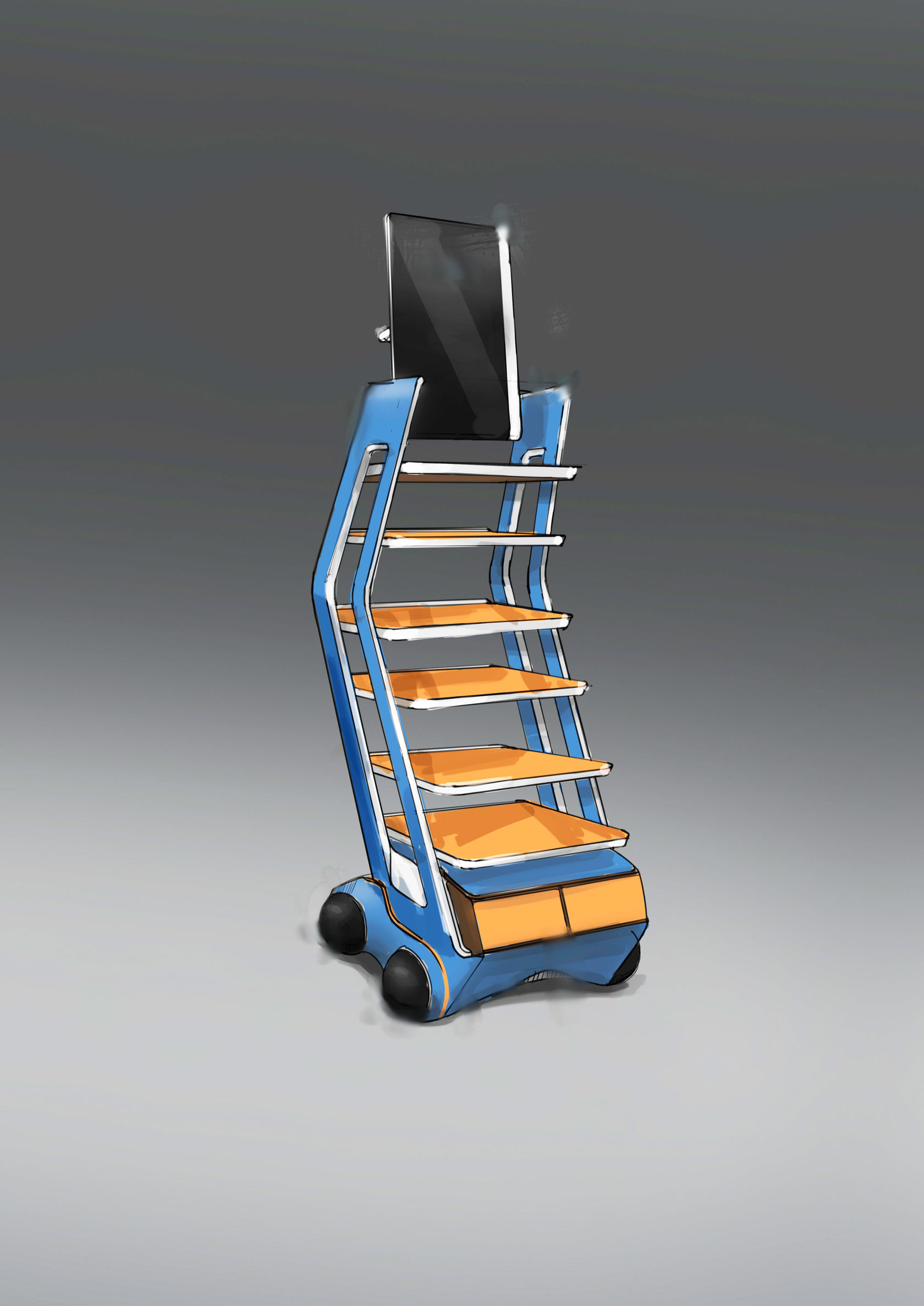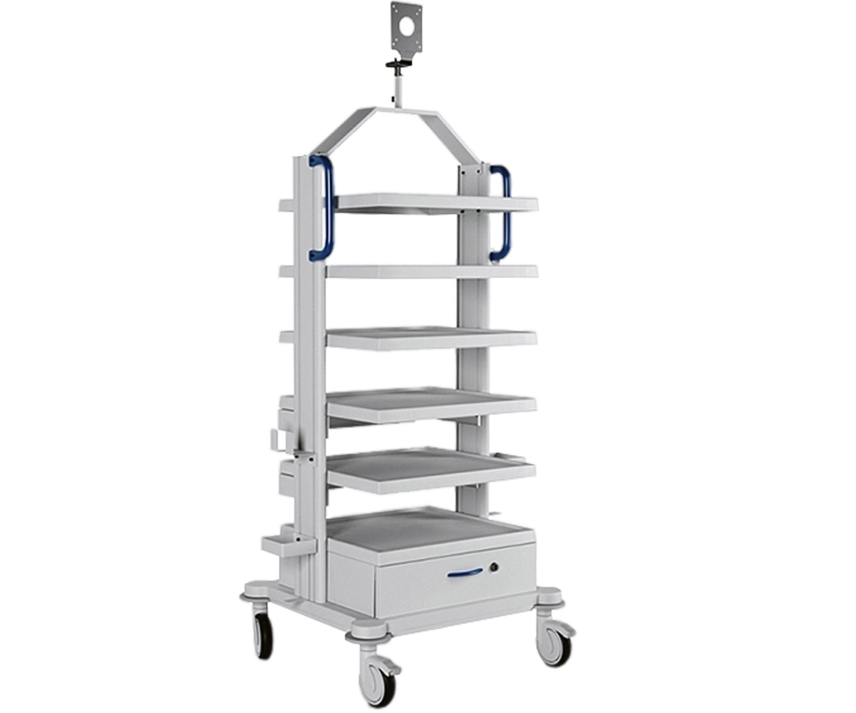 Нас ждёт обновление дизайна очень простой и одновременно сложной конструкции — металлической медицинской стойки. Простая она потому, что в её составе всего лишь пять полок и один ящик, рама, шасси с колёсами и два крепления — одно для монитора, другое — внешнее для медицинских ёмкостей.