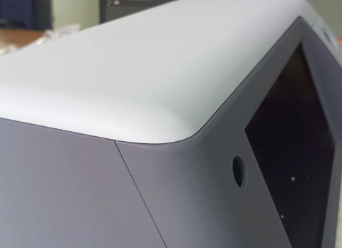 3. Заказчику показалось, что аппарат будет из глянцевого пластика. На самом деле как на эскизе, так и на прототипе у поверхности была мелкая матовая текстура (сатин). Она легко моется, не притягивает к себе грязь, на ней не остается ни следов от пальцев, ни мелких царапин А бонусом скрываются неизбежные дефекты поверхности, которые обусловлены несерийной технологией производства (прототип фрезеровался и красился).