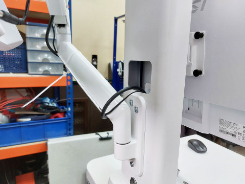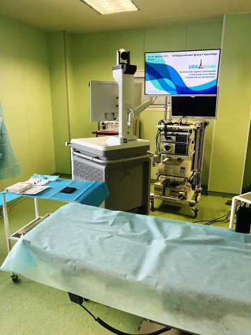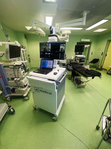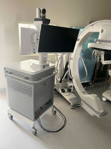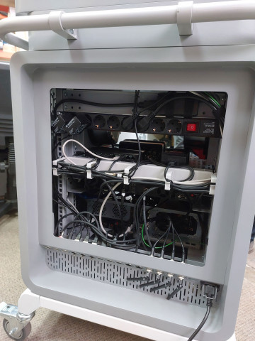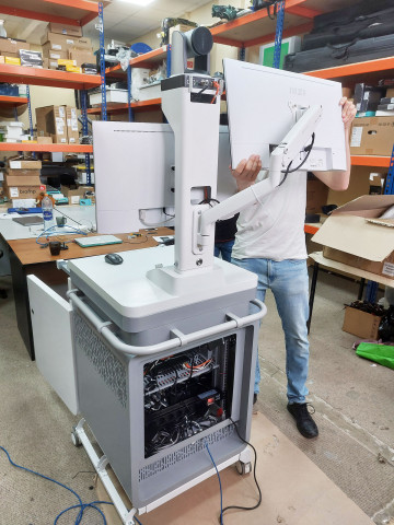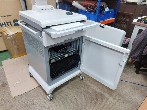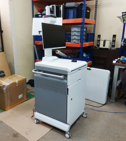 С помощью этой видеостойки обеспечивается прямая трансляция хирургических операций. На ней расположены не только два монитора с диагональю 24 дюйма, но также масса другого серверного оборудования, бесперебойник, камера, аудиомодуль и еще много чего. Видеостойку завозят в операционную (она перемещается на колесиках), устанавливают, усаживают за один монитор инженера — и все, можно начинать трансляцию. Люди, которые наблюдают за трансляцией, видят и слышат все, происходящее в операционной, а у хирургов и медперсонала под ногами не мешаются никакие кабели.