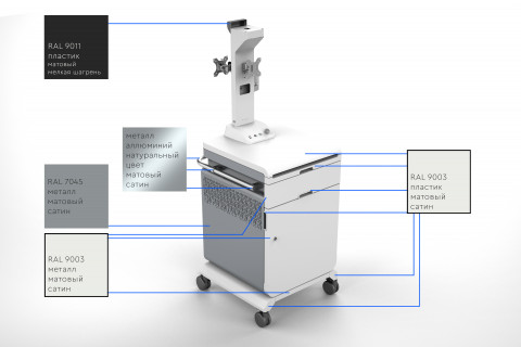 | Что нужно сделать? Задачи | 1. Корпус в ограниченных габаритах, рамная конструкция. 2. Модульная конструкция системы для оптимизации под индивидуальные потребности операционной. 3. Дизайн и качество исполнения — не хуже, чем у лидеров рынка медицинского оборудования. 4. Тормоза для колес тележки. 5. Съемные боковые стенки корпуса. 6. Продумать удобное расположение панели с элементами управления и разъемами, регулятором громкости — возле клавиатуры и чтобы доступ был спереди. 7. Вентиляционные отверстия в нижней и верхней частях стойки. 8. Состоящая из двух частей разборная конструкция, компактная и удобная для переноски и перевозки — даже в легковом авто с кузовом типа «универсал» или небольшом фургоне. 9. Скрытый подвод кабелей к мониторам. 10. Доступ внутрь корпуса для обслуживания и настройки отдельных компонентов. 11. Транспортировочные горизонтальные ручки 12. Съемная либо откидная колонна. 13. Ради безопасности исключить острые края и выпирающие углы. 14. Цвета в корпоративном стиле: белый, синий. 15. Качественные поверхности |