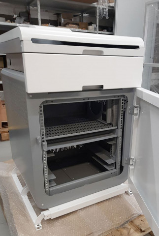 Аппарат сложный. В середине стойки размещен закрытый на ключ «коммутационный шкаф», где размещены ИБП, видеосервер, усилитель, радиосистема, гарнитура и прочая сложная начинка. Есть несколько полок, в том числе выдвижная полочка для влагозащищенных клавиатуры и мыши. Нужно продумать и то, как все удобно и компактно разместить, и как инженеру будет комфортно управлять трансляцией.