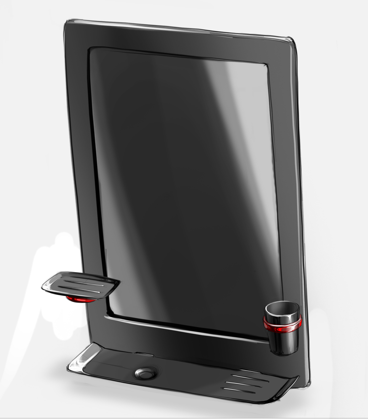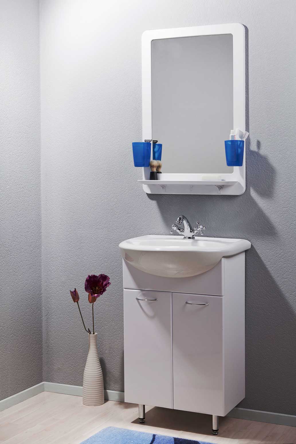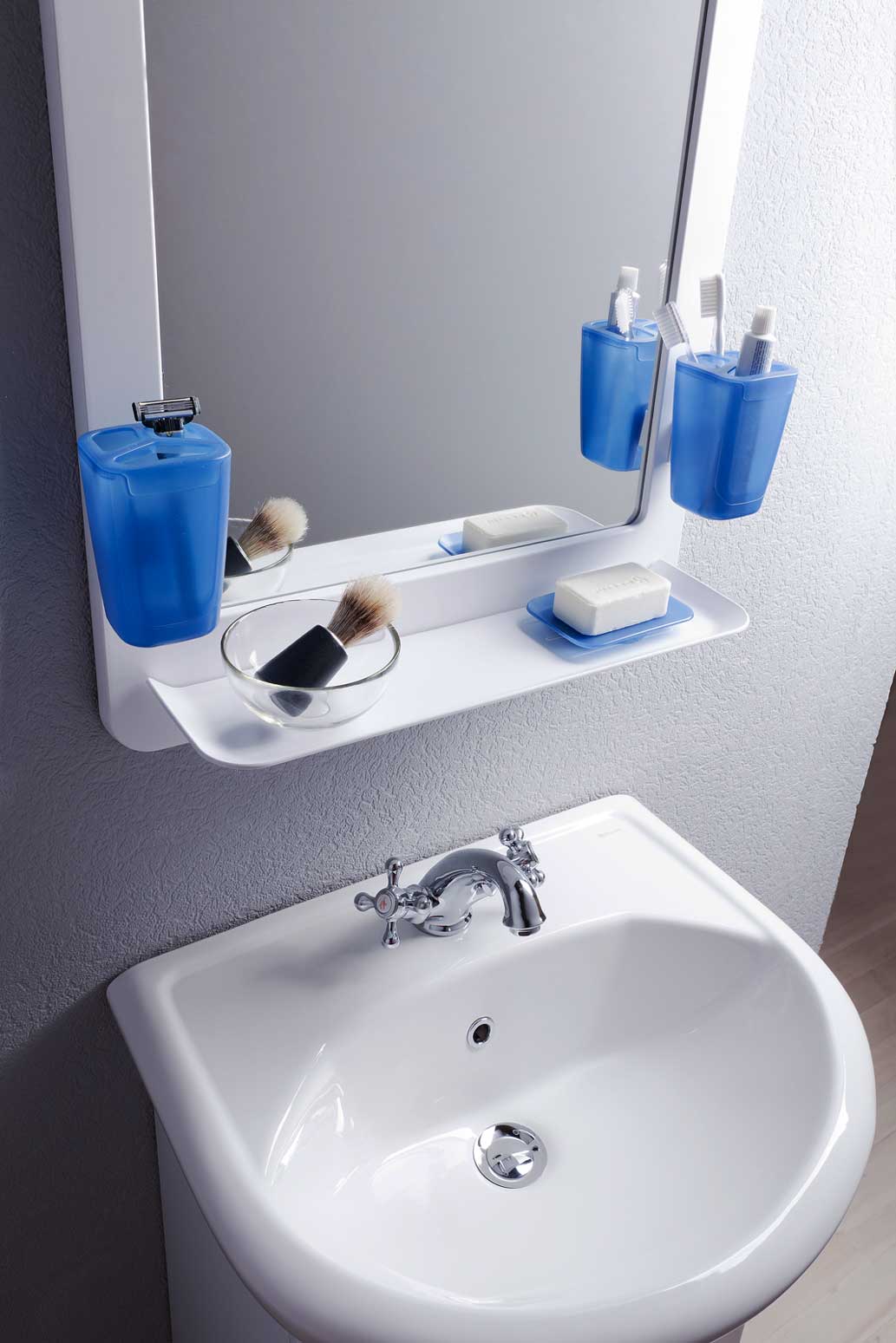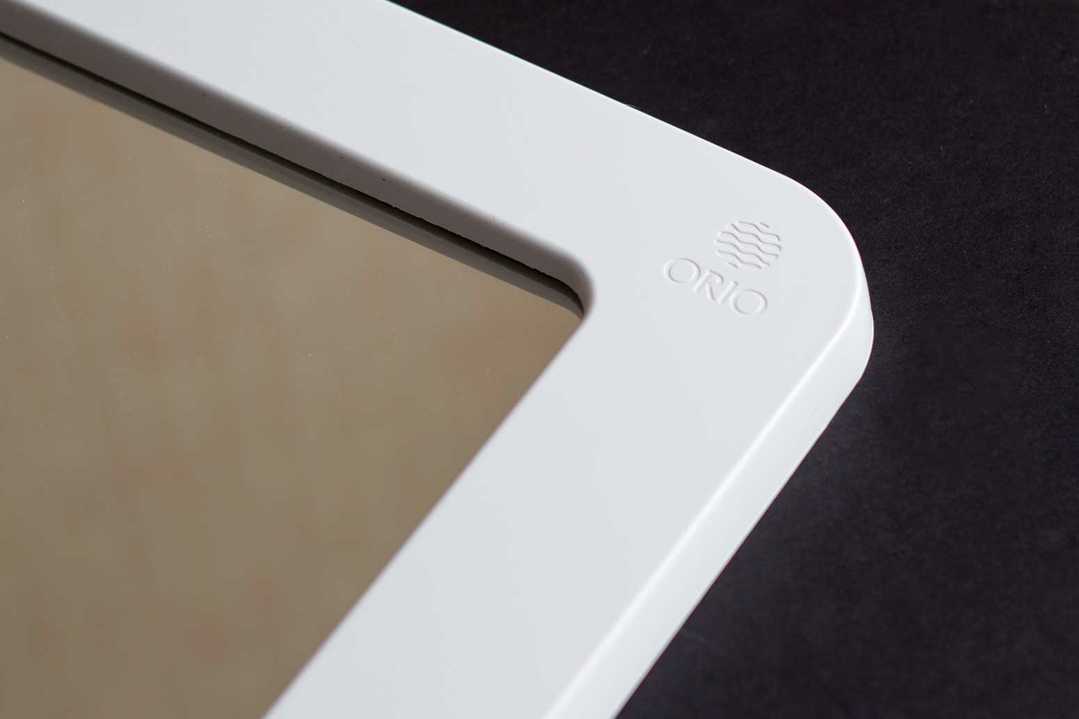 Проект, выполненный по заказу компании «Орио», подразумевал не только разработку дизайна набора аксессуаров с зеркалом для ванной комнаты, но и метода монтажа набора. А именно: сверлить отверстия в стене будущему покупателю придётся только для зеркала, а все остальные элементы (мыльница, стаканчики для зубных щёток) пусть будут жёстко закреплены на зеркальной раме.