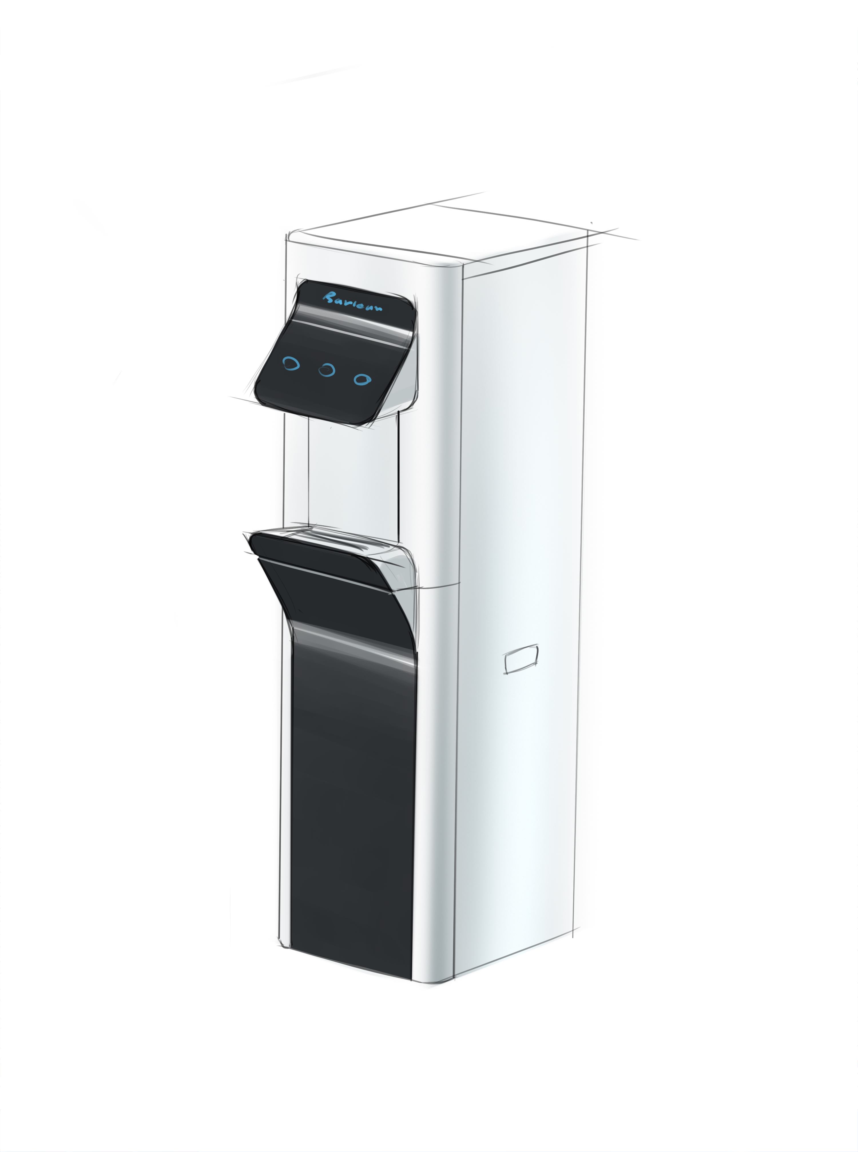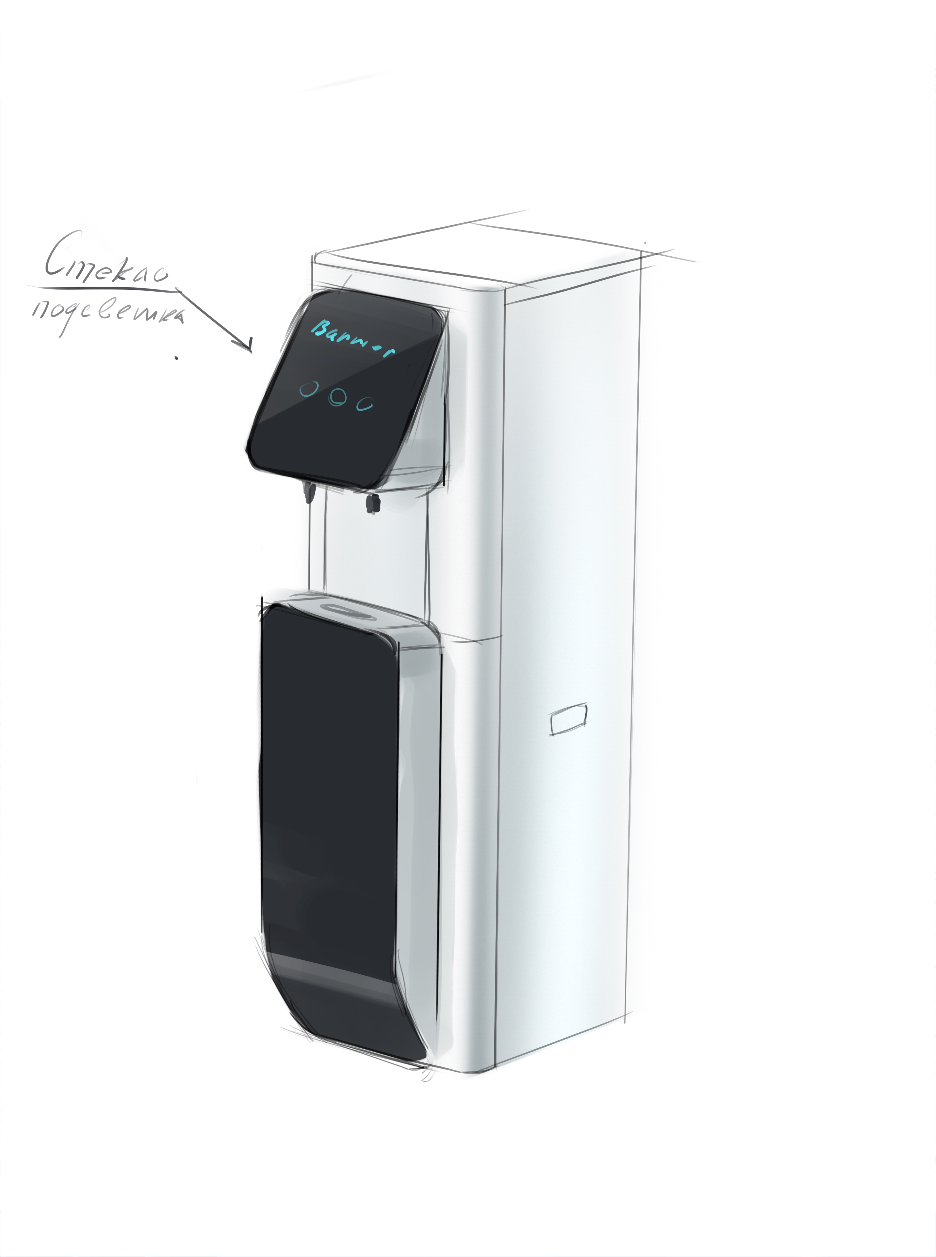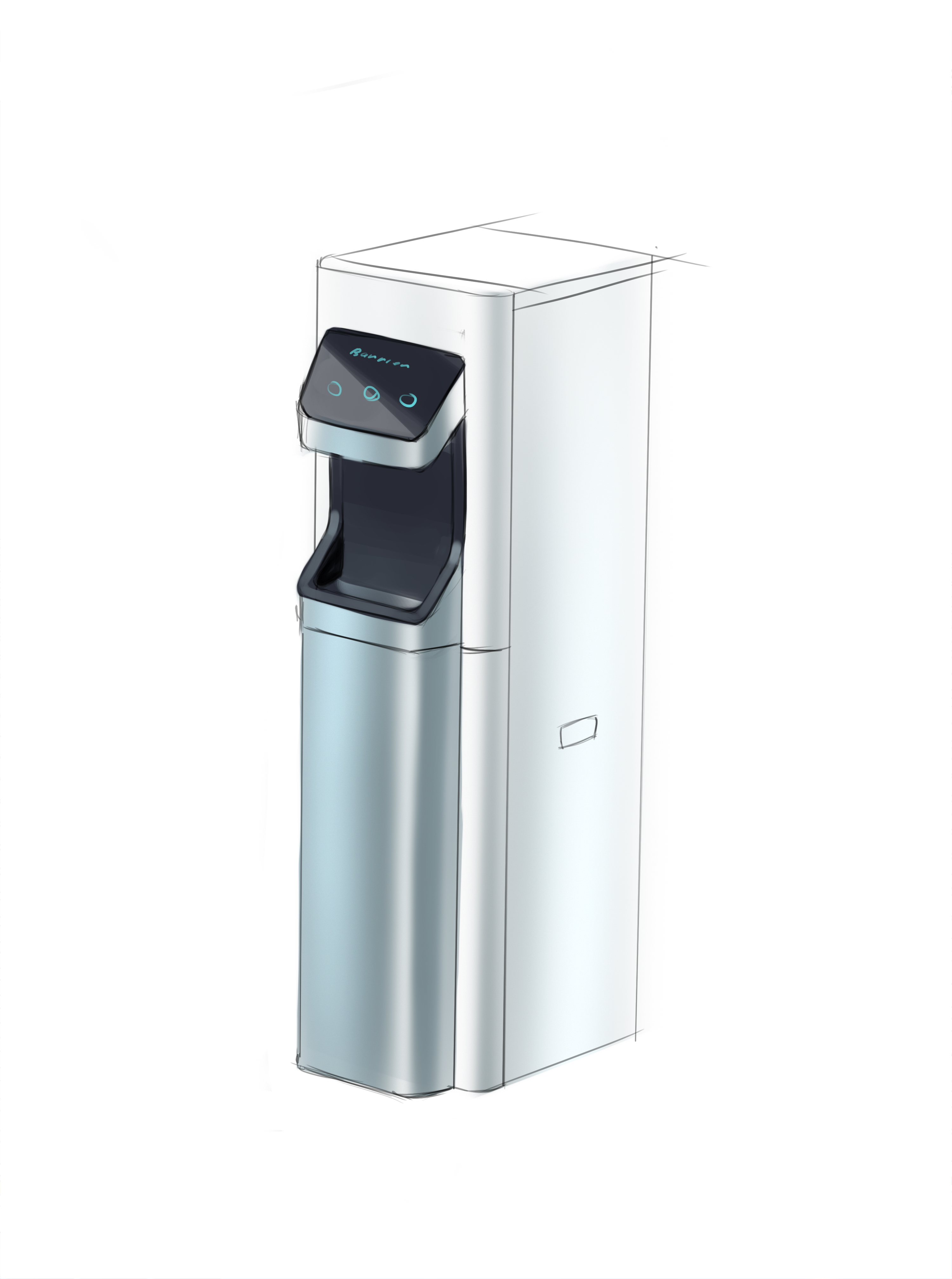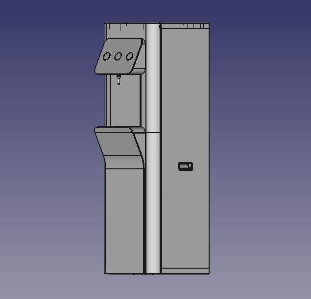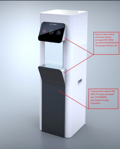 | Что нужно сделать? Задачи | 1. Взять за основу конструкцию корпуса старого пурифайера и на его базе разработать новую. 2. Сделать два концепт-дизайна — для панели из нержавеющей стали и из обычной стали (с последующей порошковой окраской). 3. Механизм налива горячей воды с защитой от детей. 4. Элементы управления на панели — либо антивандальная кнопка с RGB-подсветкой, либо сенсор выбора температуры воды. 5. Легкий и быстрый демонтаж передней панели для свободного доступа внутрь корпуса: вообще без использования инструментов. 6. Дизайн должен «сообщать» о том, что пурифайер относится к премиум-сегменту таких устройств. |