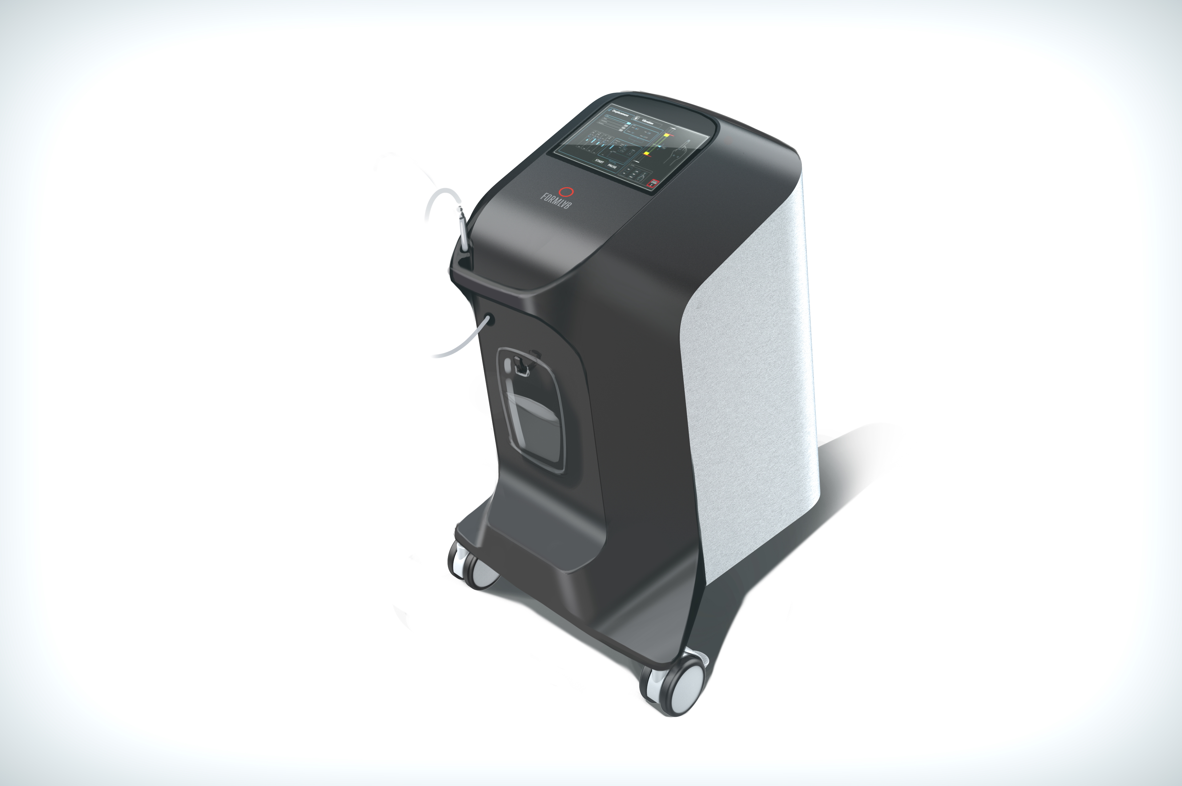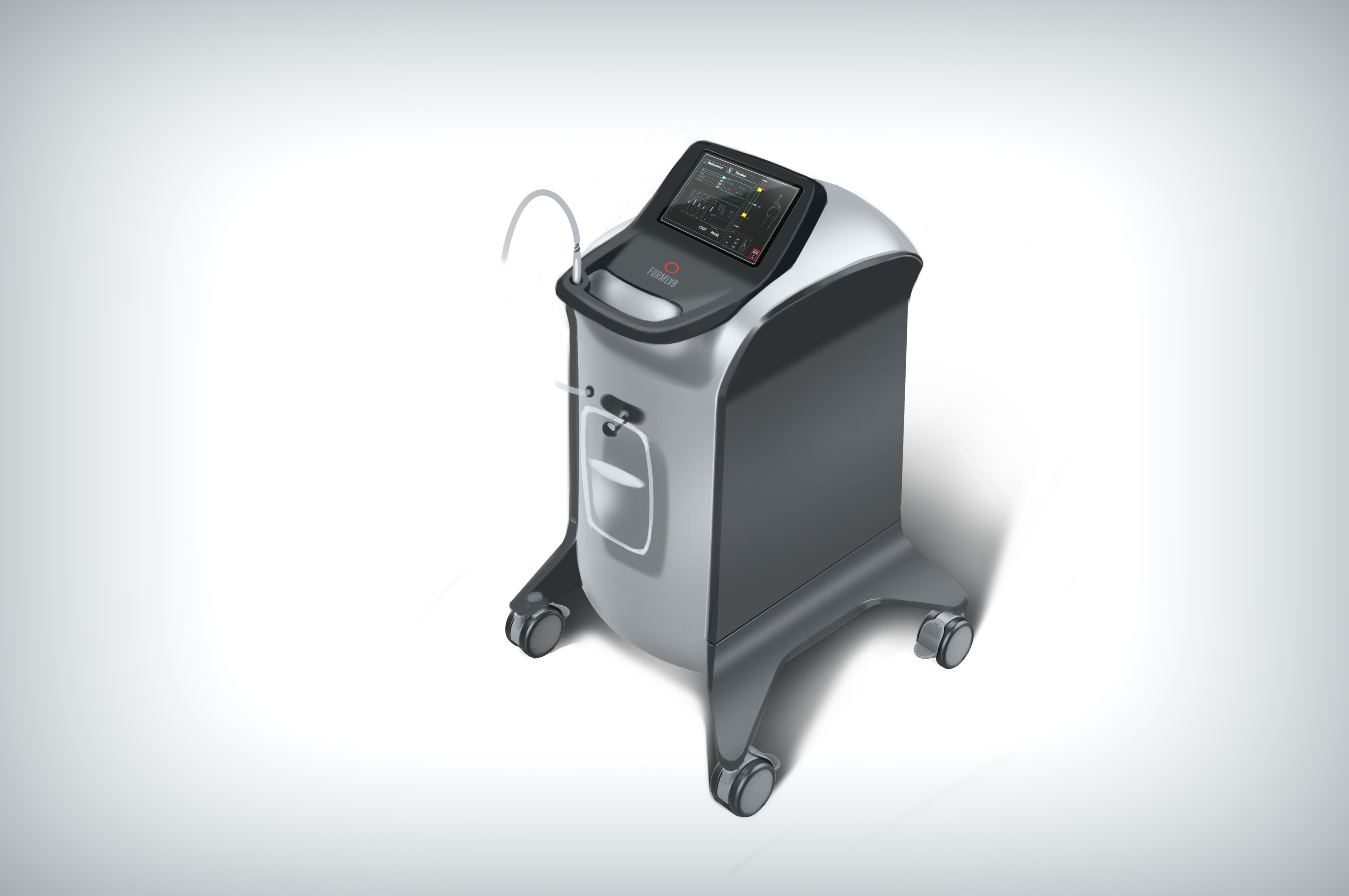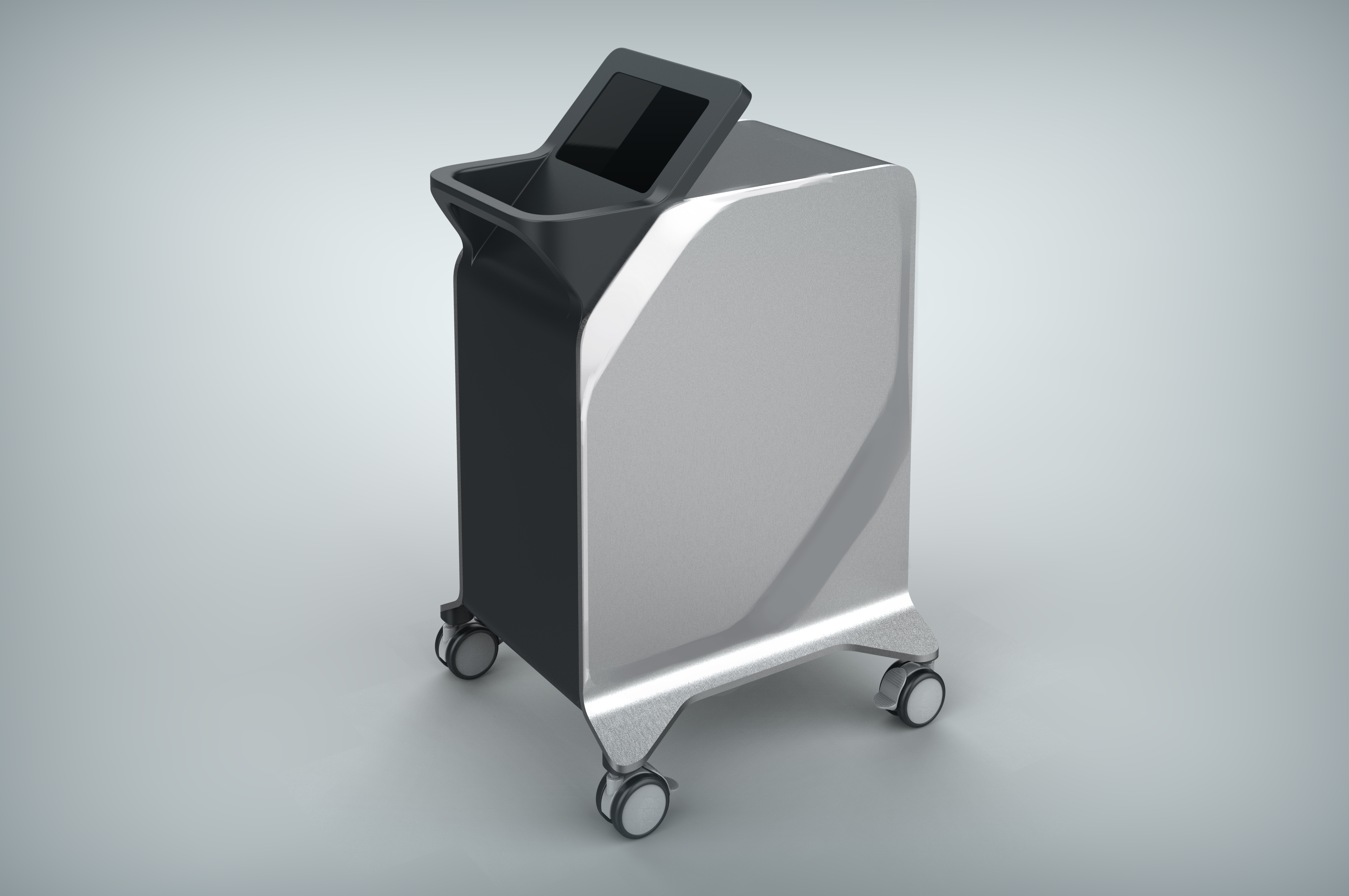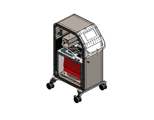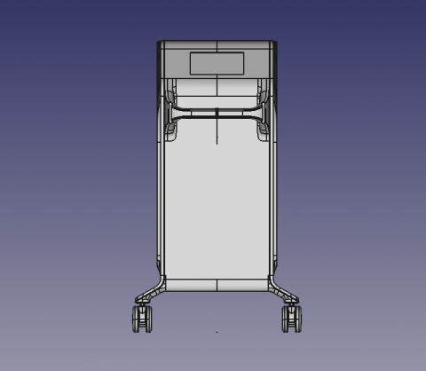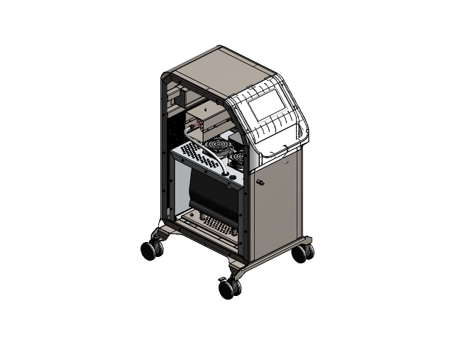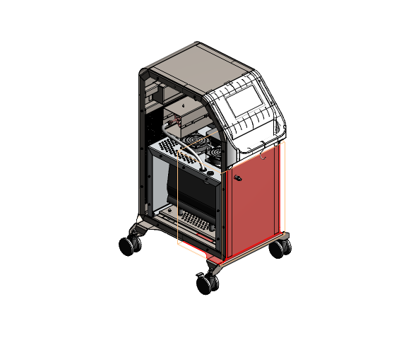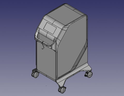 Делаем напольный корпус аппарата для косметической процедуры — жидкостного пилинга. Он работает как краскопульт с компрессором: последний подает под давлением воздух через пневмомагистрали в специальную насадку. Ею, собственно, и проводят процедуру; сам аппарат в это время стоит на полу рядом с врачом и управляется при помощи педали и дисплея.