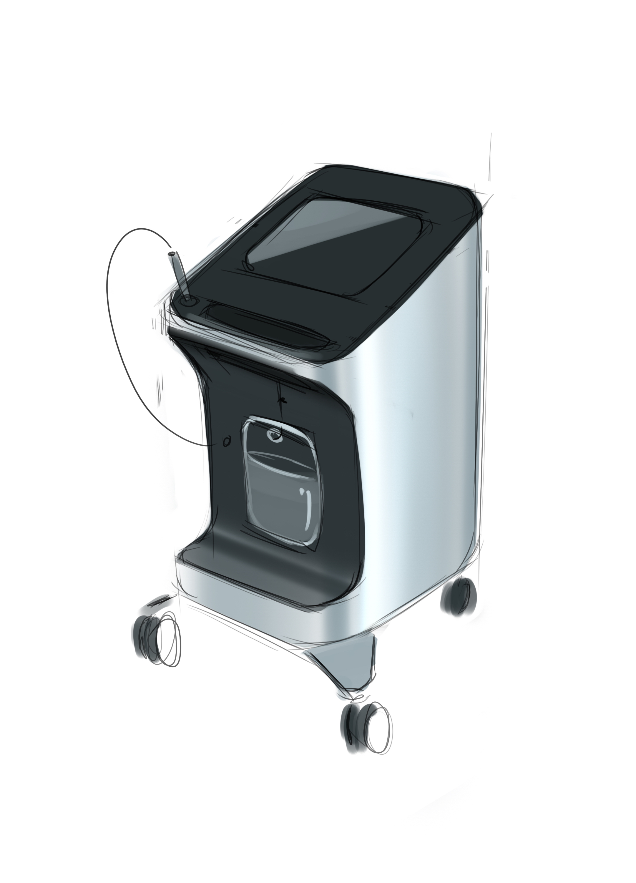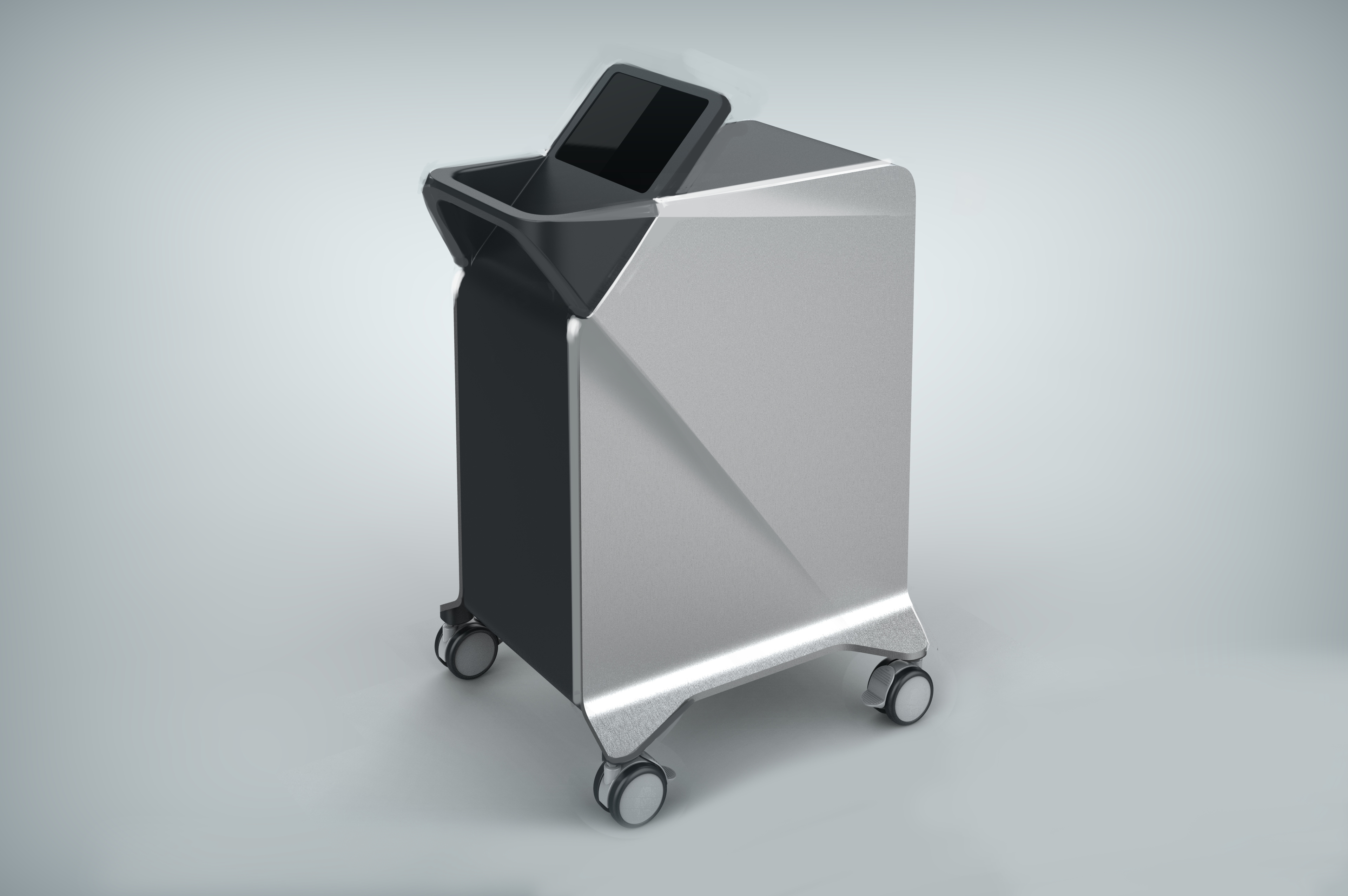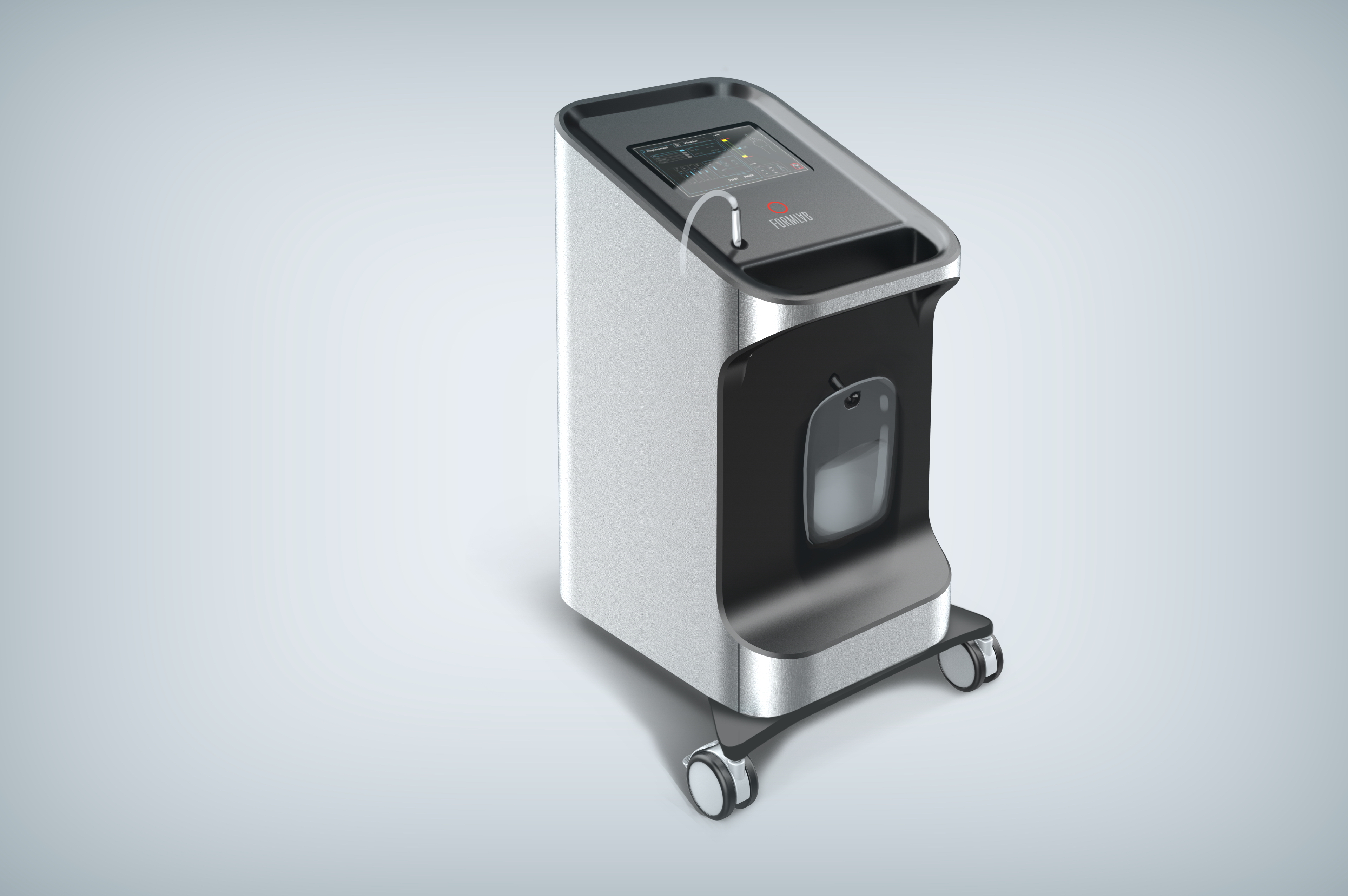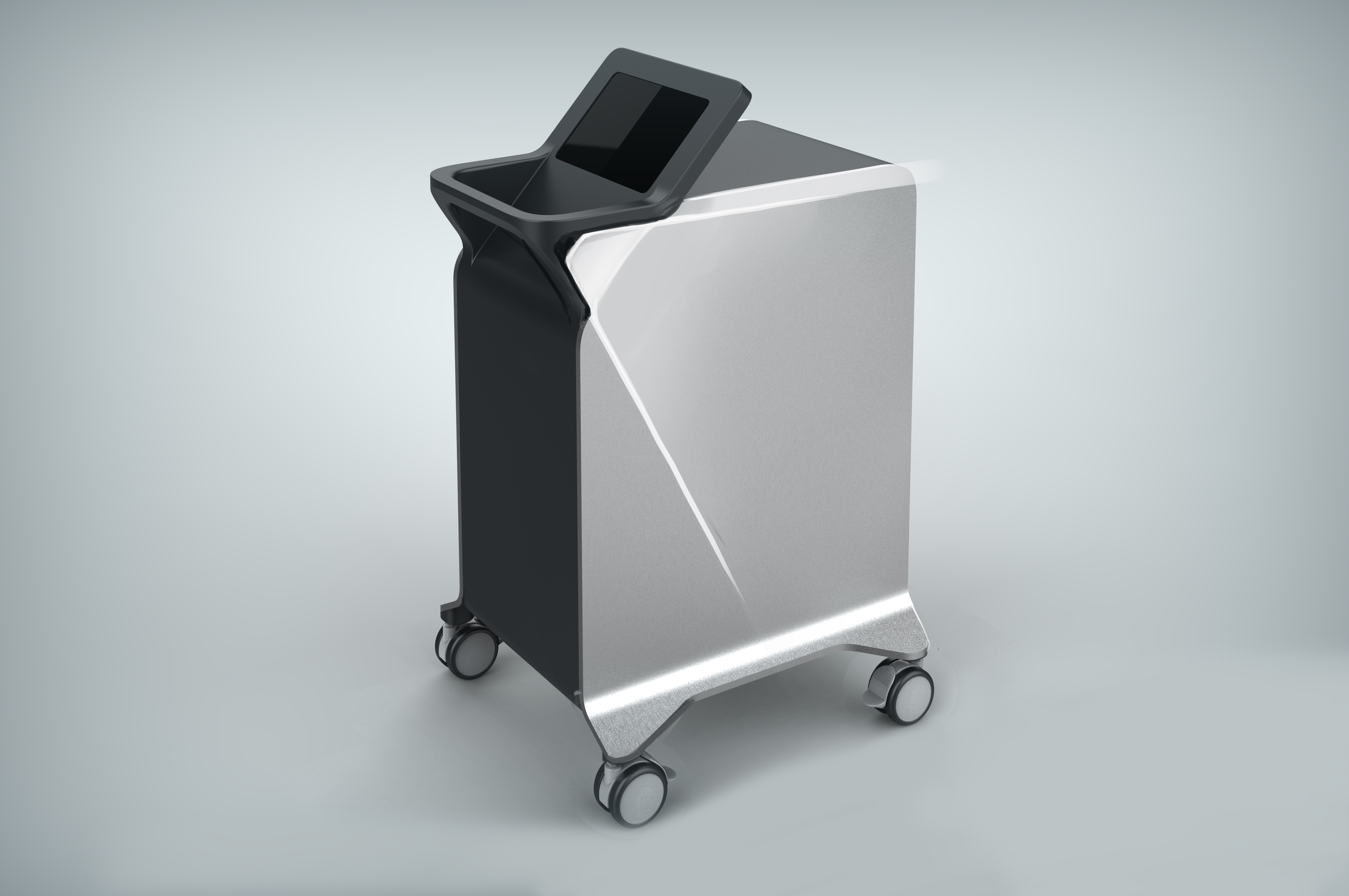 Делаем напольный корпус аппарата для косметической процедуры — жидкостного пилинга. Он работает как краскопульт с компрессором: последний подает под давлением воздух через пневмомагистрали в специальную насадку. Ею, собственно, и проводят процедуру; сам аппарат в это время стоит на полу рядом с врачом и управляется при помощи педали и дисплея.
