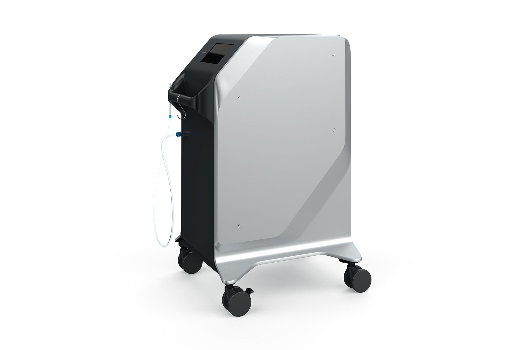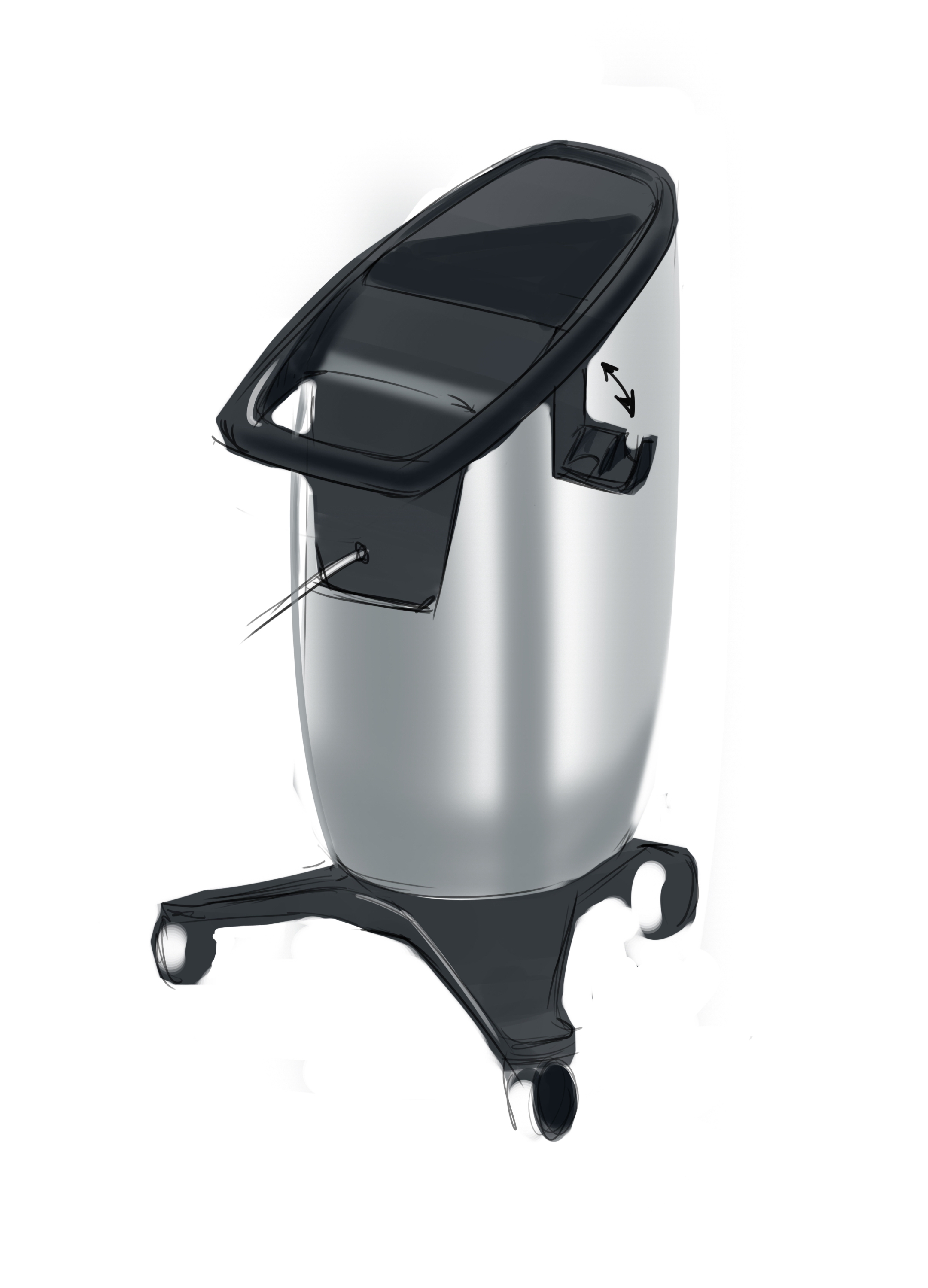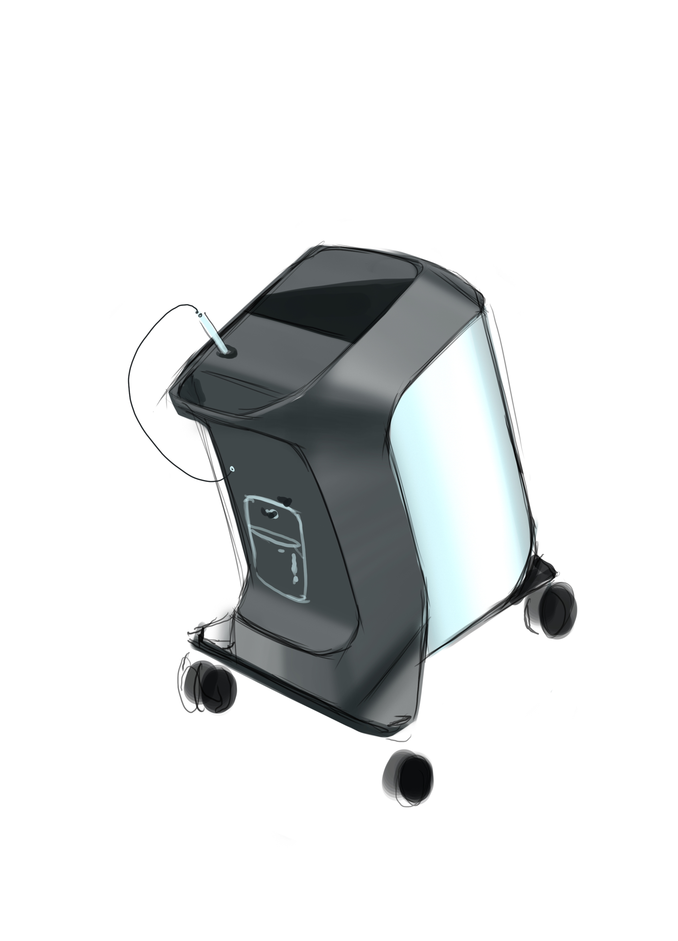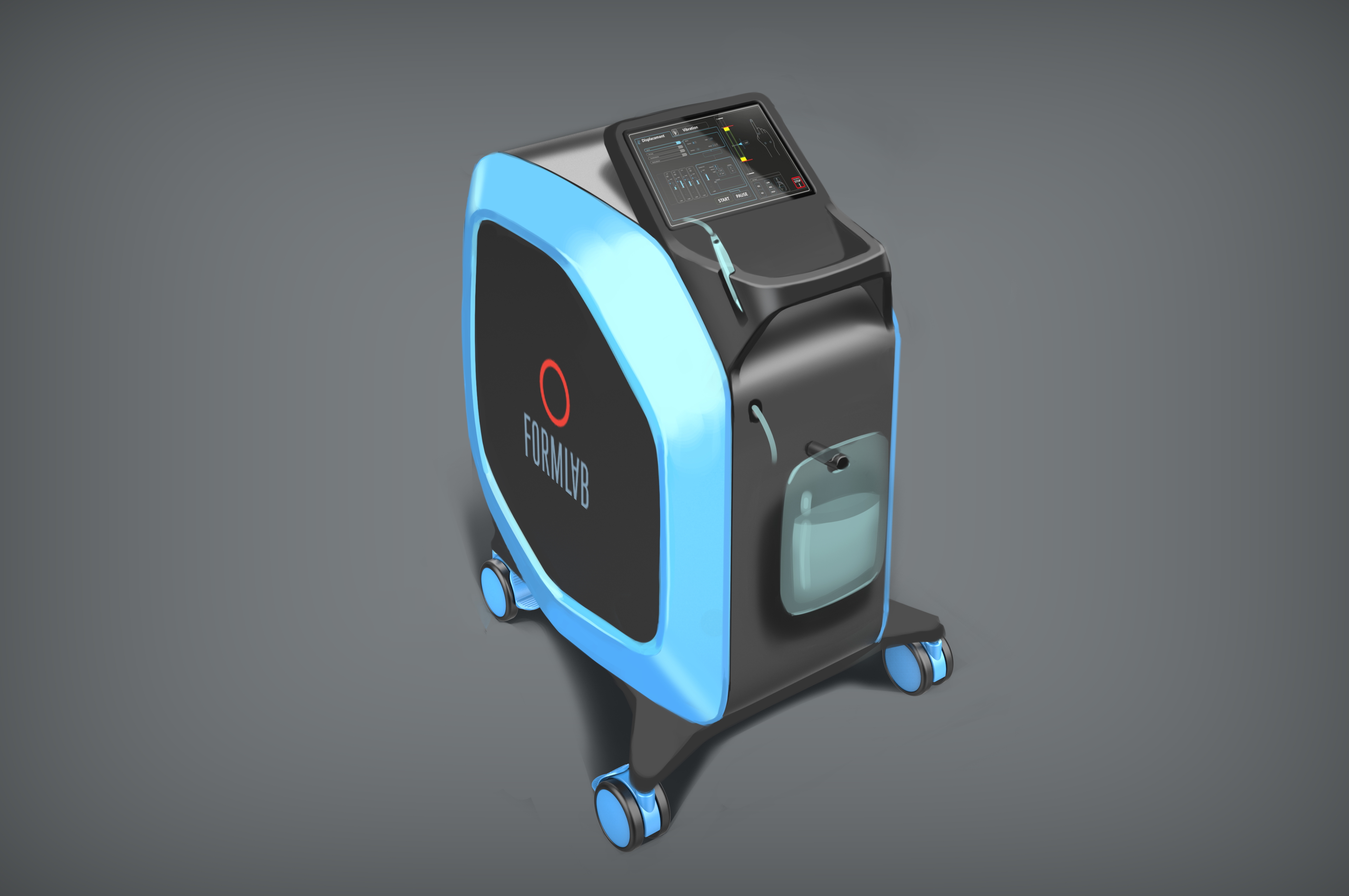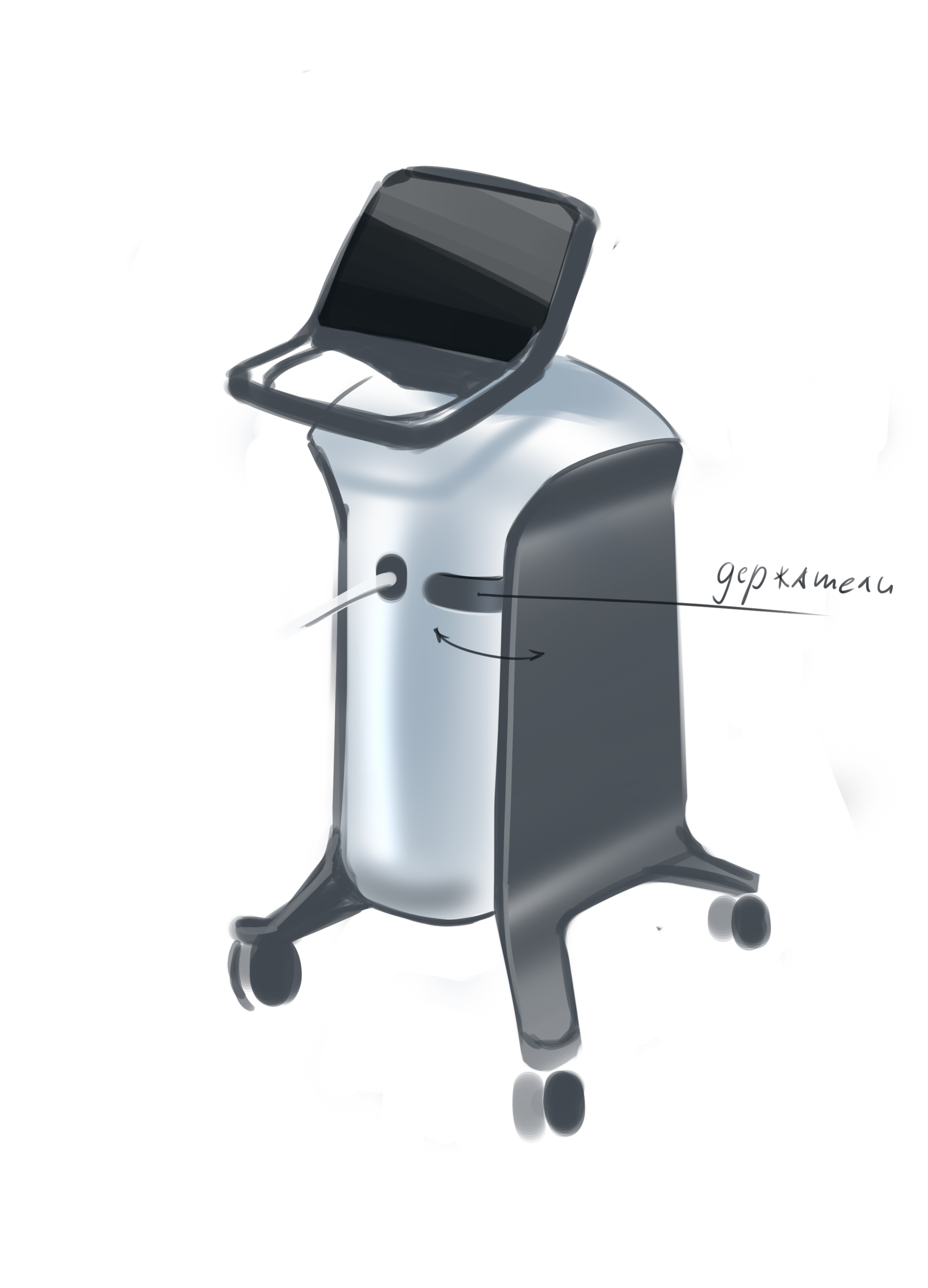 Делаем напольный корпус аппарата для косметической процедуры — жидкостного пилинга. Он работает как краскопульт с компрессором: последний подает под давлением воздух через пневмомагистрали в специальную насадку. Ею, собственно, и проводят процедуру; сам аппарат в это время стоит на полу рядом с врачом и управляется при помощи педали и дисплея.
