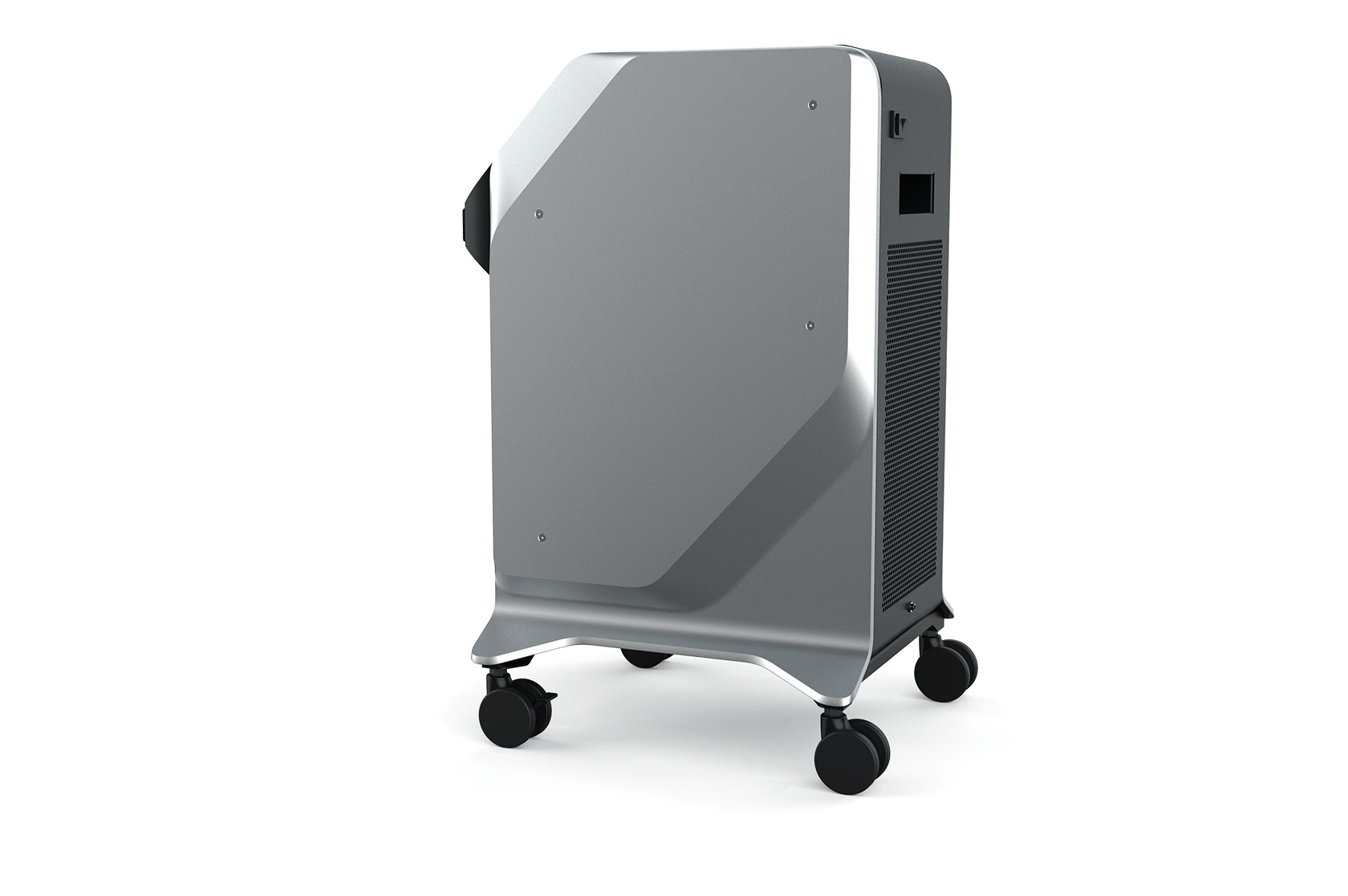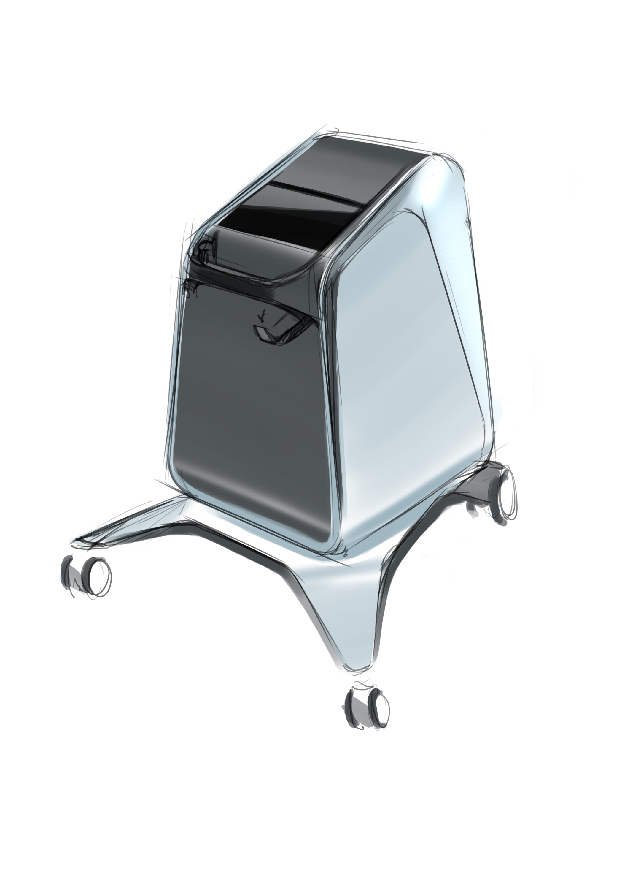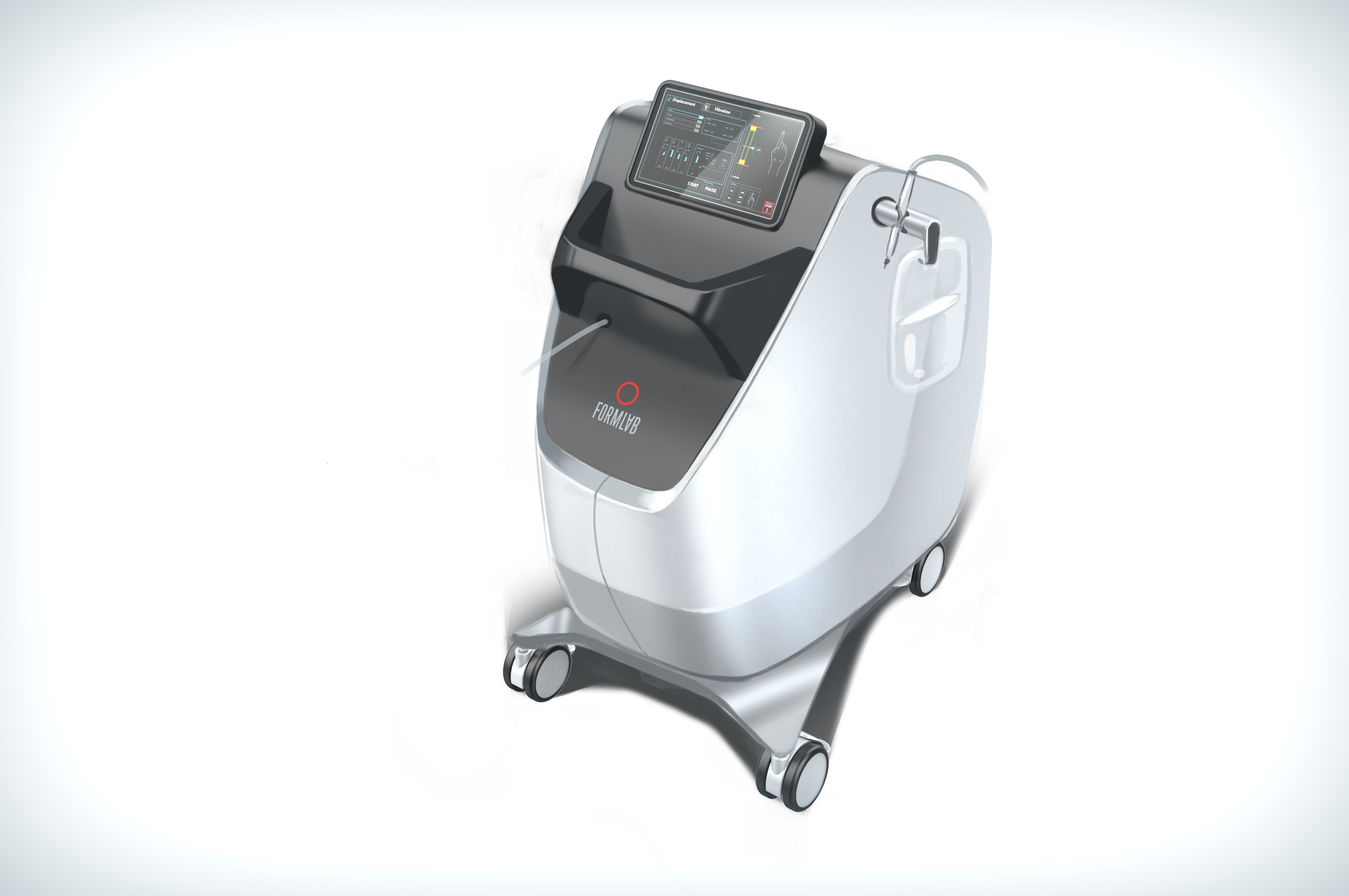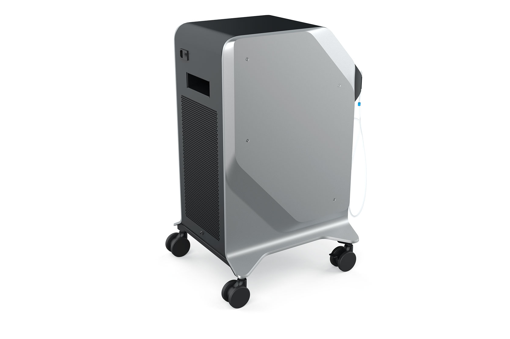 Делаем напольный корпус аппарата для косметической процедуры — жидкостного пилинга. Он работает как краскопульт с компрессором: последний подает под давлением воздух через пневмомагистрали в специальную насадку. Ею, собственно, и проводят процедуру; сам аппарат в это время стоит на полу рядом с врачом и управляется при помощи педали и дисплея.