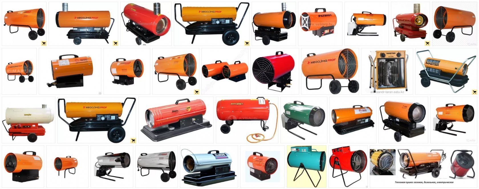 Дизайн обычного калорифера «завязан» на нагревательную часть: на металлическую раму (с колёсиками или без) закрепляют корпус обогревателя и топливный бак из металла.