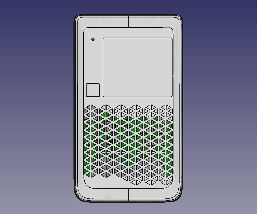 Исключительно для проверки эргономики корпуса распечатали макет. Не зря распечатали: выяснилось, что углы верхней половинки корпуса врезаются в ладонь, нужно было это исправить. И неплохо было бы немного сдвинуть дисплей. И изменить отверстия возле камер…